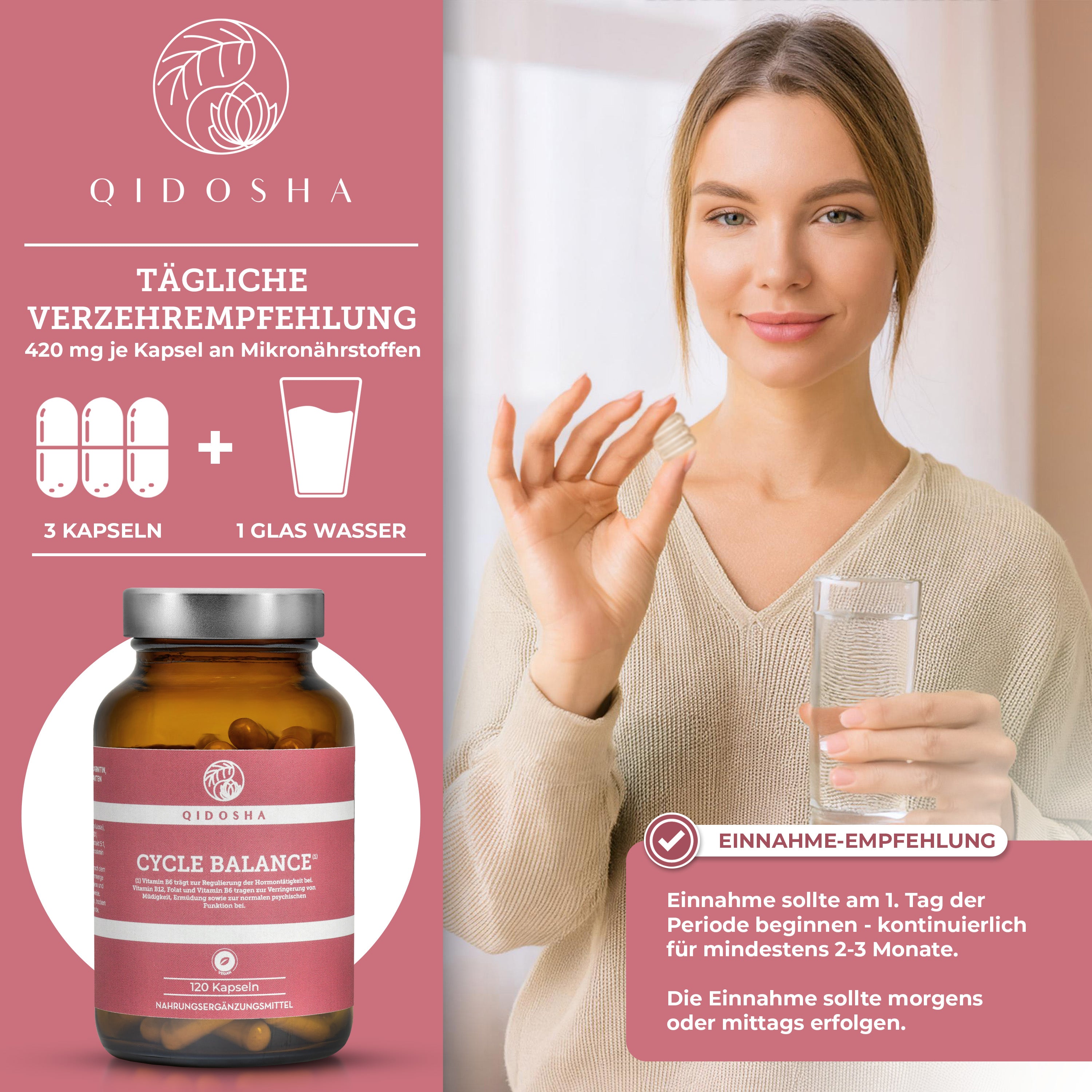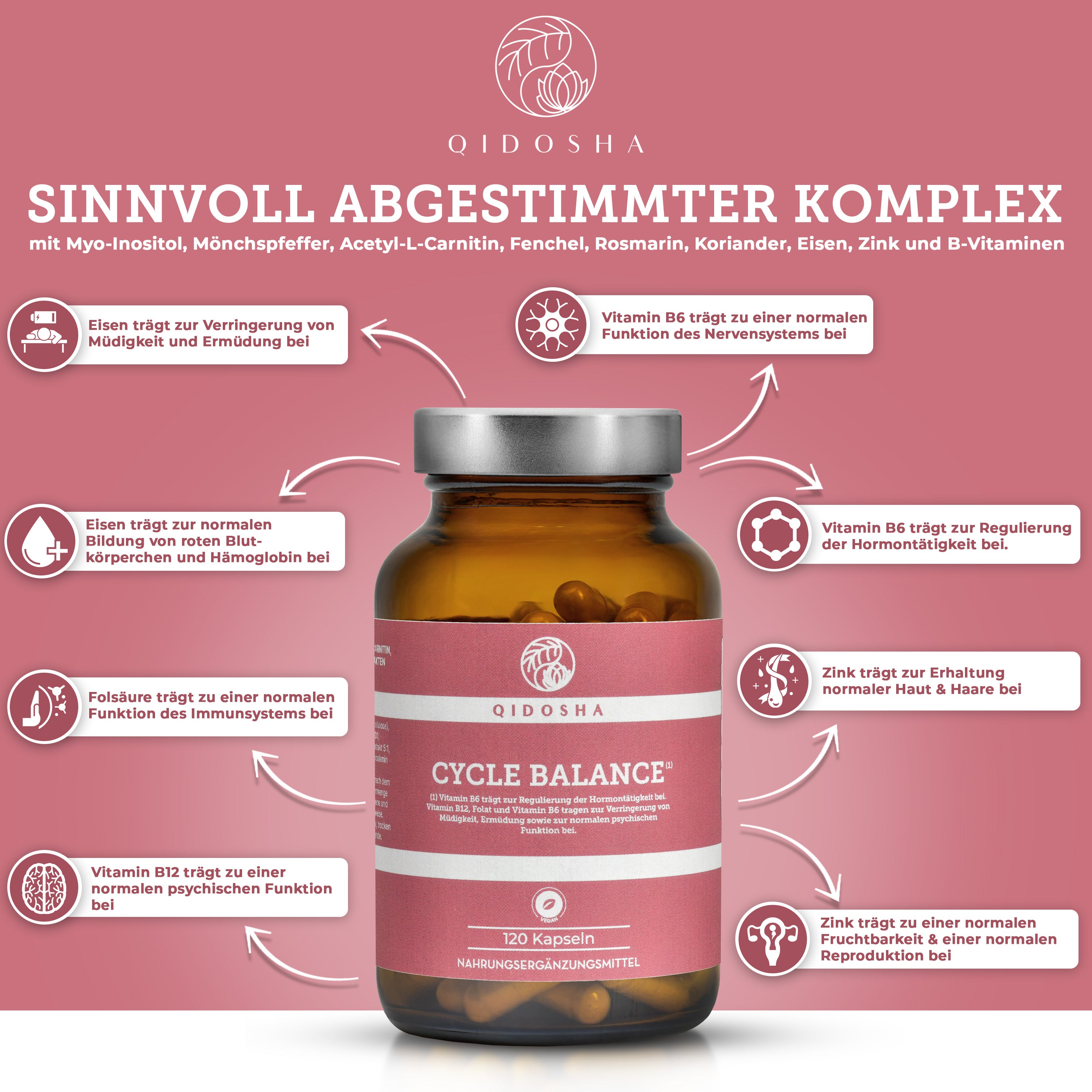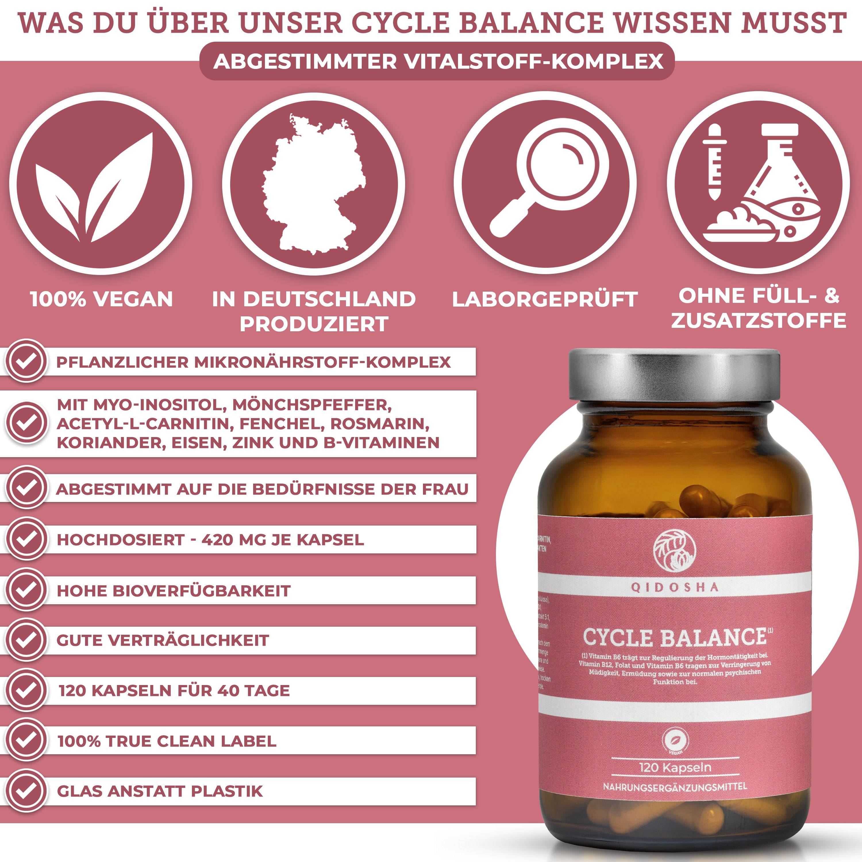 CYCLE BALANCE im Glas: Premium, laborgeprüfte Nahrungsergänzung von QIDOSHA, vegan und ohne Zusatzstoffe, unterstützt durch B-Vitamine die Hormonregulierung und Reduktion von Müdigkeit.