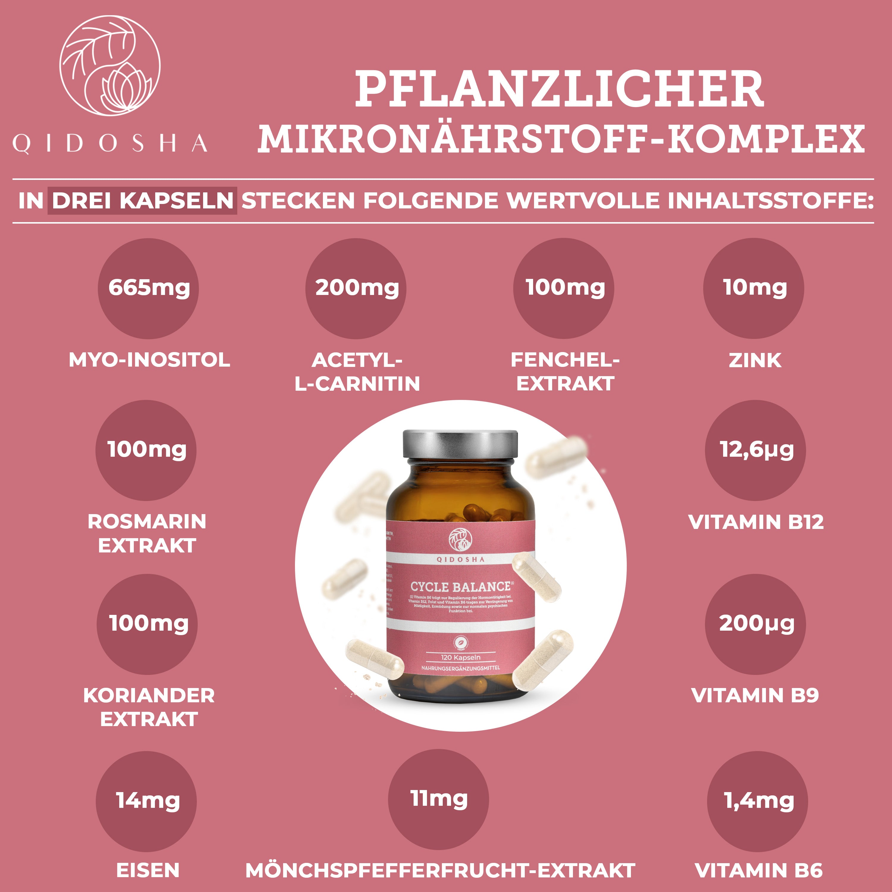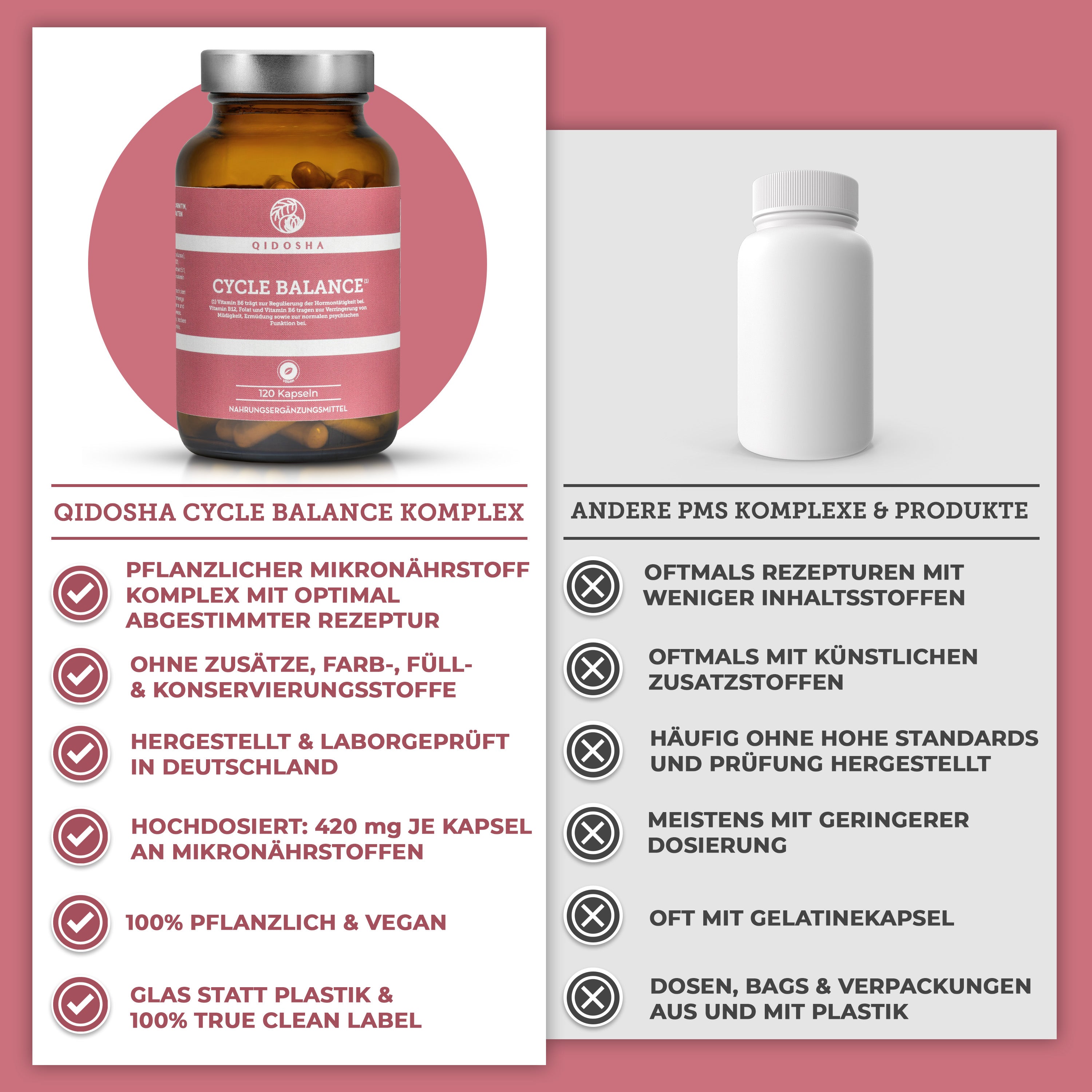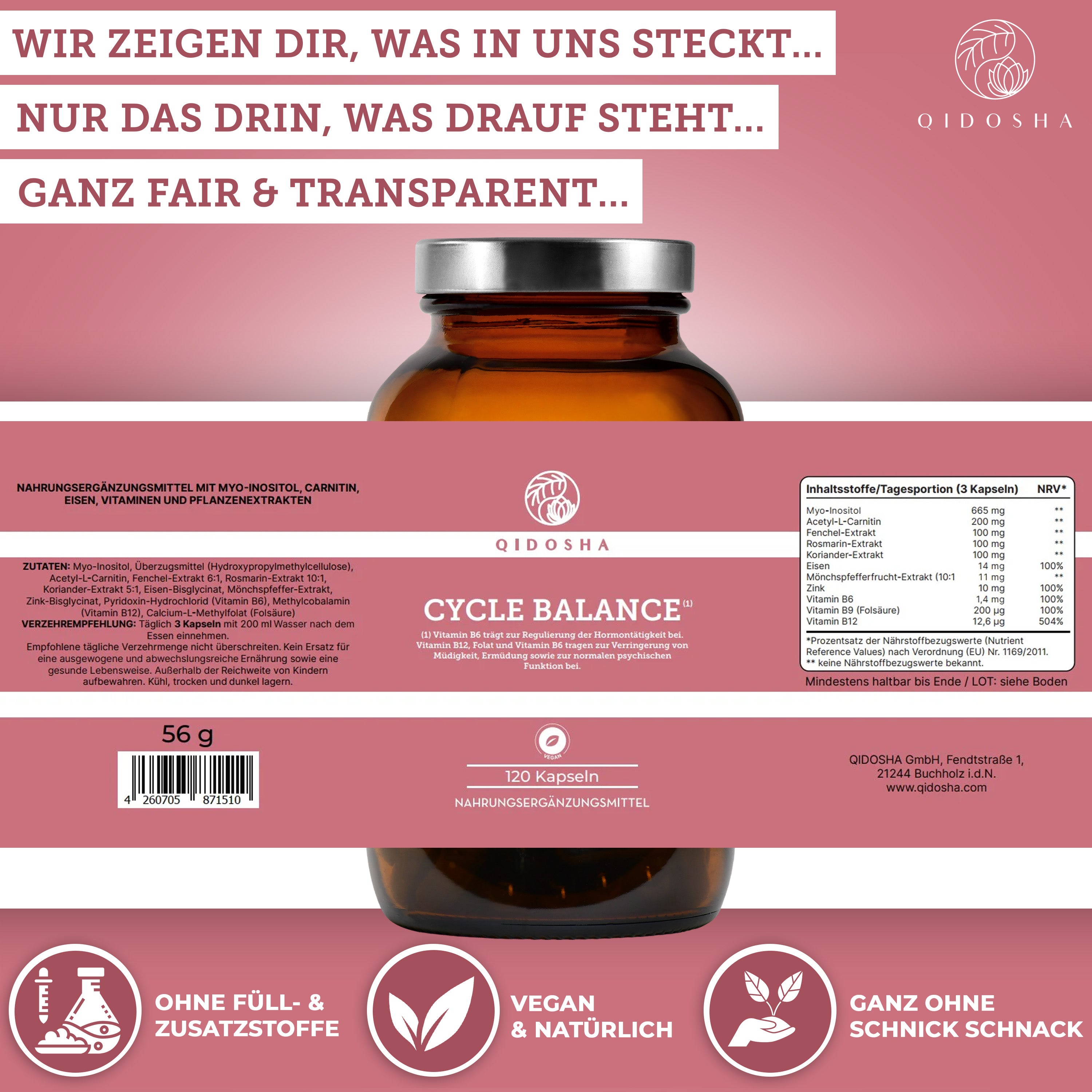 CYCLE BALANCE im Glas: Premium, laborgeprüfte Nahrungsergänzung von QIDOSHA, vegan und ohne Zusatzstoffe, unterstützt durch B-Vitamine die Hormonregulierung und Reduktion von Müdigkeit.
