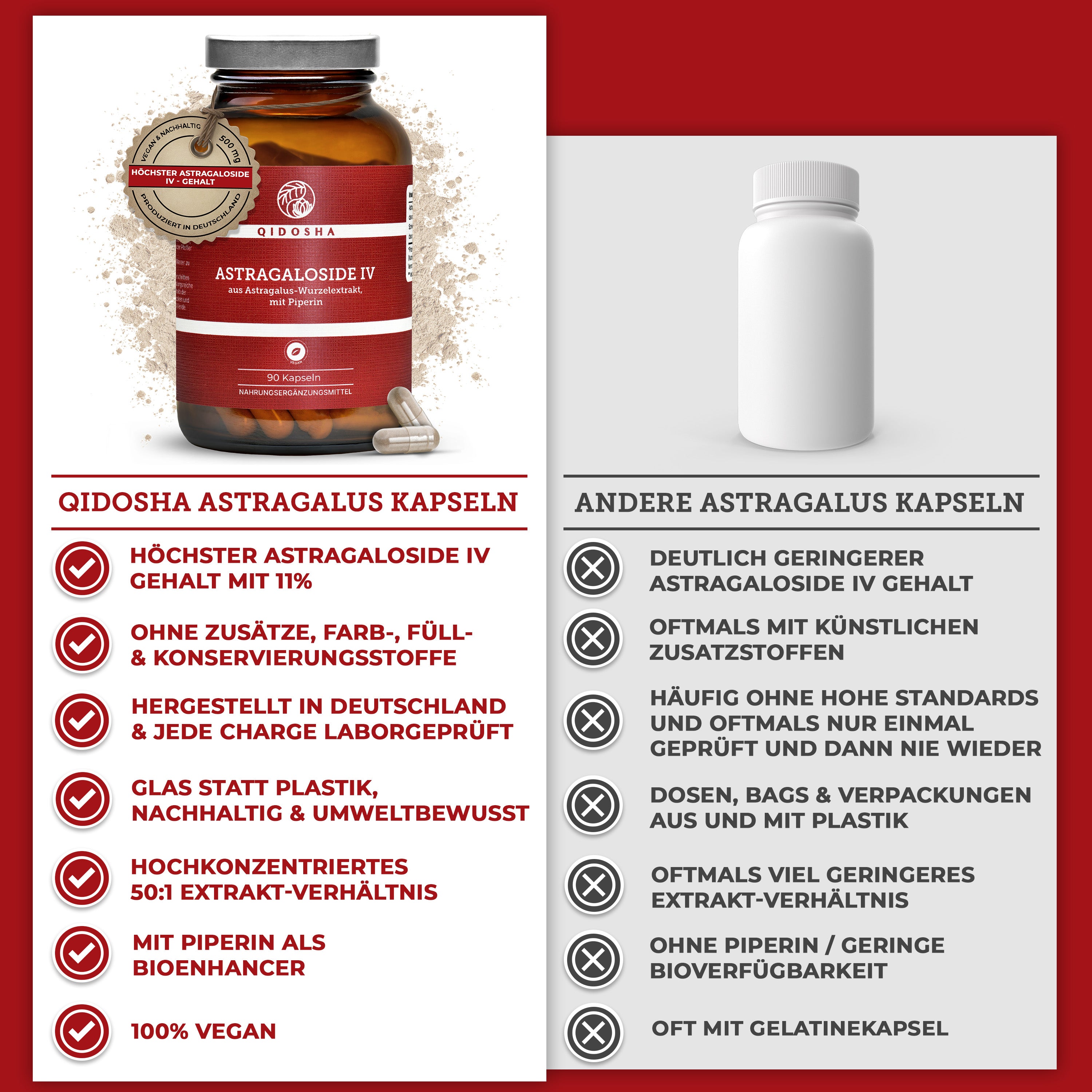 Qidosha Astragalosid IV aus Astragalus-Wurzelextrakt mit Piperin, Premium Nahrungsergänzungsmittel: 100 % vegan, deutsche Produktion, ohne Füllstoffe, laborgeprüfte Qualität, Glasverpackung.