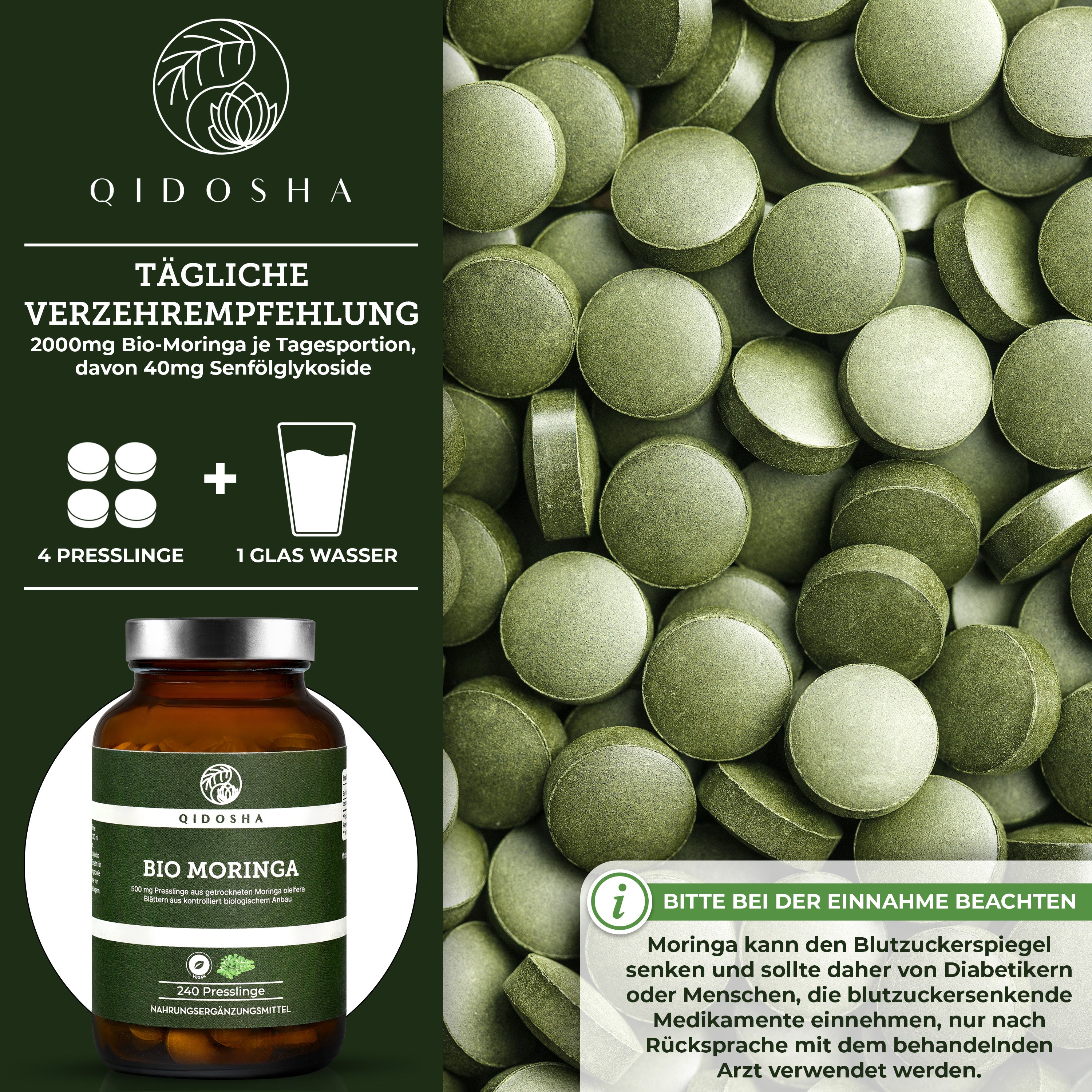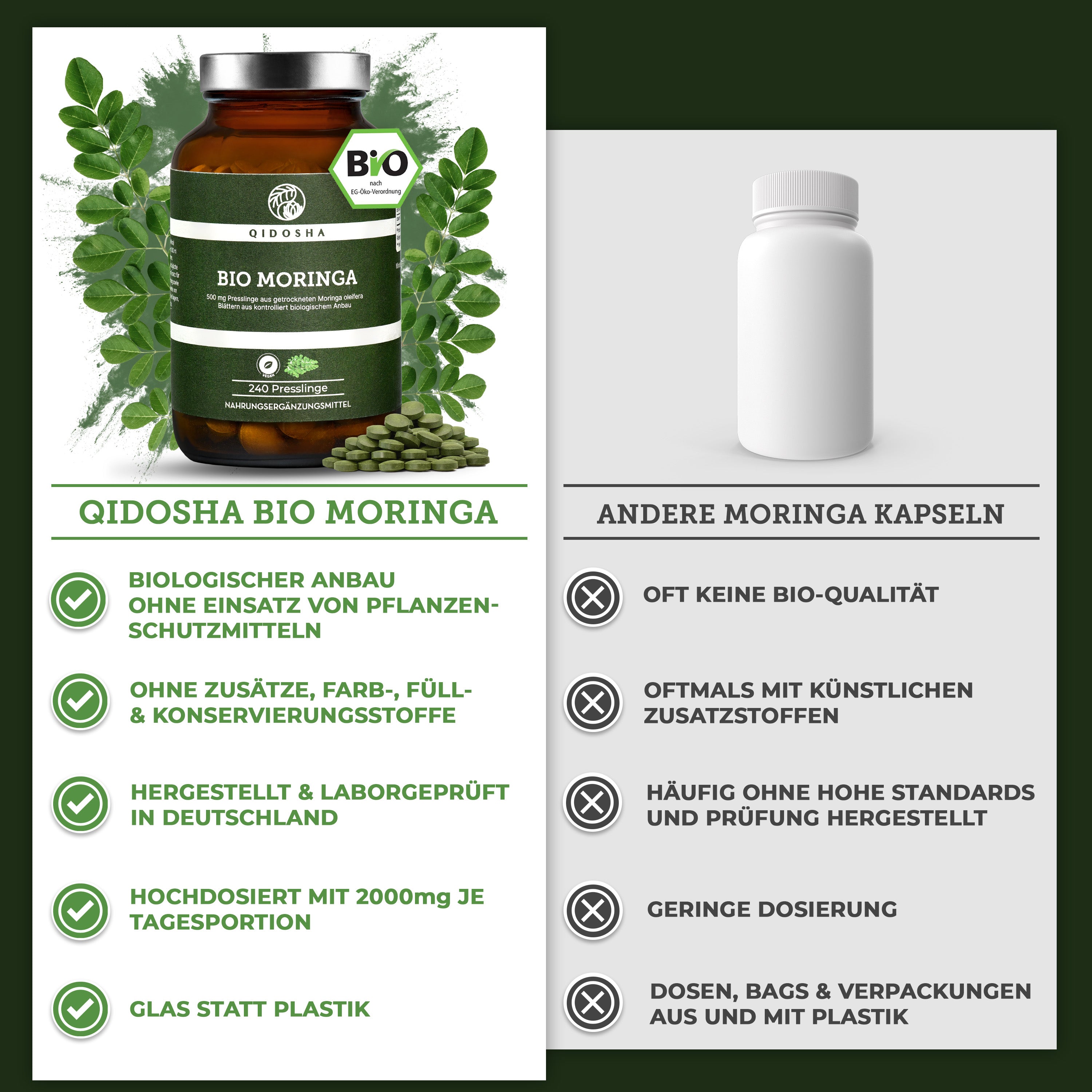 QIDOSHA Bio Moringa Presslinge 500mg 240 Stk/Glas: Premium Nahrungsergänzungsmittel, laborgeprüft, 100% naturrein, ohne Zusatzstoffe, in nachhaltigem Glas, EU-Bio-zertifiziert.