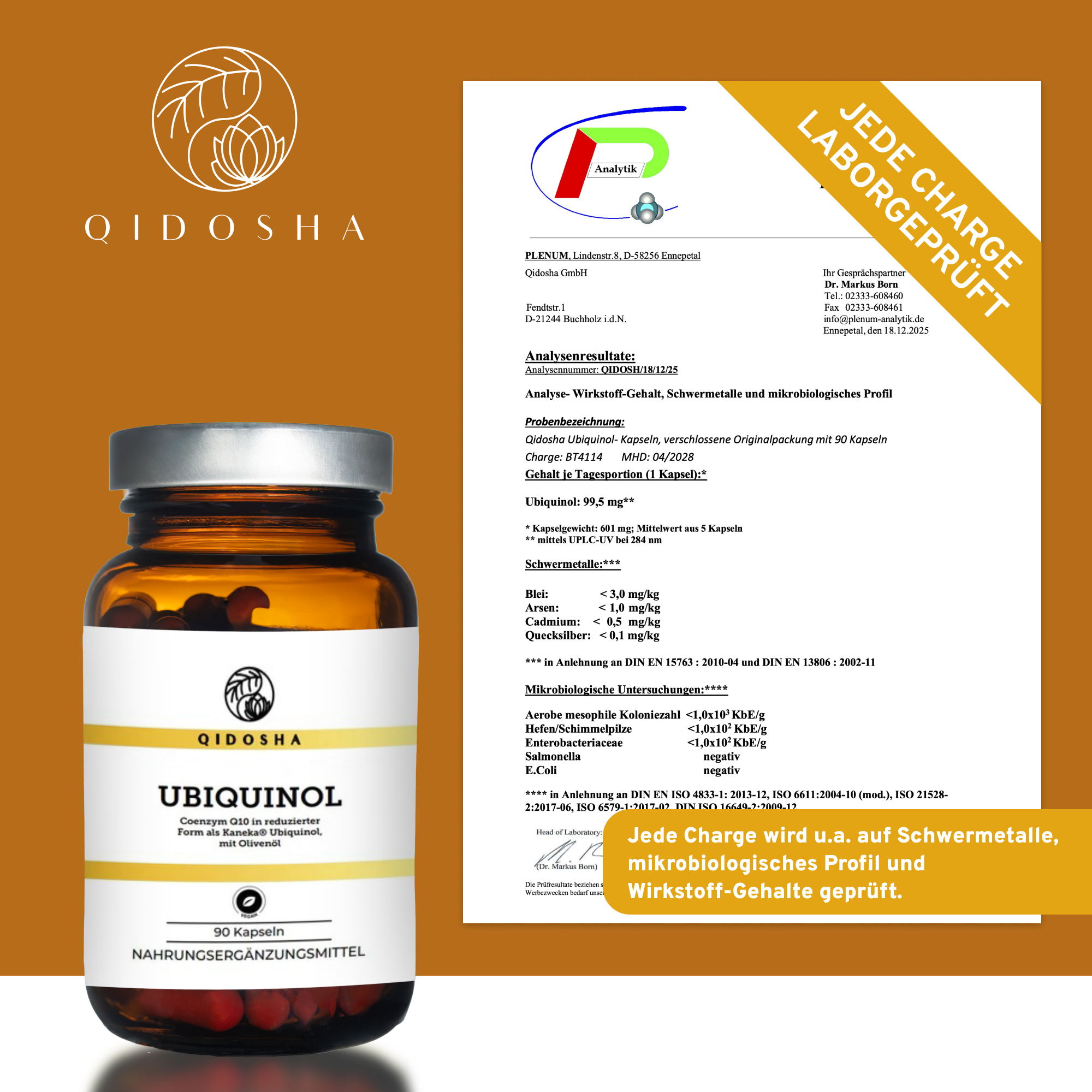 Coenzym Q10 als Ubiquinol mit dem Markenrohstoff von KANEKA®, 90 Kapseln, laborgeprüfte Qualität, ohne Füll- oder Zusatzstoffe, in nachhaltigem Apothekerglas. Zertifikat von PLENUM Analytik sichtbar.