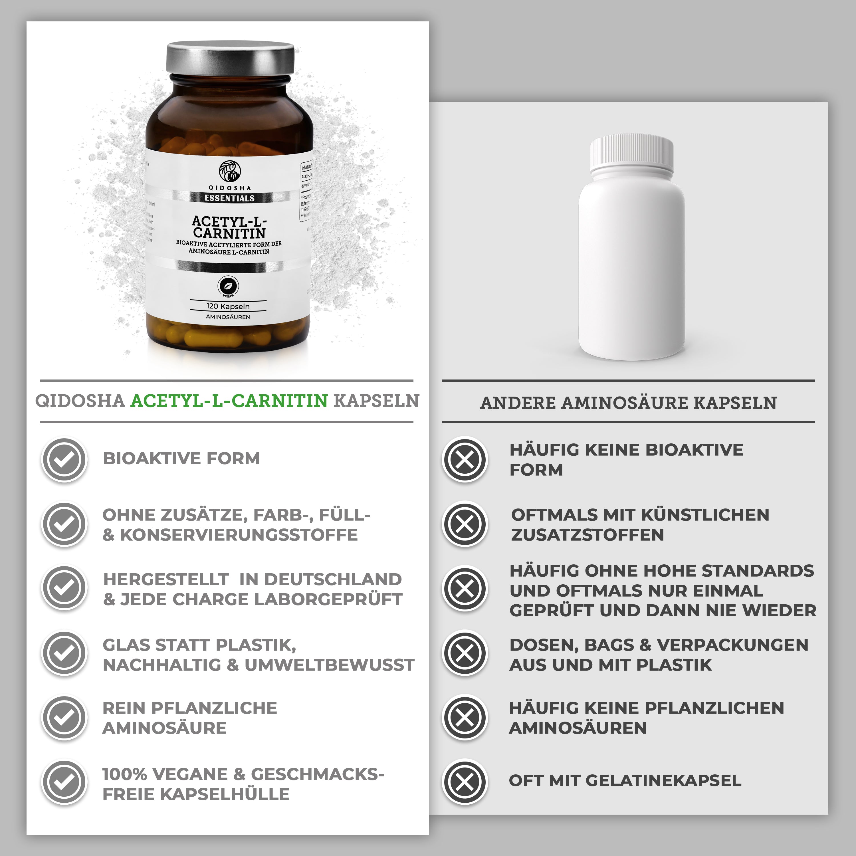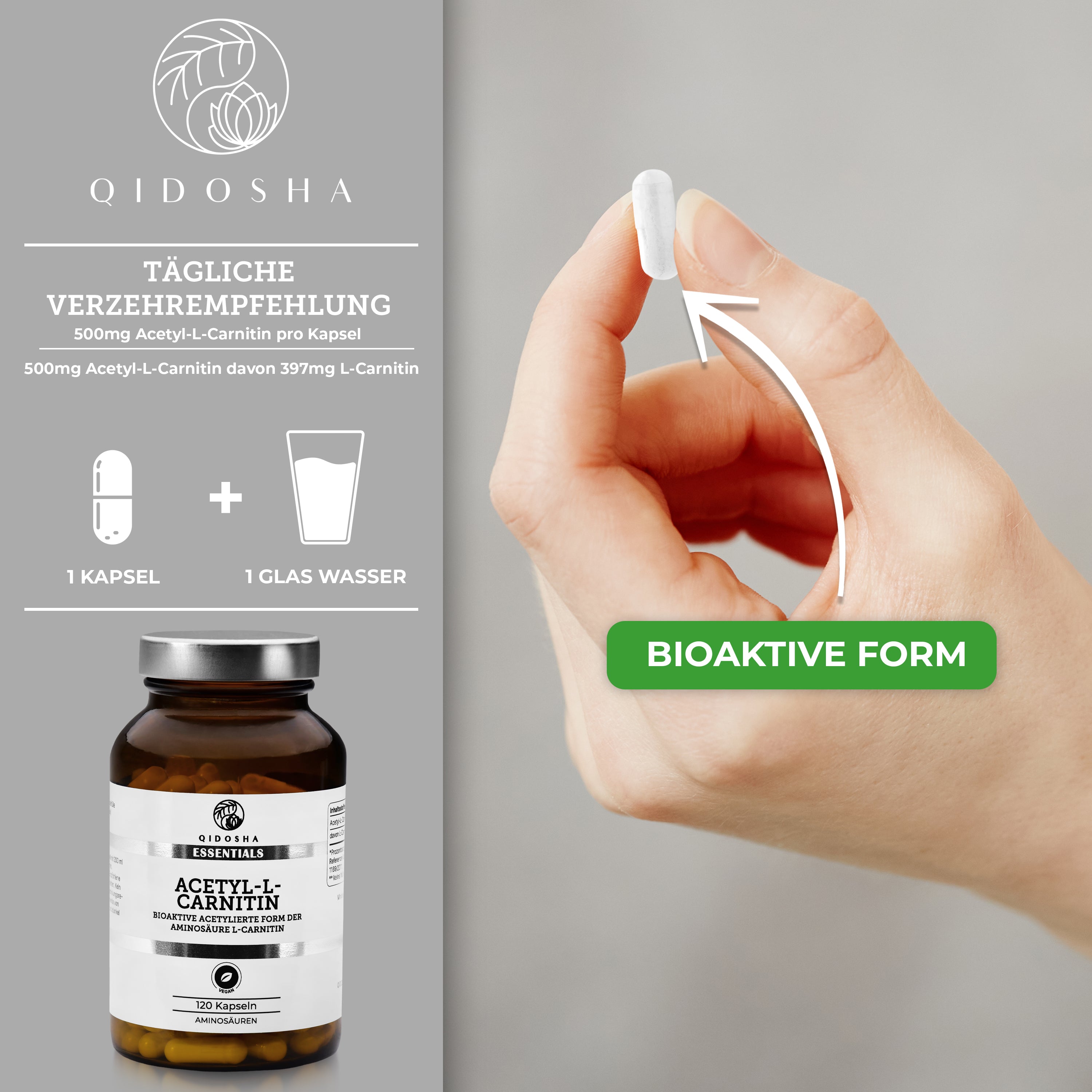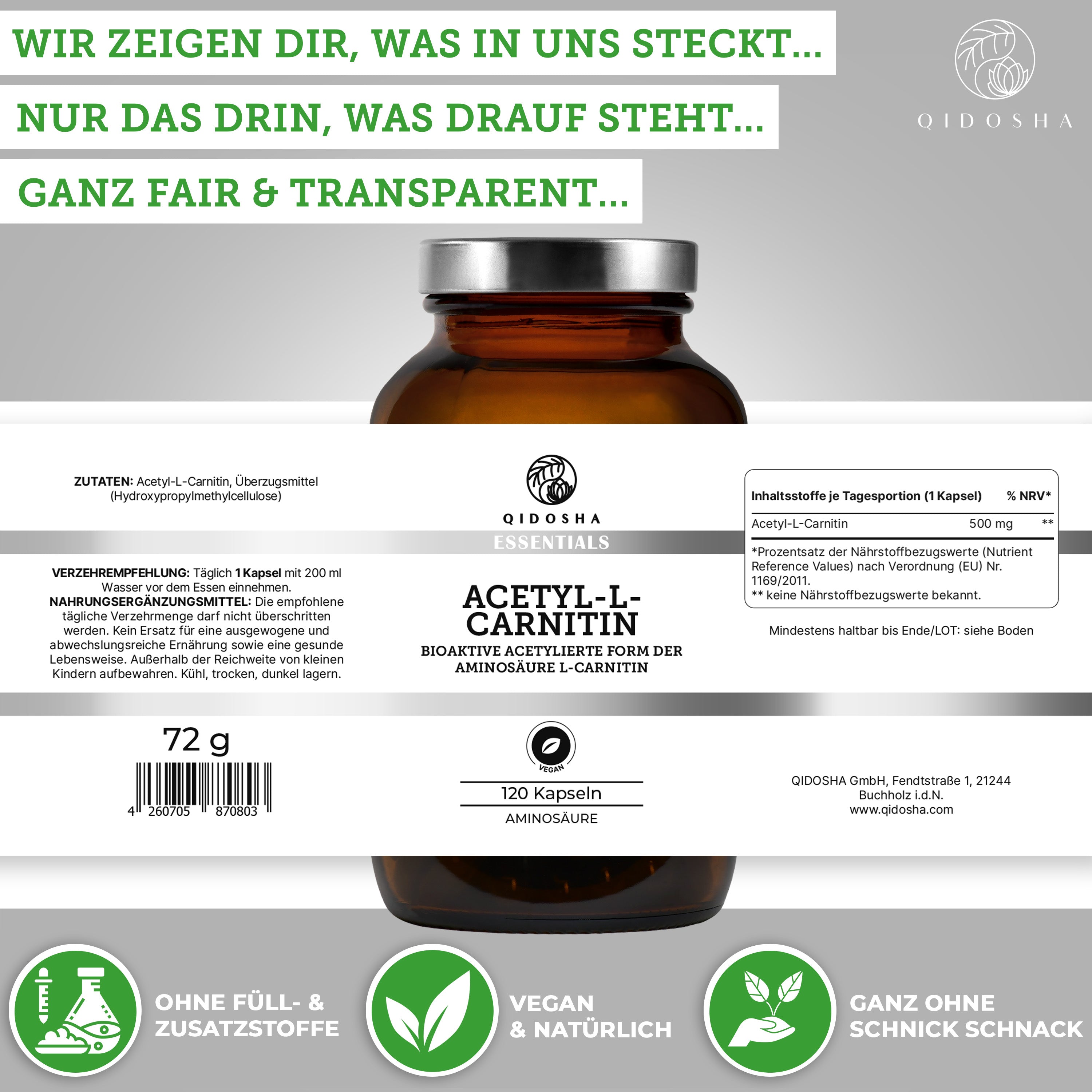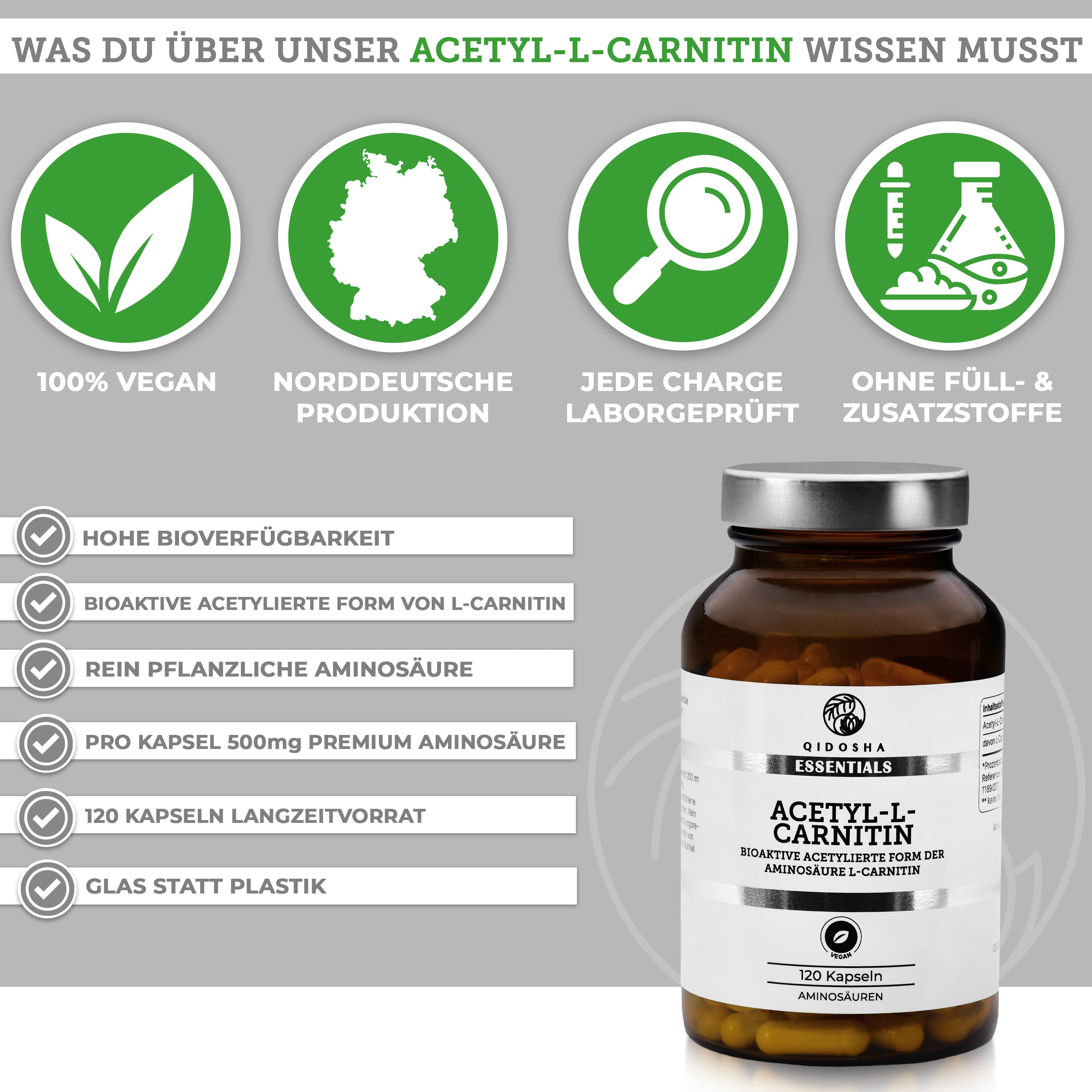 Acetyl-L-Carnitin (bioaktiv) im Glas von Qidosha Essentials: 120 vegane Kapseln, laborgeprüfte Qualität, ohne Füllstoffe, in Deutschland produziert, Premium-Nahrungsergänzung.