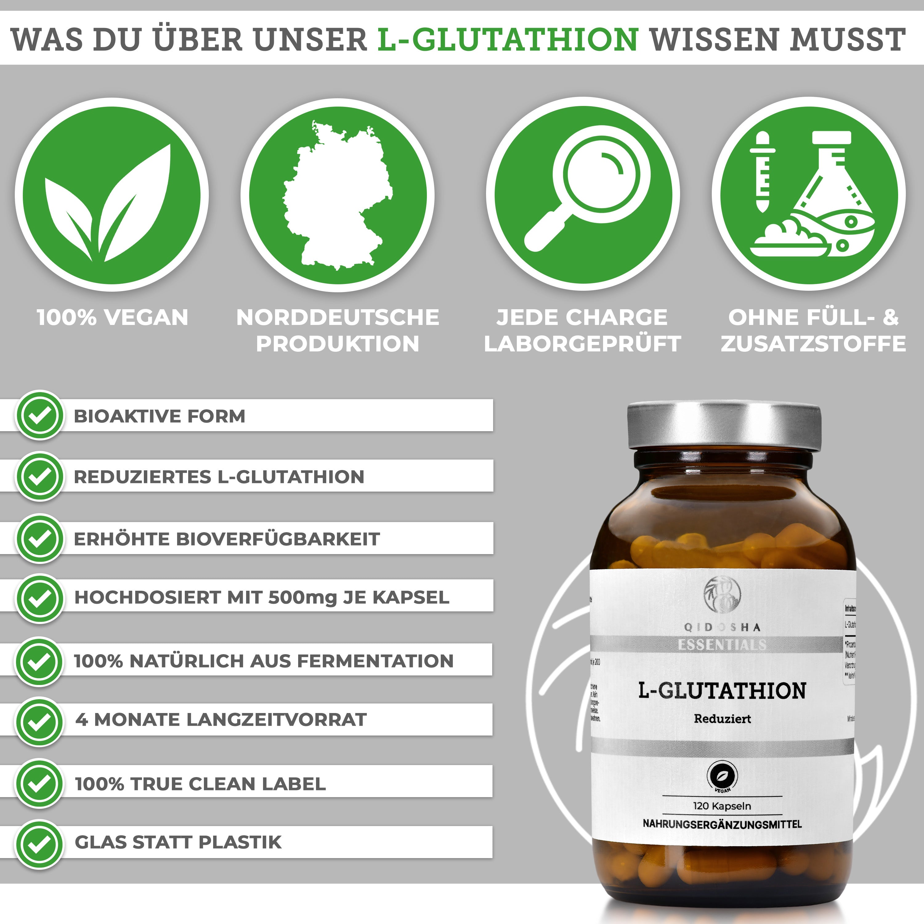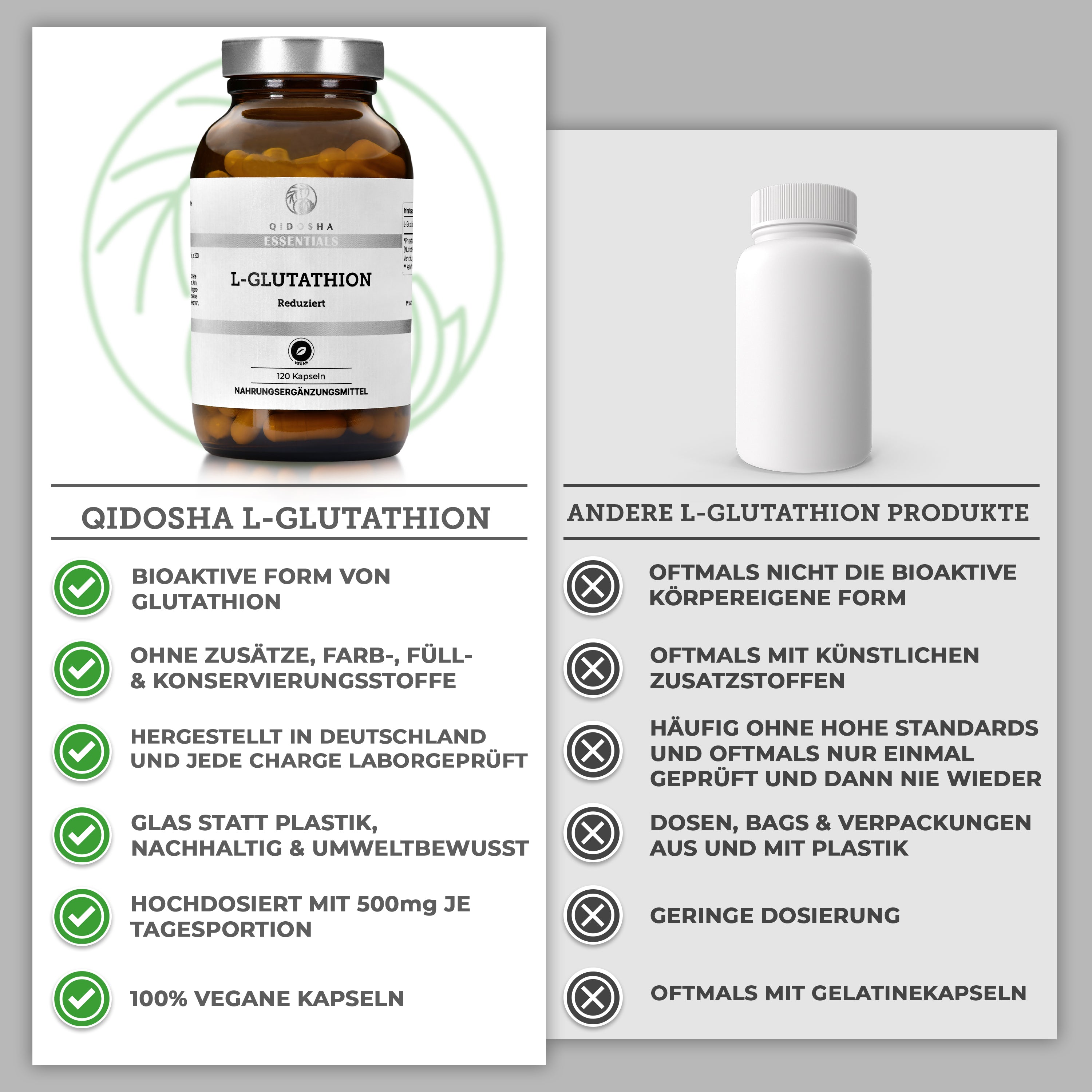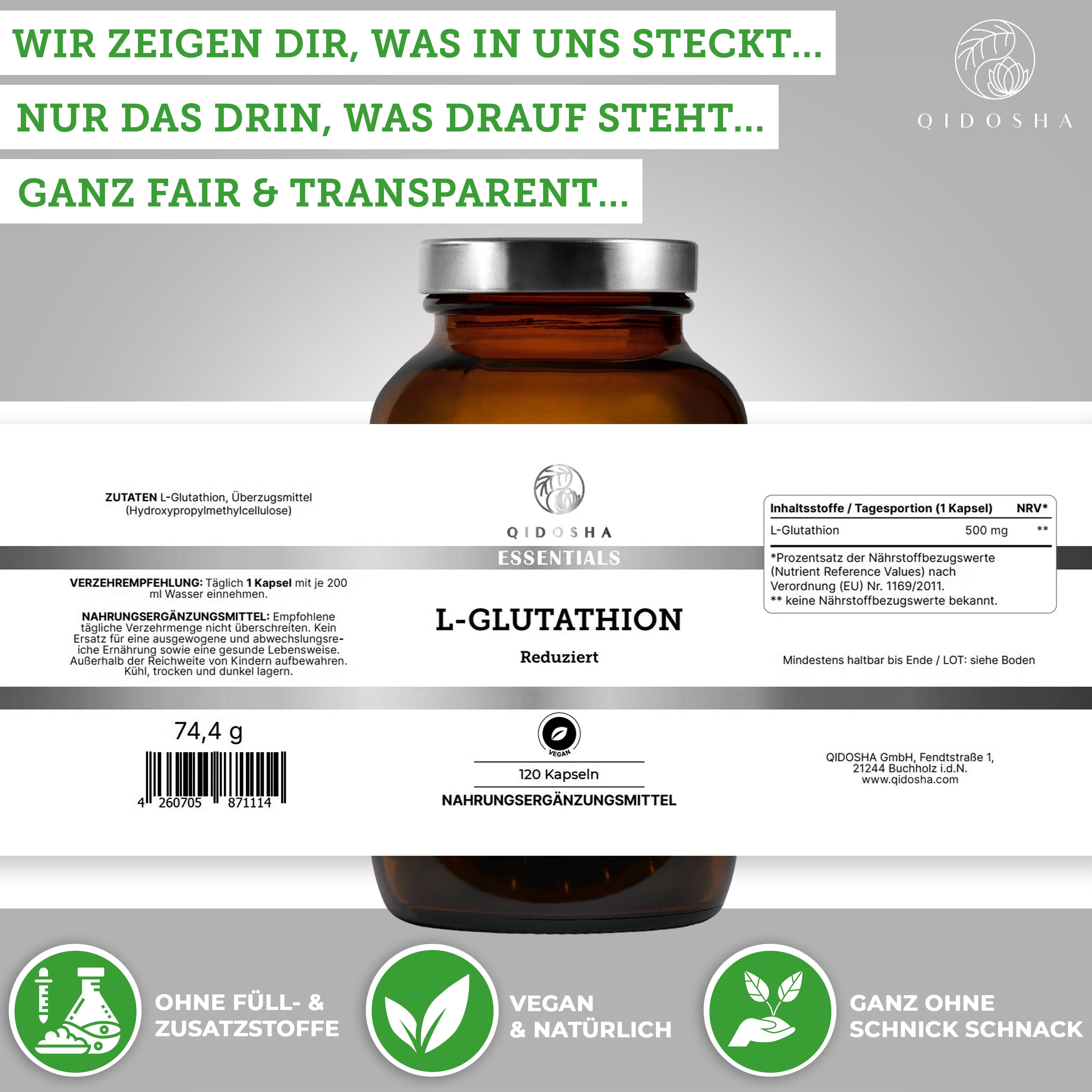 Braunes Glas QIDOSHA ESSENTIALS L-Glutathion mit 120 veganen Kapseln. Premium, laborgeprüfte Qualität, ohne Füllstoffe, nachhaltig in Deutschland produziert, Testsieger mit Sehr gut bewertet.