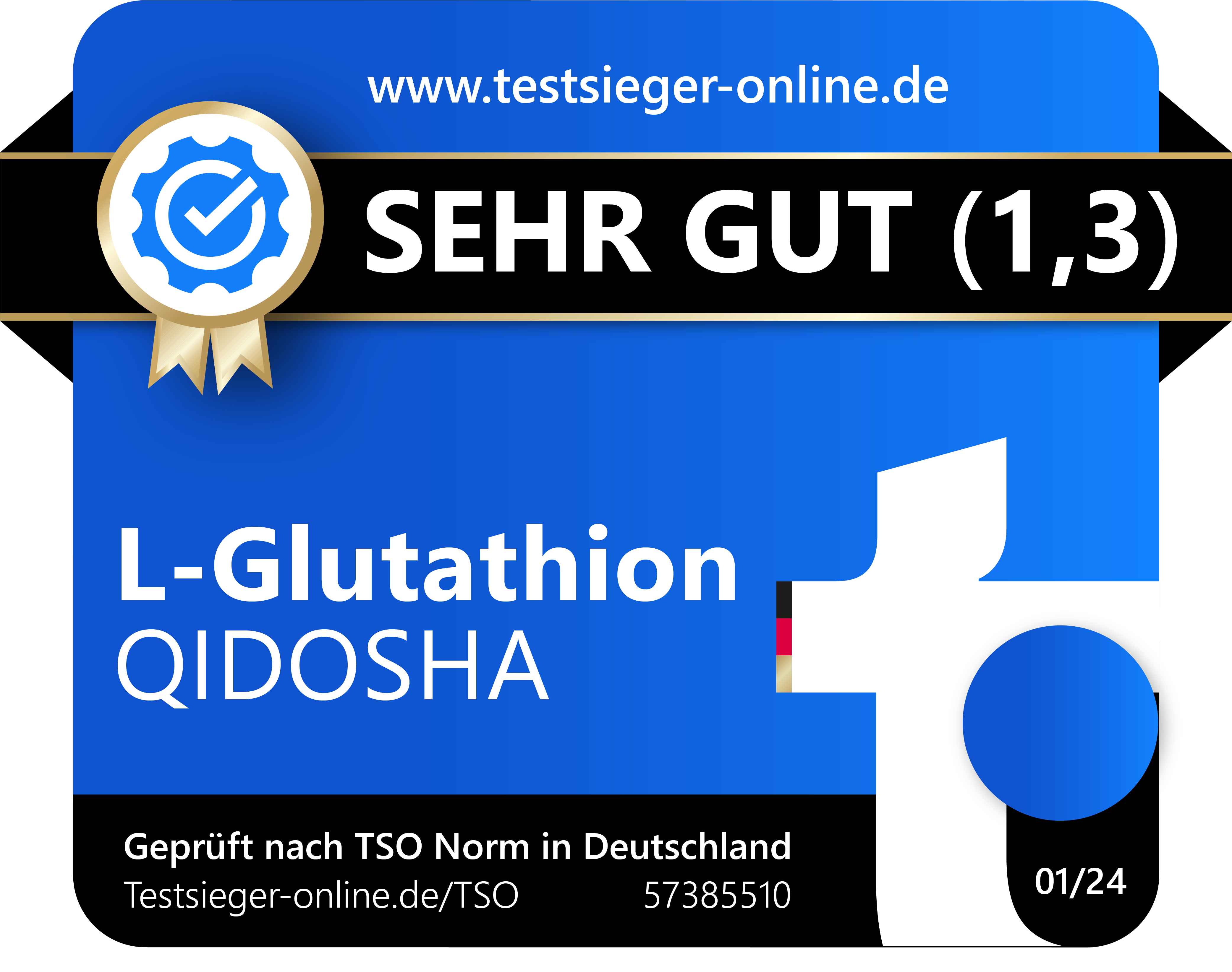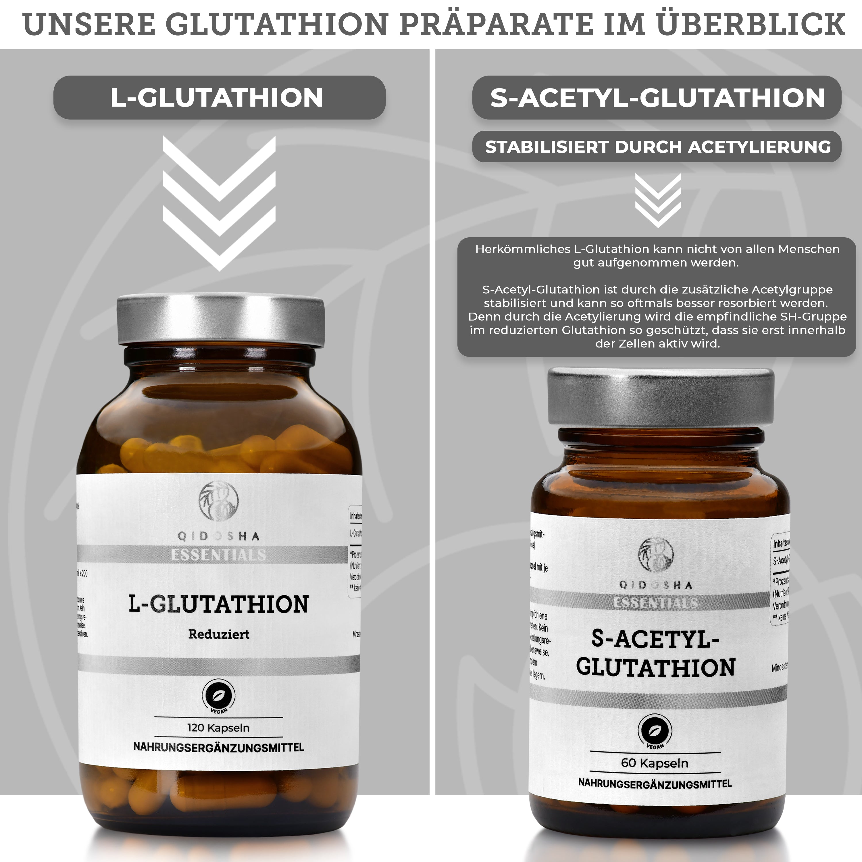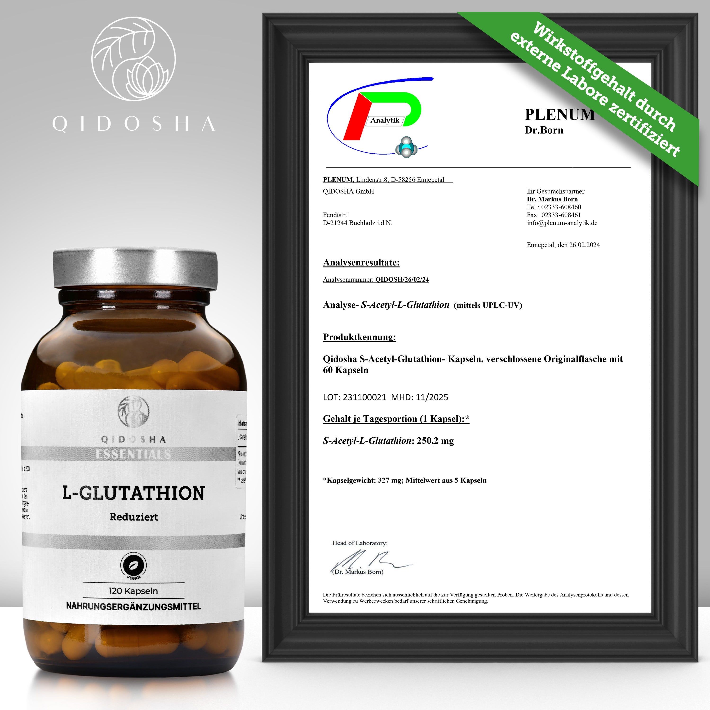Braunes Glas QIDOSHA ESSENTIALS L-Glutathion mit 120 veganen Kapseln. Premium, laborgeprüfte Qualität, ohne Füllstoffe, nachhaltig in Deutschland produziert, Testsieger mit Sehr gut bewertet.