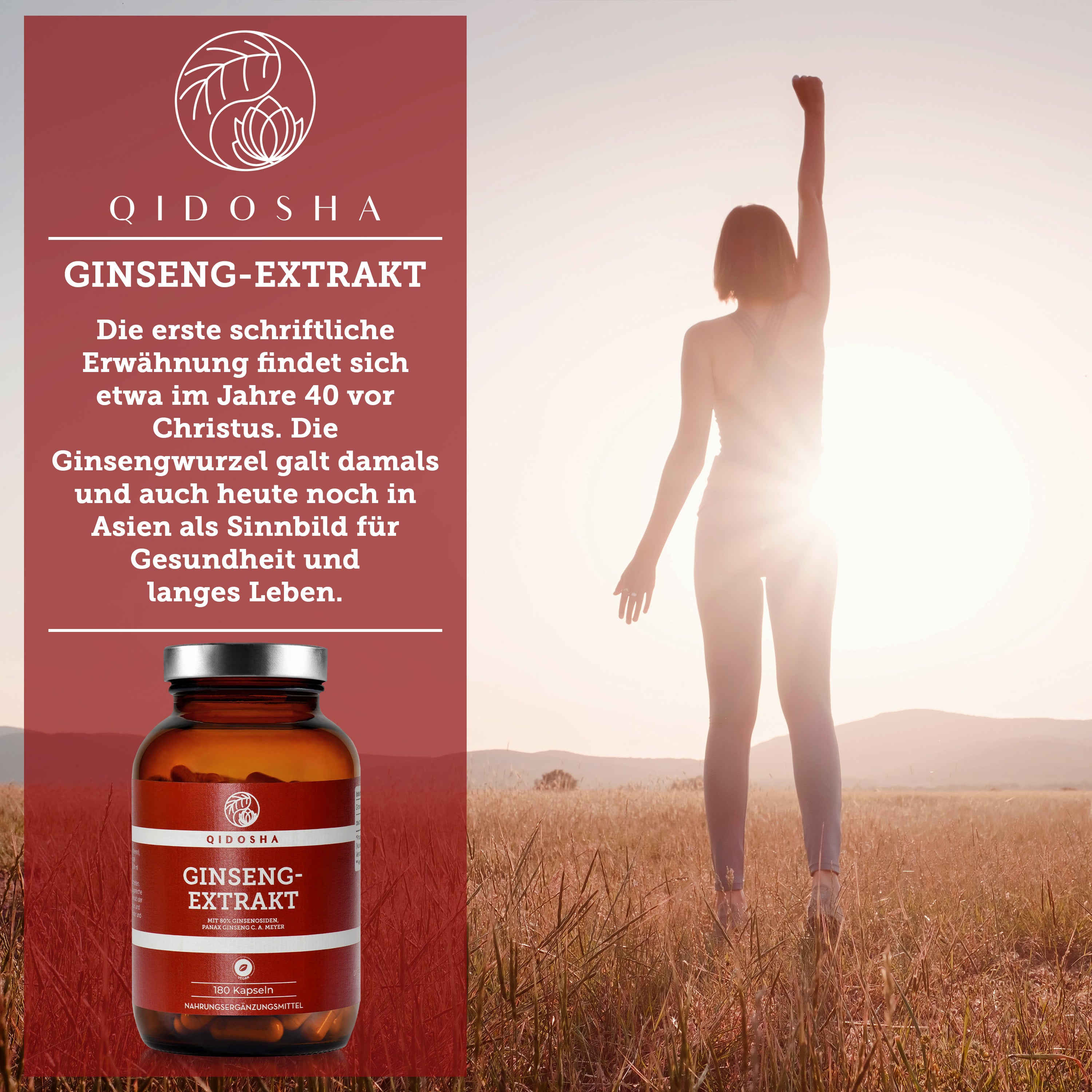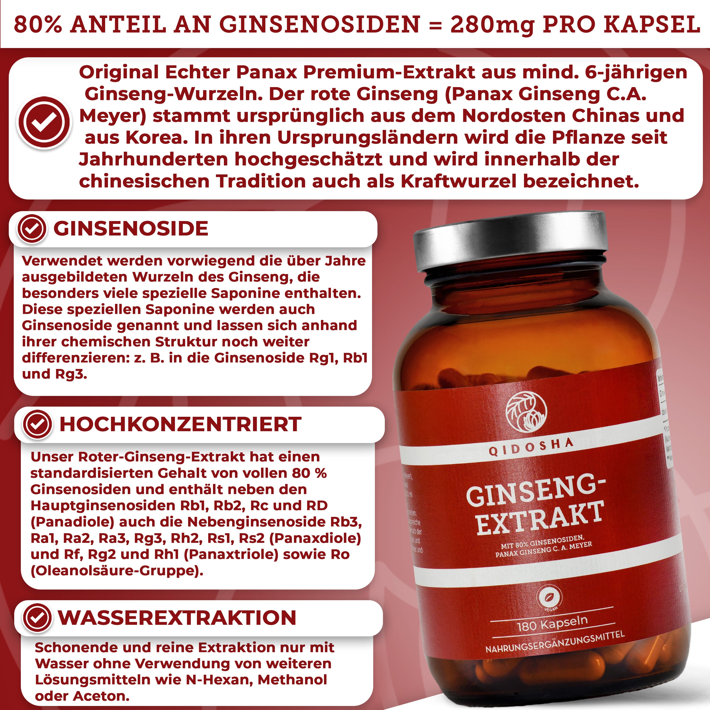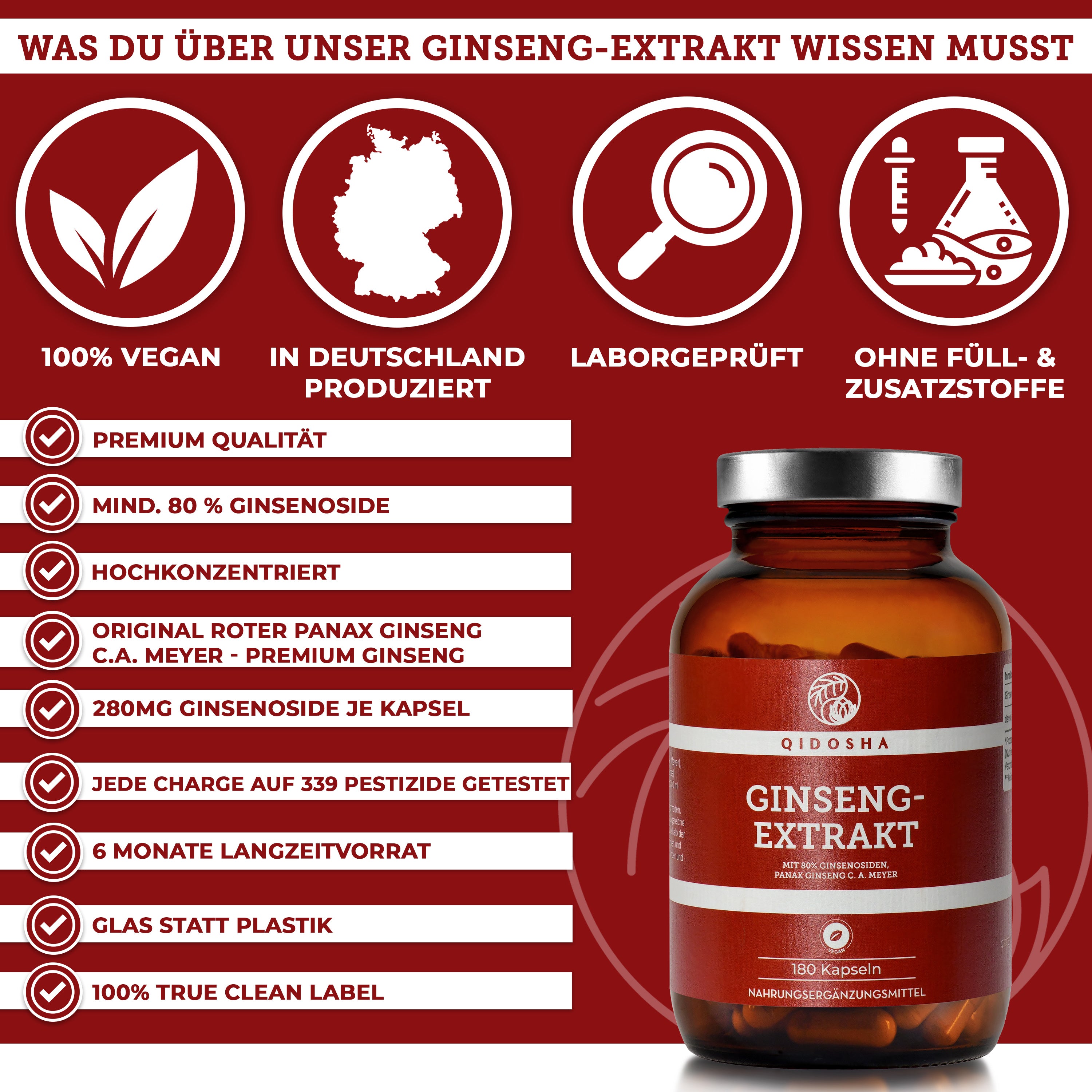 Ginseng-Extrakt im Glas: Premium Ginseng-Kapseln von Qidosha, vegan und nachhaltig, mit 80% Ginsenosiden, laborgeprüft, ohne Zusatzstoffe, hergestellt in Deutschland.