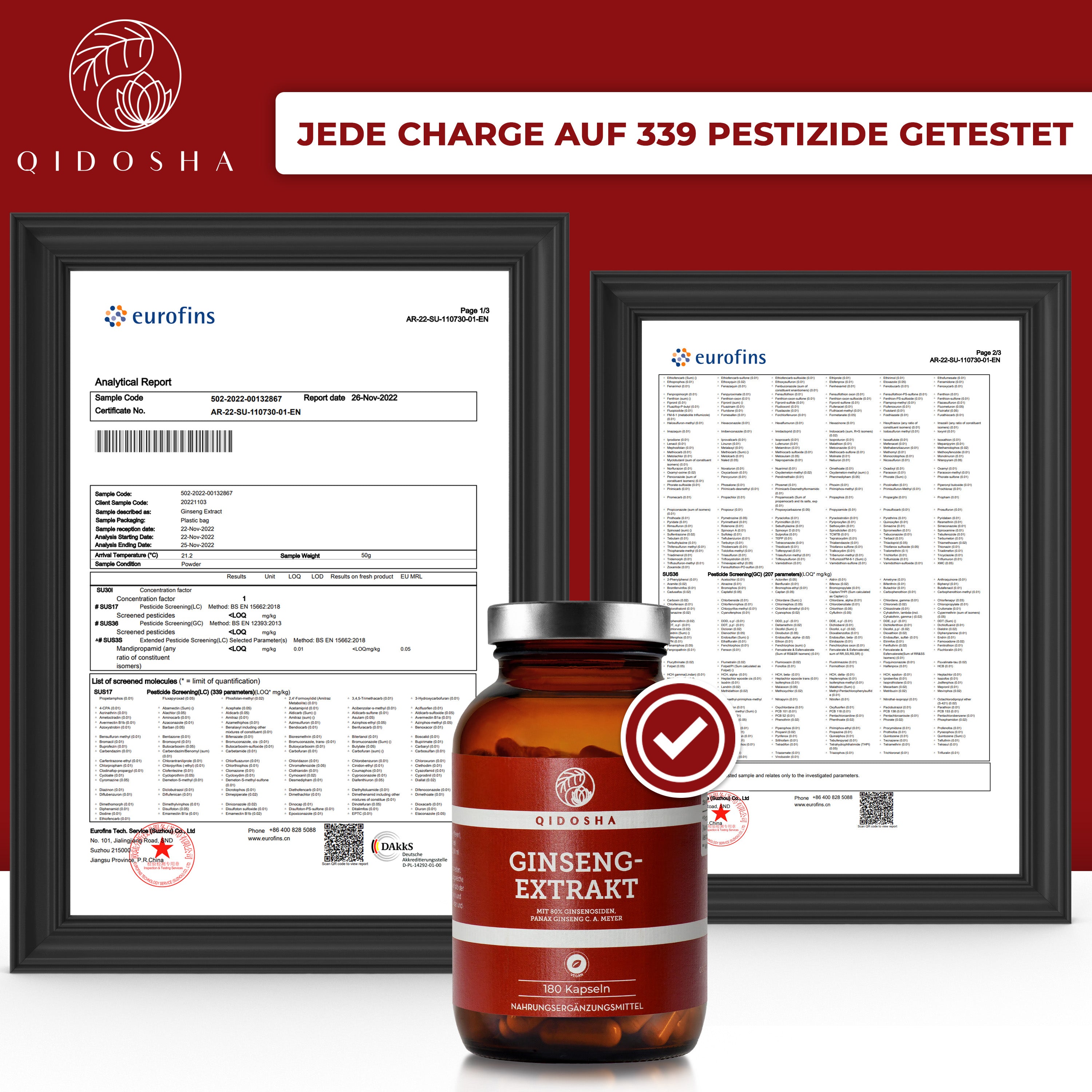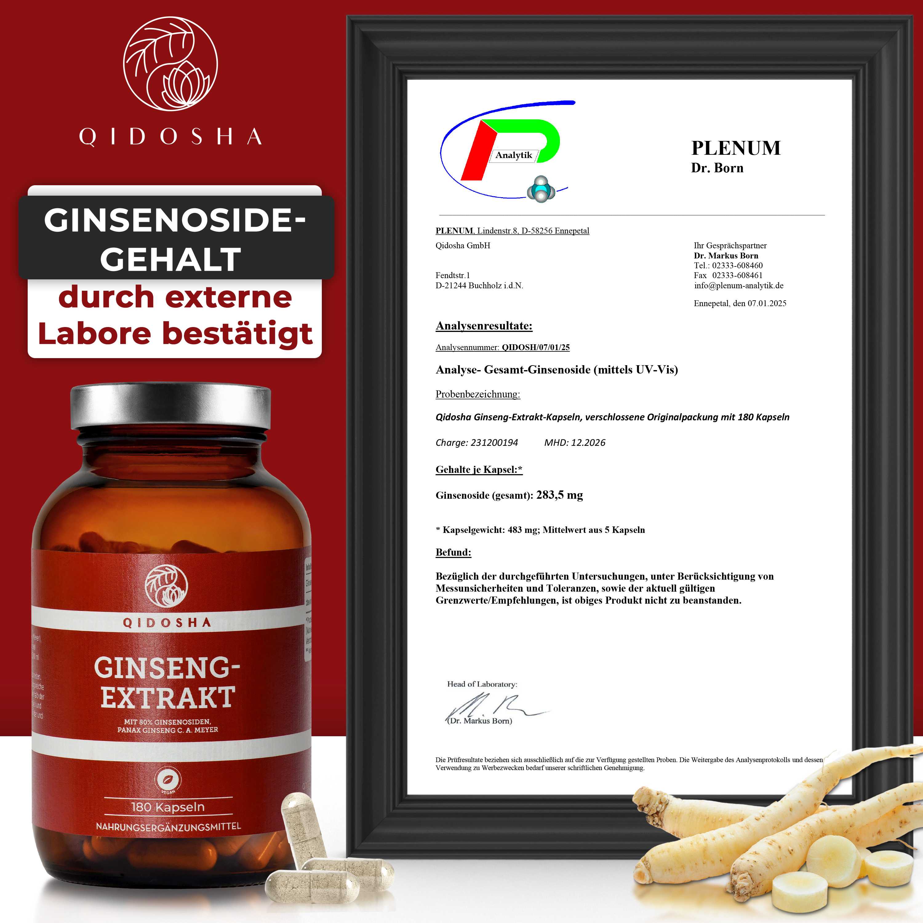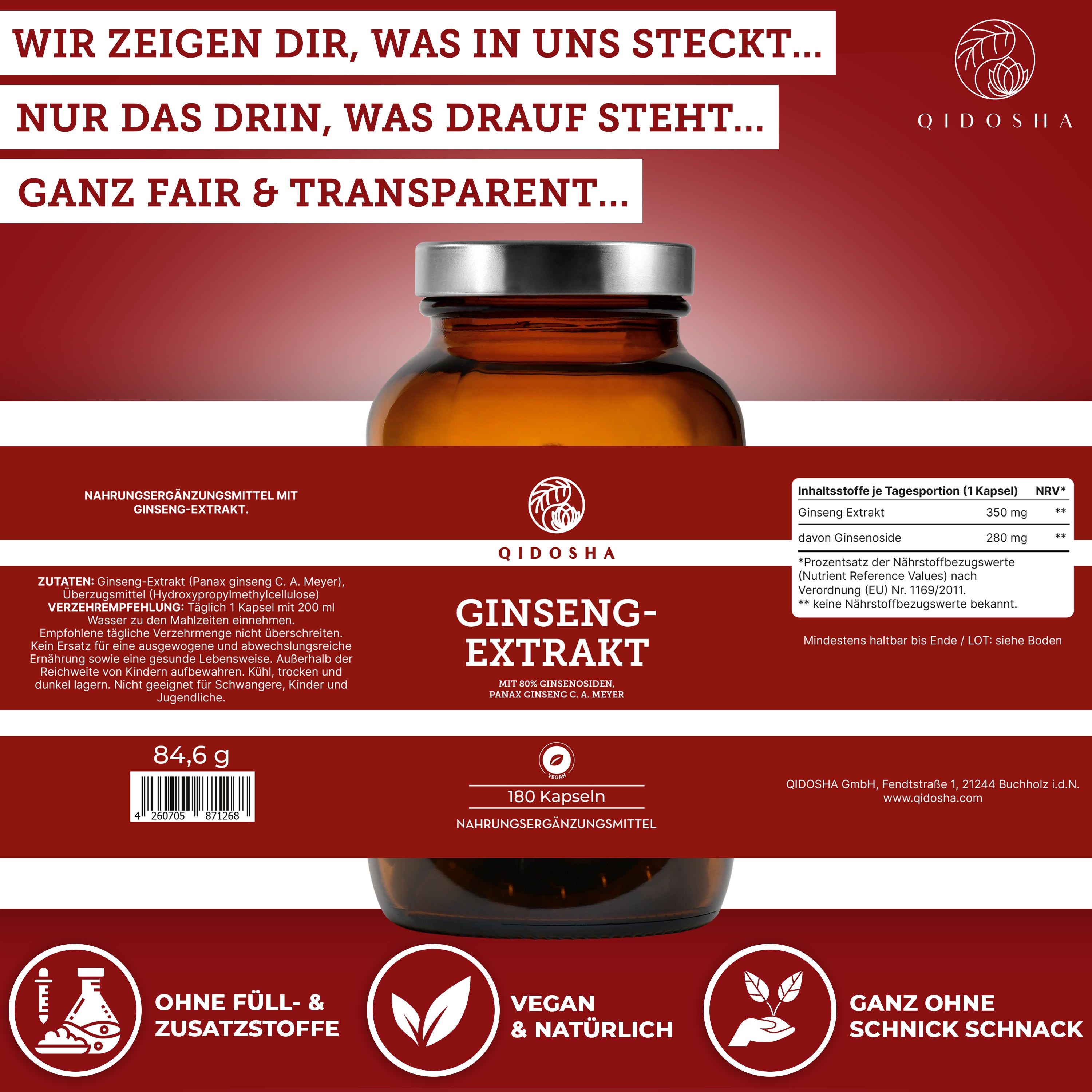 Ginseng-Extrakt im Glas: Premium Ginseng-Kapseln von Qidosha, vegan und nachhaltig, mit 80% Ginsenosiden, laborgeprüft, ohne Zusatzstoffe, hergestellt in Deutschland.