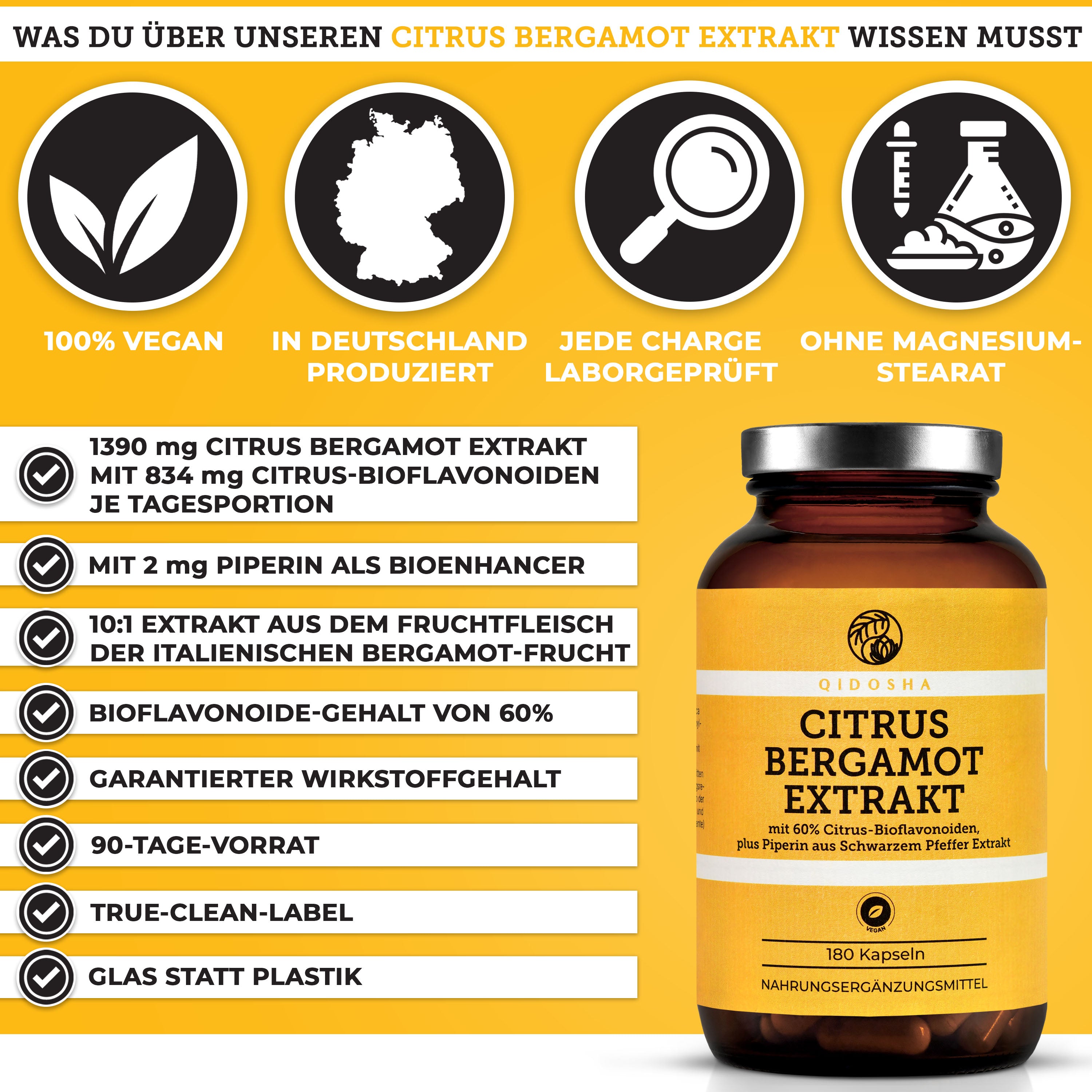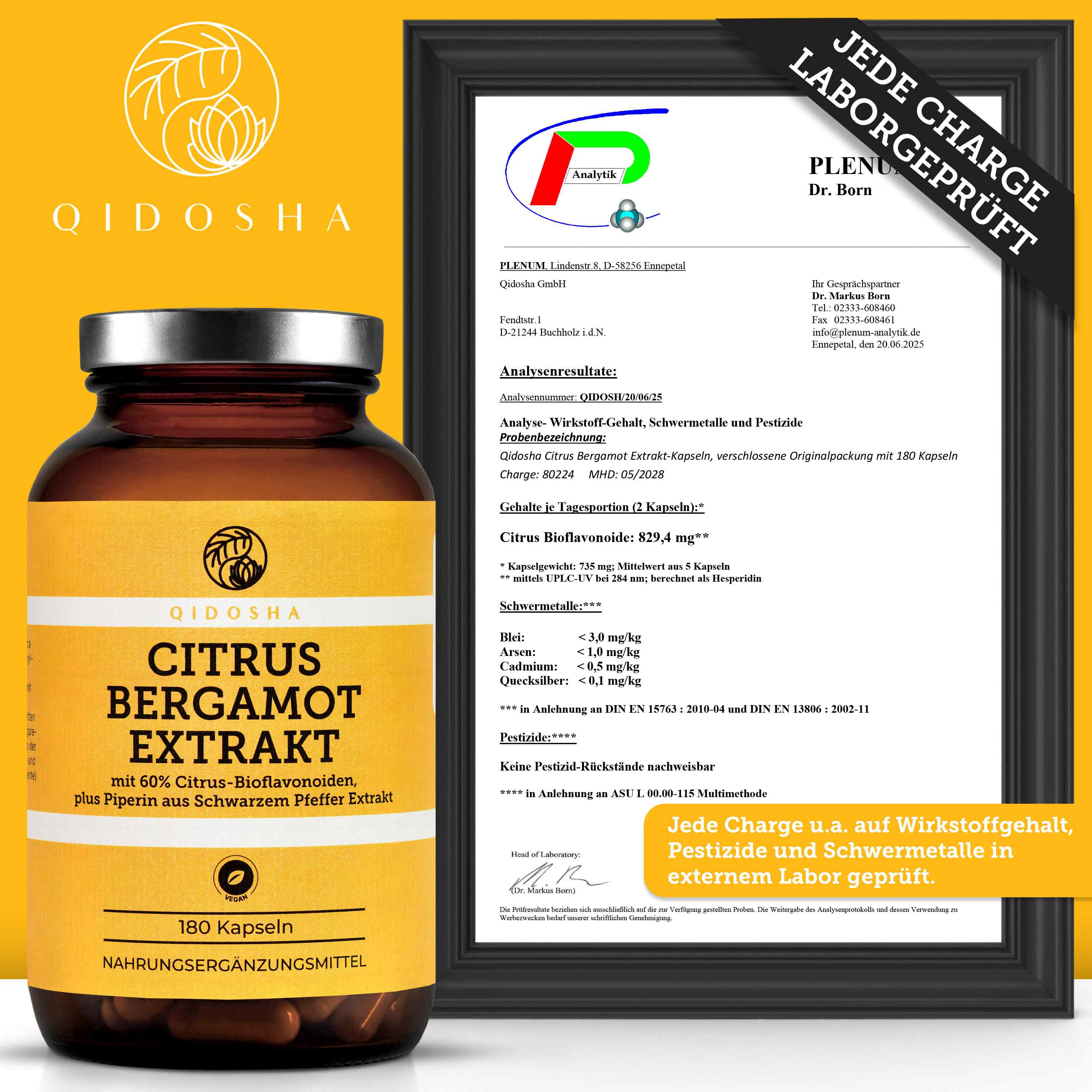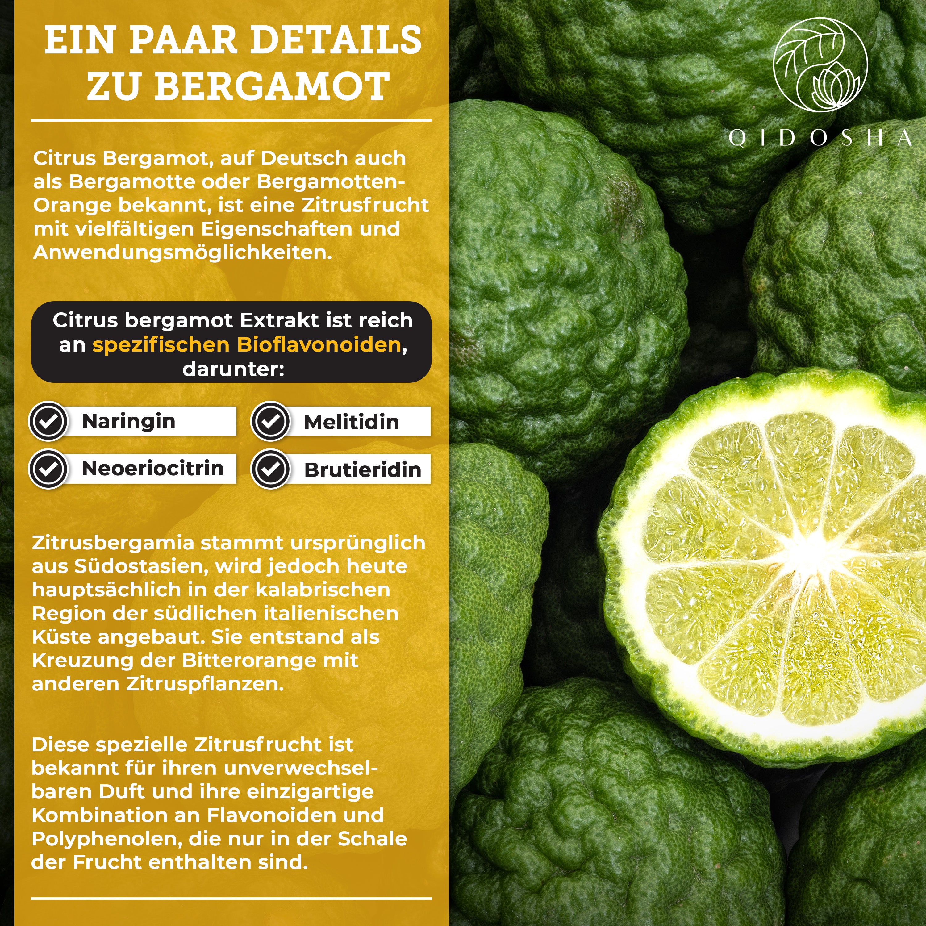 QIDOSHA Premium Citrus Bergamot Extrakt plus Piperin: Laborgeprüfte Qualität, 180 vegane Kapseln. Enthält 60% Bioflavonoide, ohne Füll- oder Zusatzstoffe, im lichtgeschützten Braunglas.