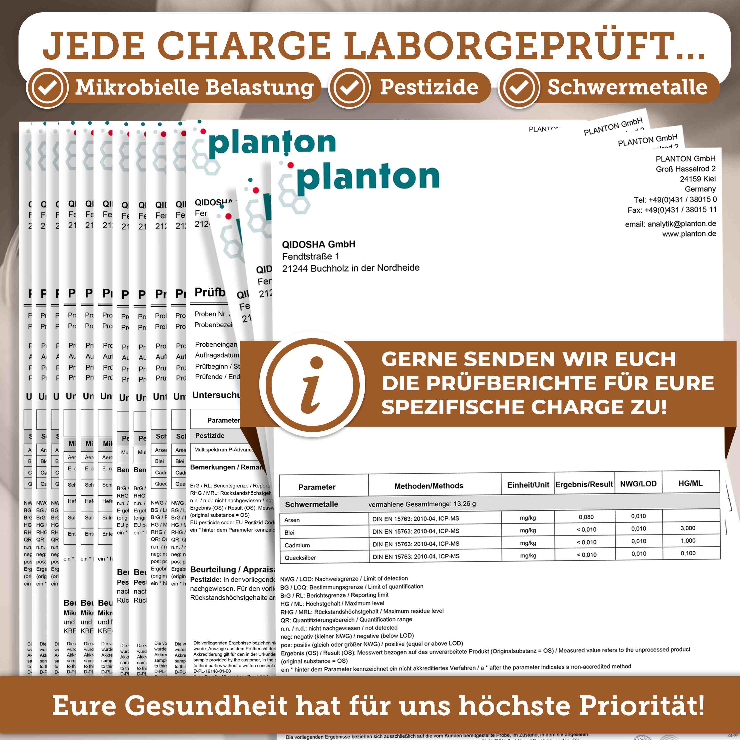 Unsere Produkte werden durch externe Labore u.a. auf mikrobielle Belastung, Schwermetalle, Pestizide und Wirkstoffgehalt geprüft.
