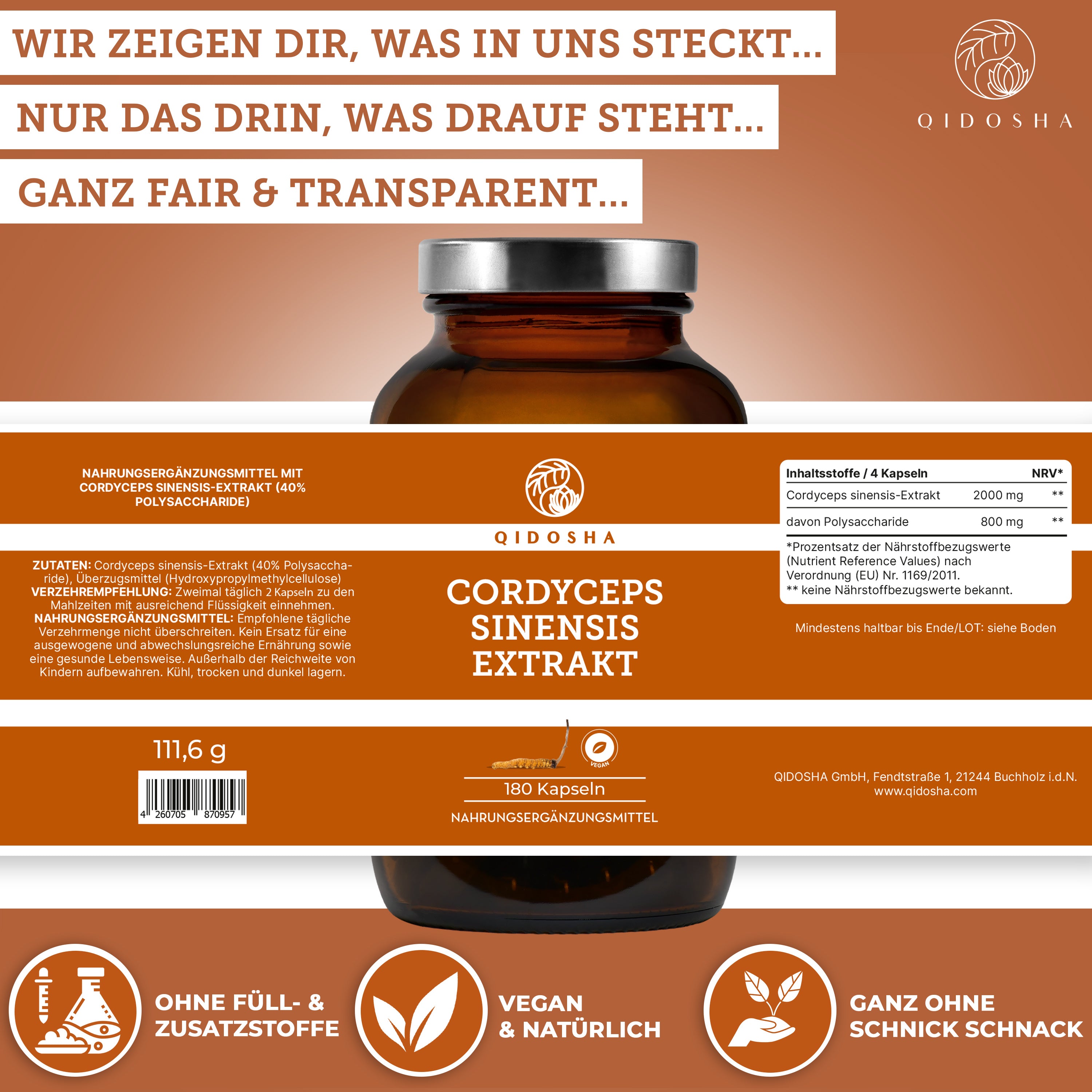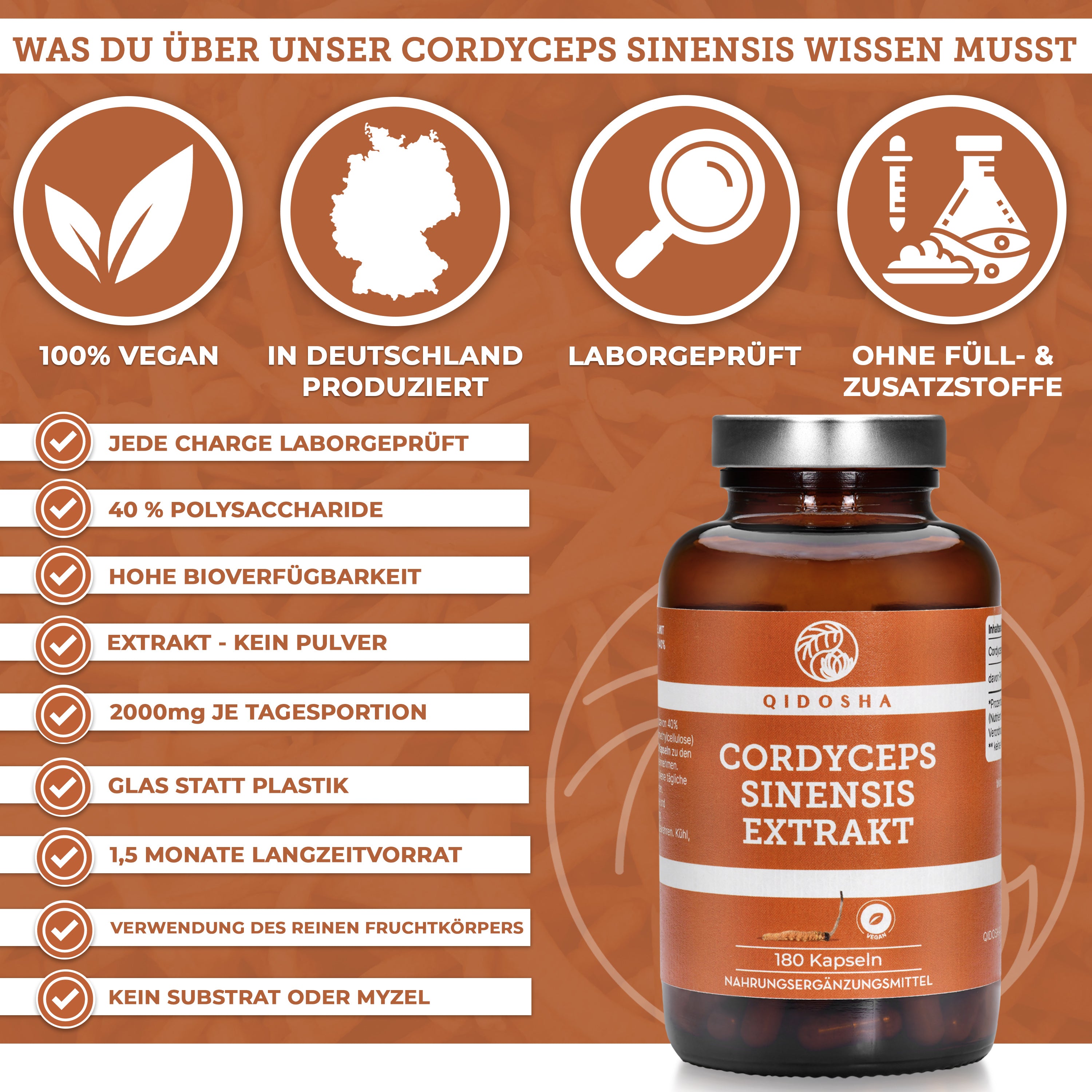 Cordyceps sinensis (CS-4) Extrakt im Glas, laborgeprüft, 180 vegane Kapseln, 2.000 mg, ohne Füllstoffe, produziert in Deutschland, Premium Qualität.