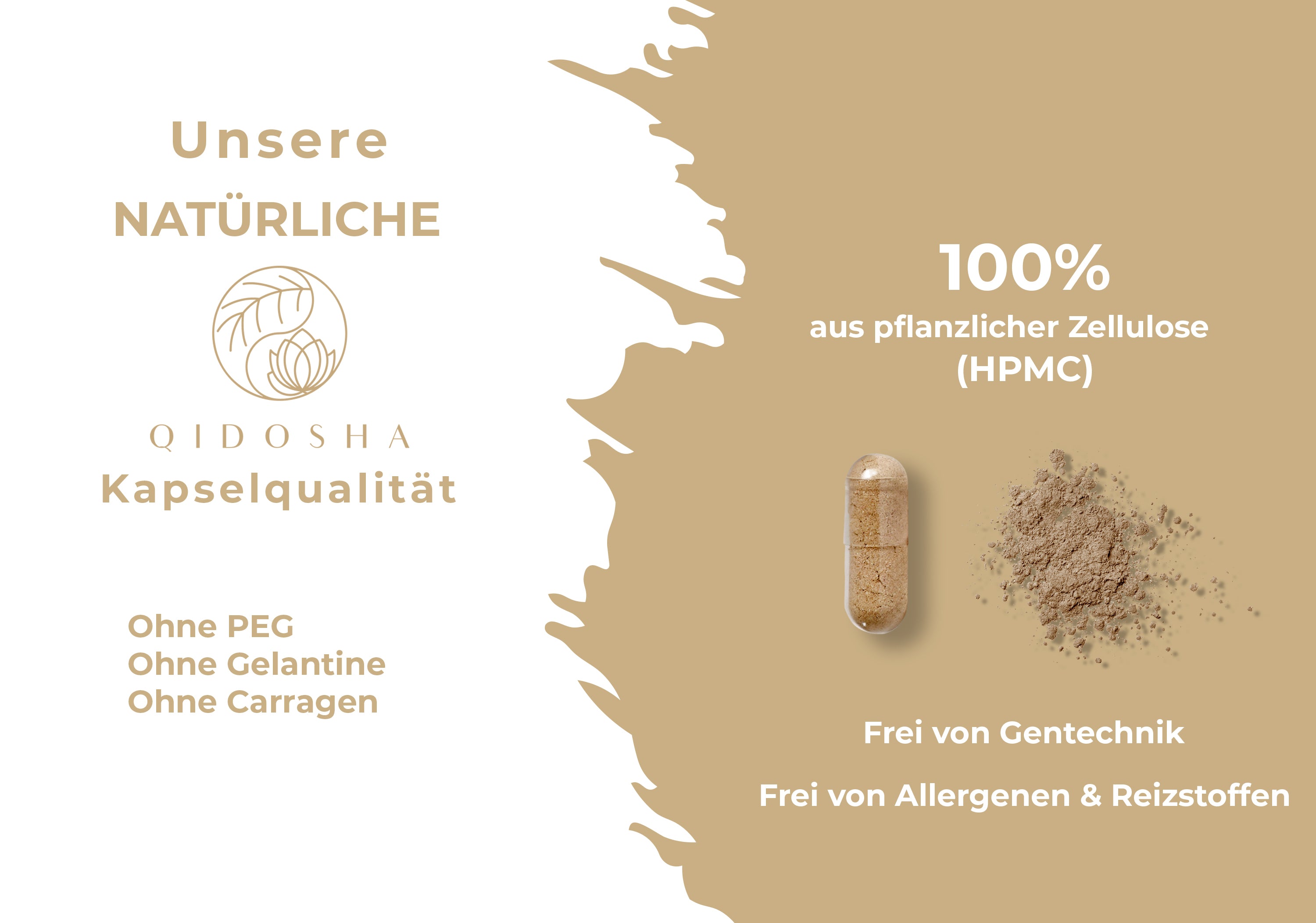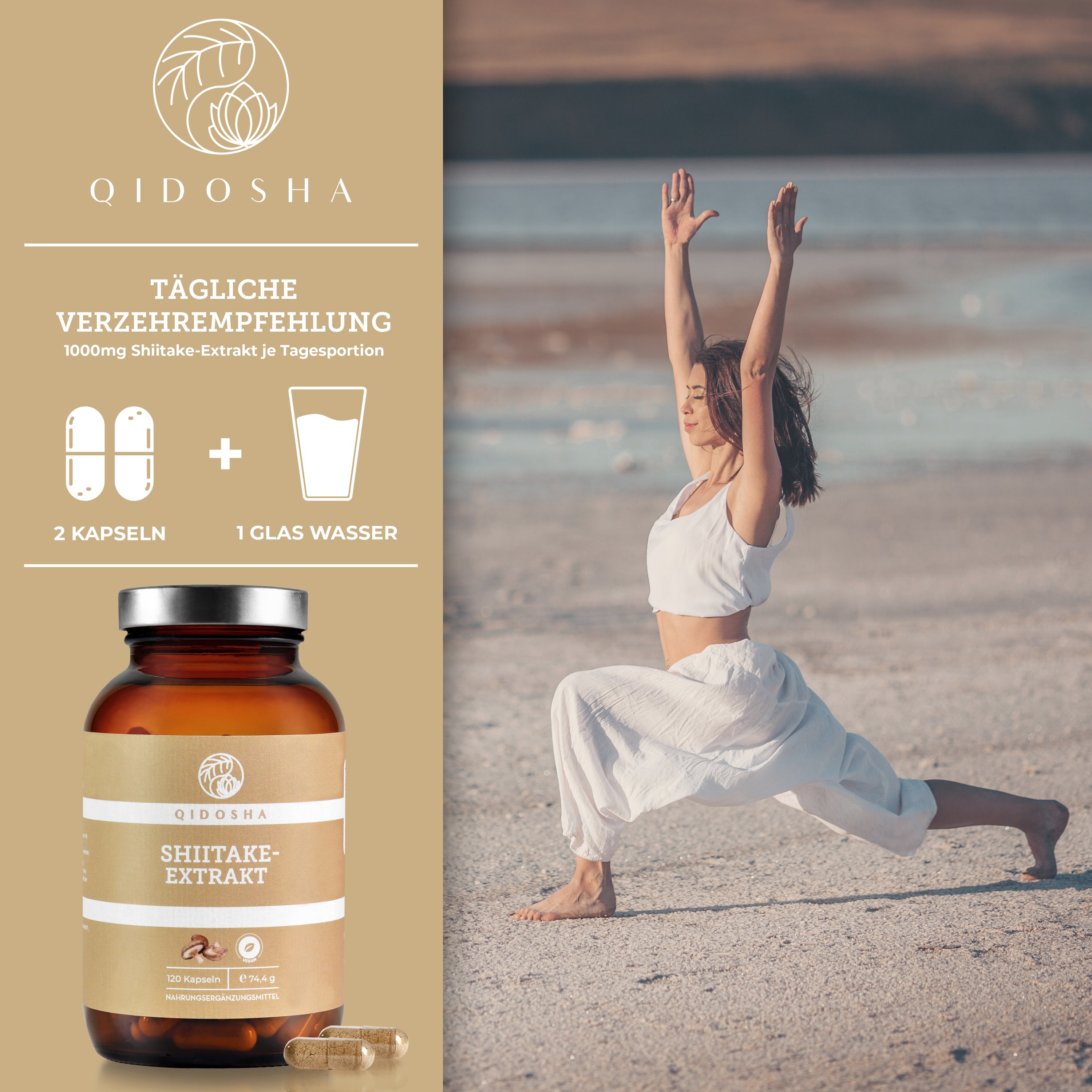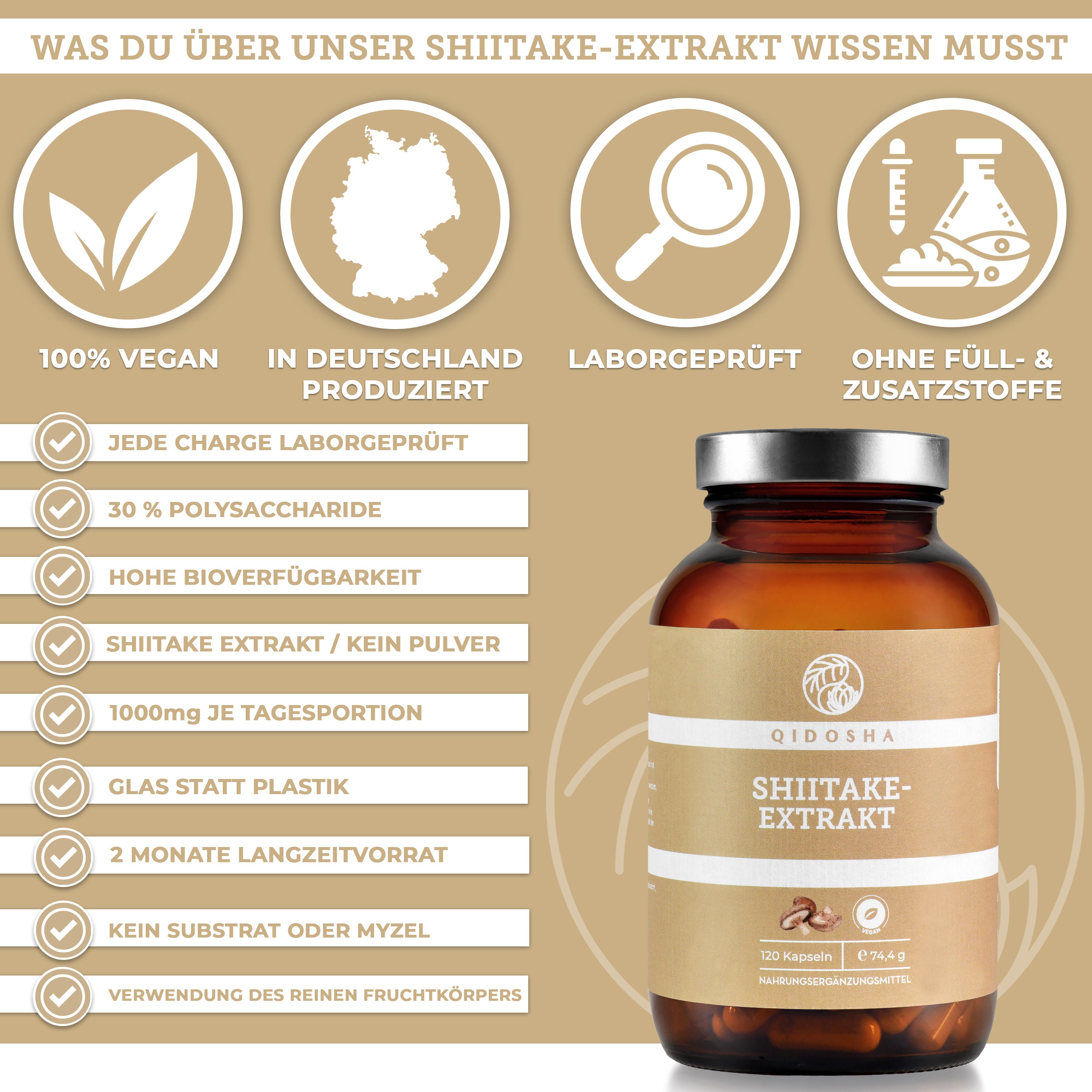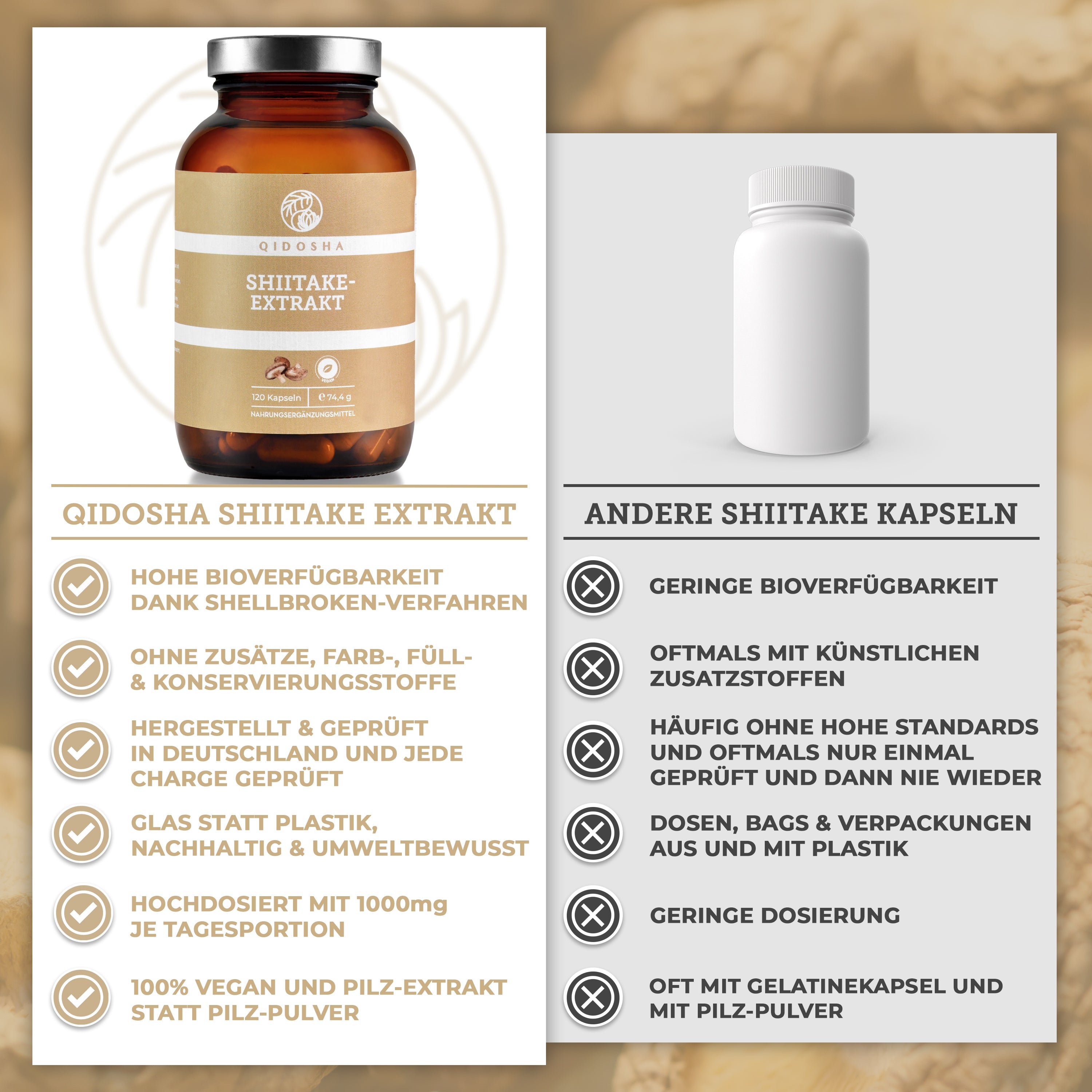 QIDOSHA Shiitake-Extrakt: 120 vegane Kapseln in hochwertiger, laborgeprüfter Qualität, mit Shiitake-Pilzextrakt. Zertifikat zeigt Reinheit und Wirkstoffgehalt. Premium-Nahrungsergänzungsmittel.