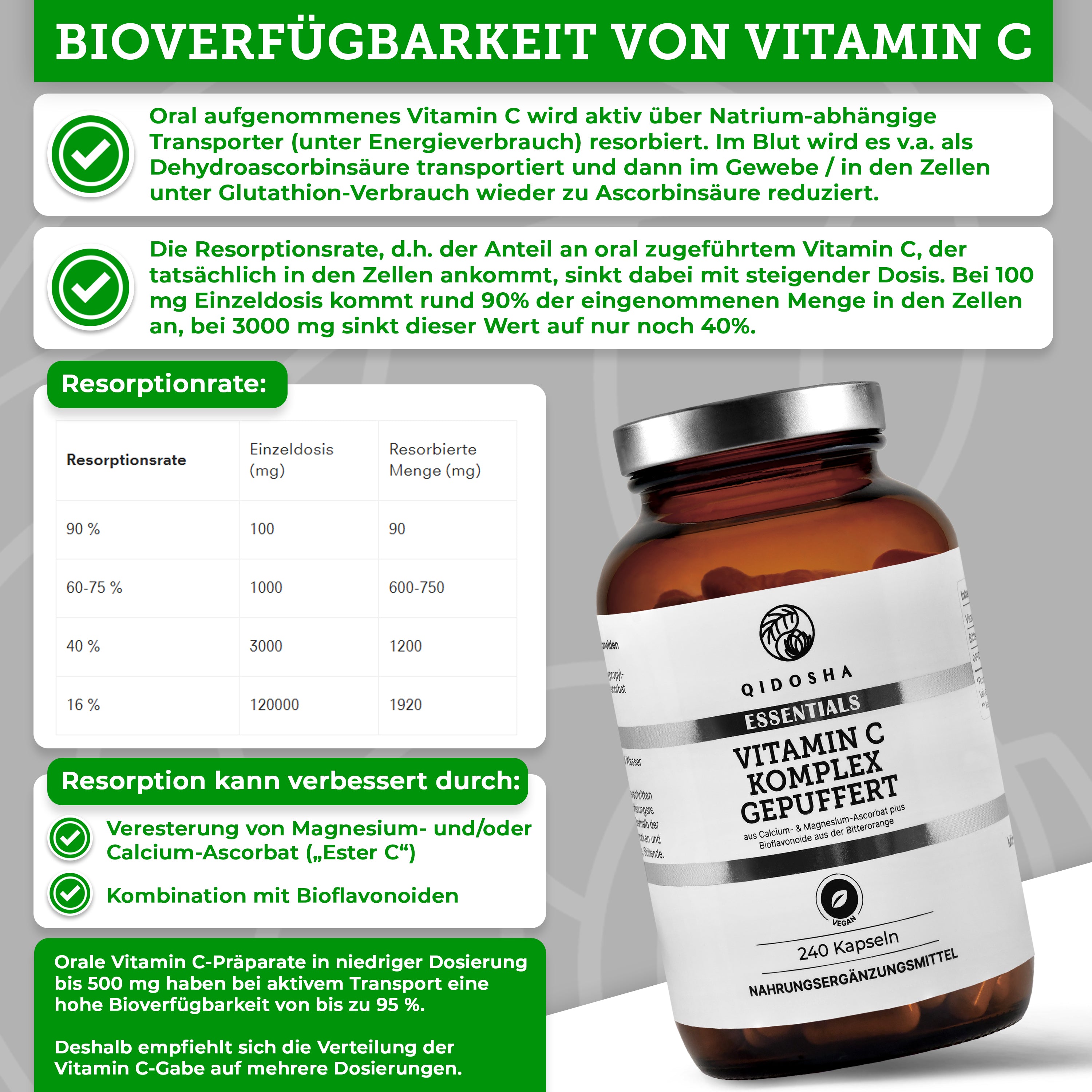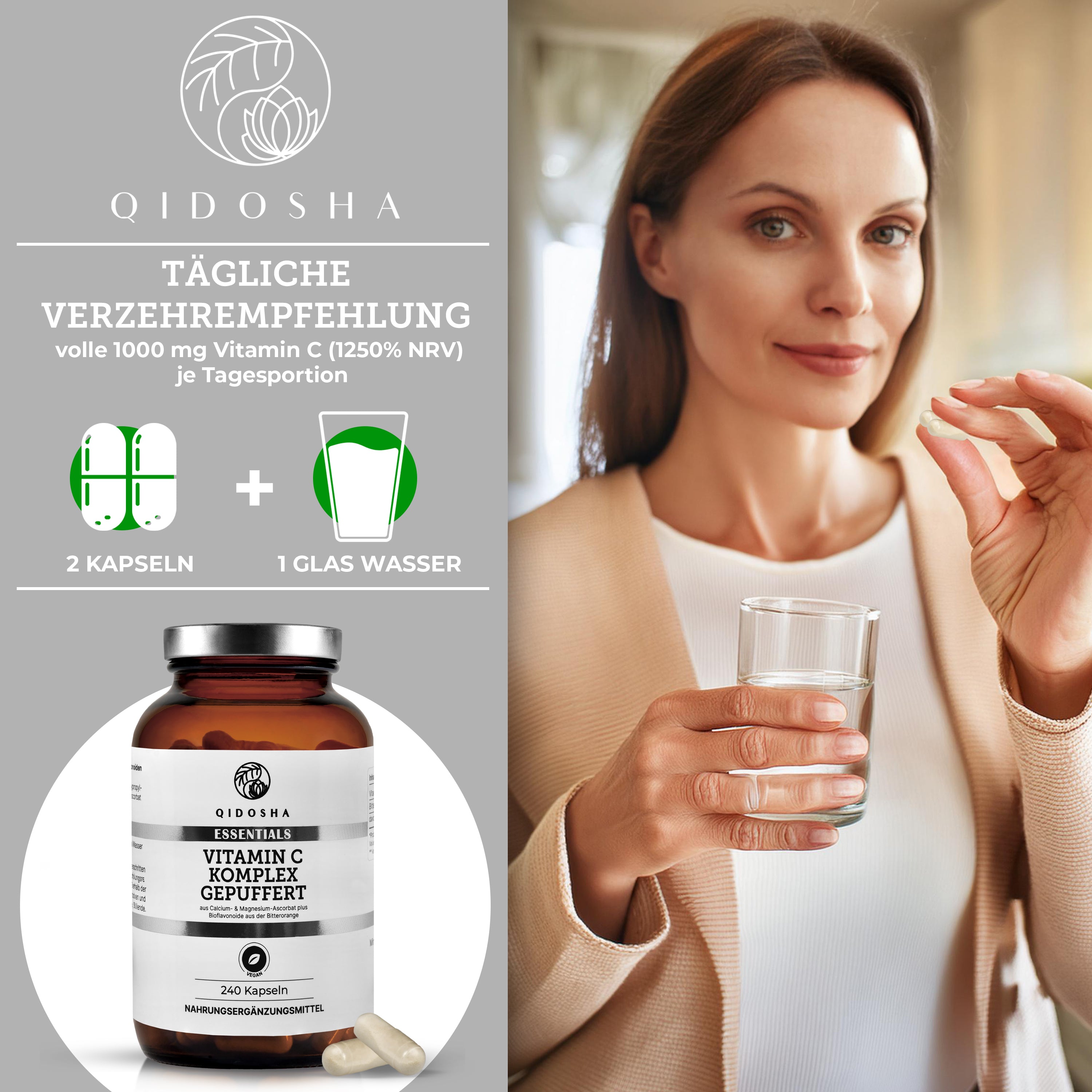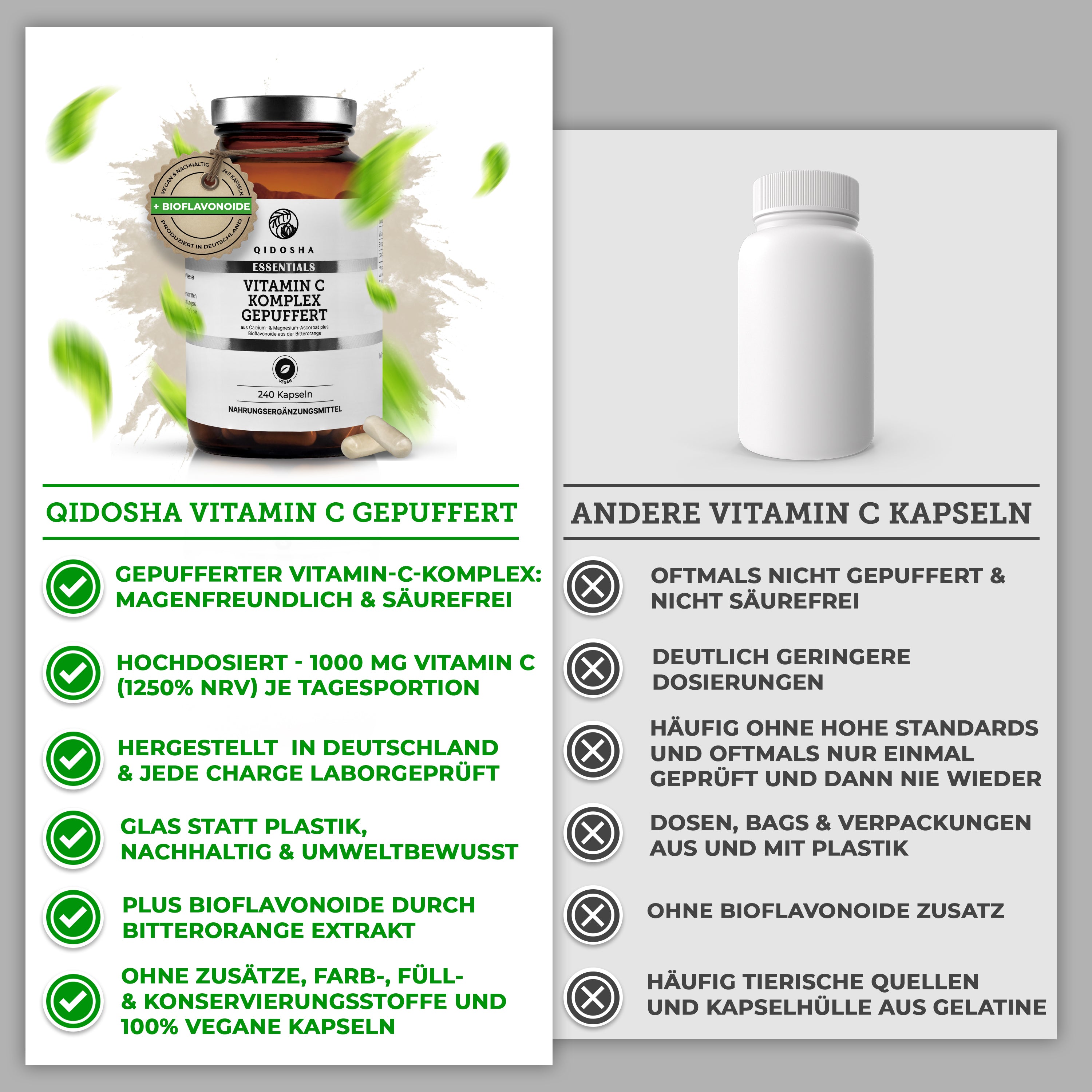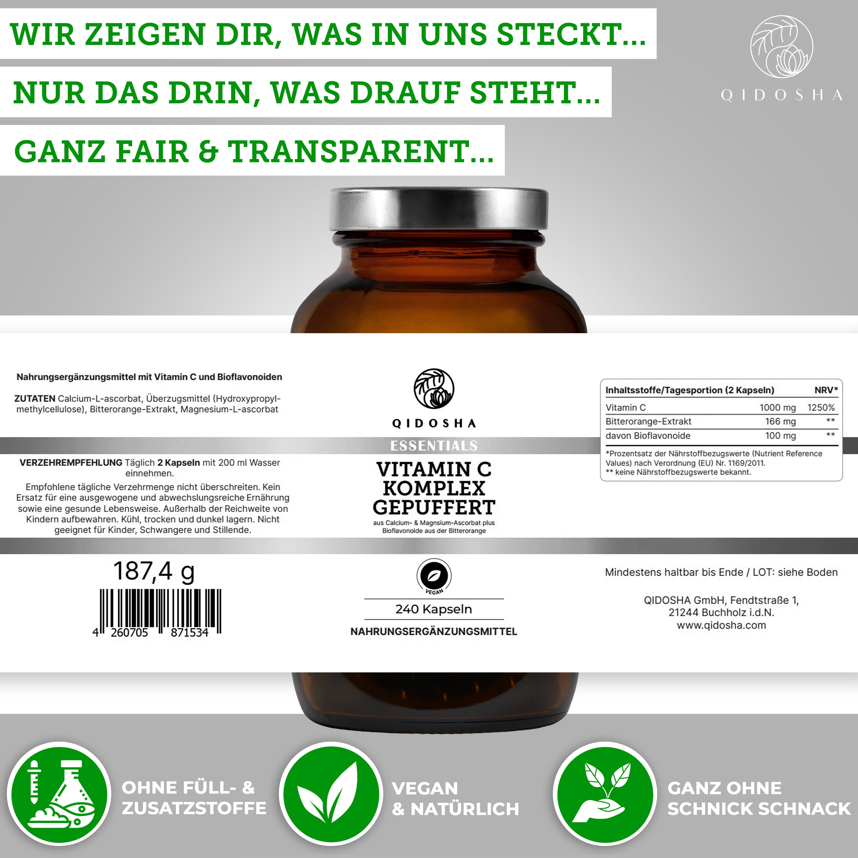 QIDOSHA Vitamin C Komplex gepuffert mit Bioflavonoiden, 240 vegane Kapseln in braunem Glas, laborgeprüft, ohne Zusatzstoffe, magenschonend, hergestellt in Deutschland. Framed Laborzertifikat rechts.