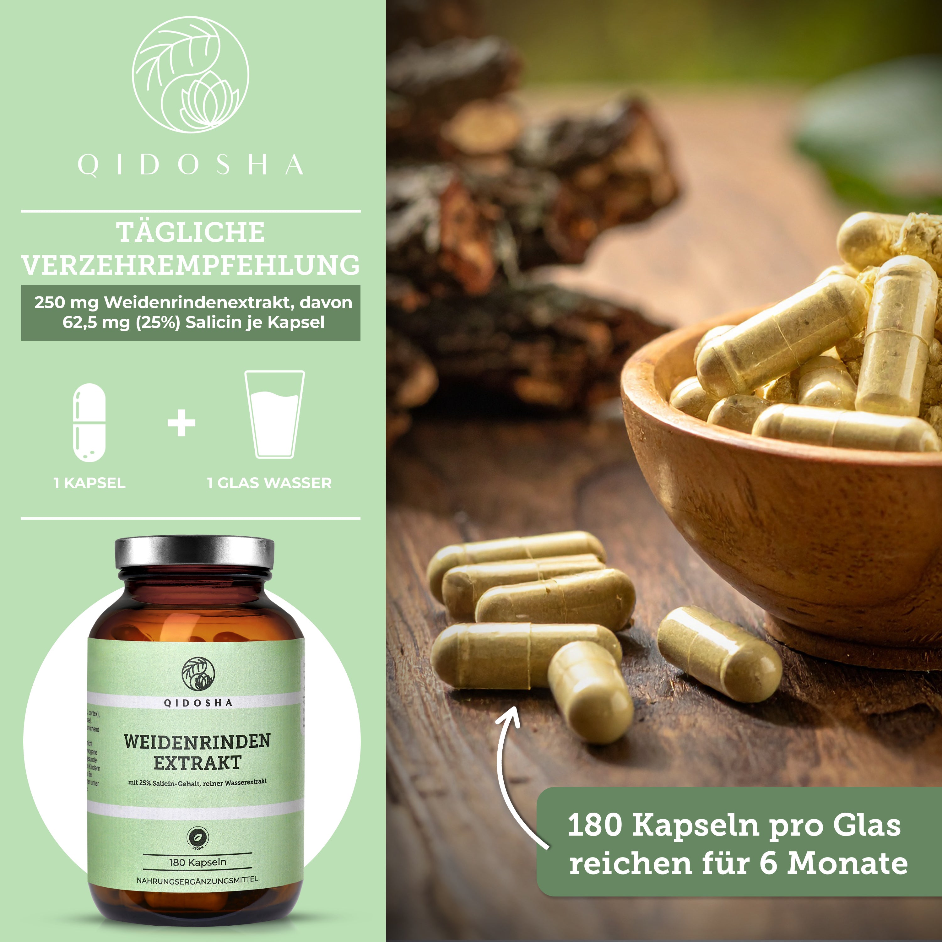 Weidenrinden-Extrakt von QIDOSHA: Premium-Qualität, 180 vegane Kapseln im Glas. Hoher Salicin-Gehalt, laborgeprüft, ohne Zusatzstoffe, nachhaltige Verpackung. Ideal für 6 Monate.