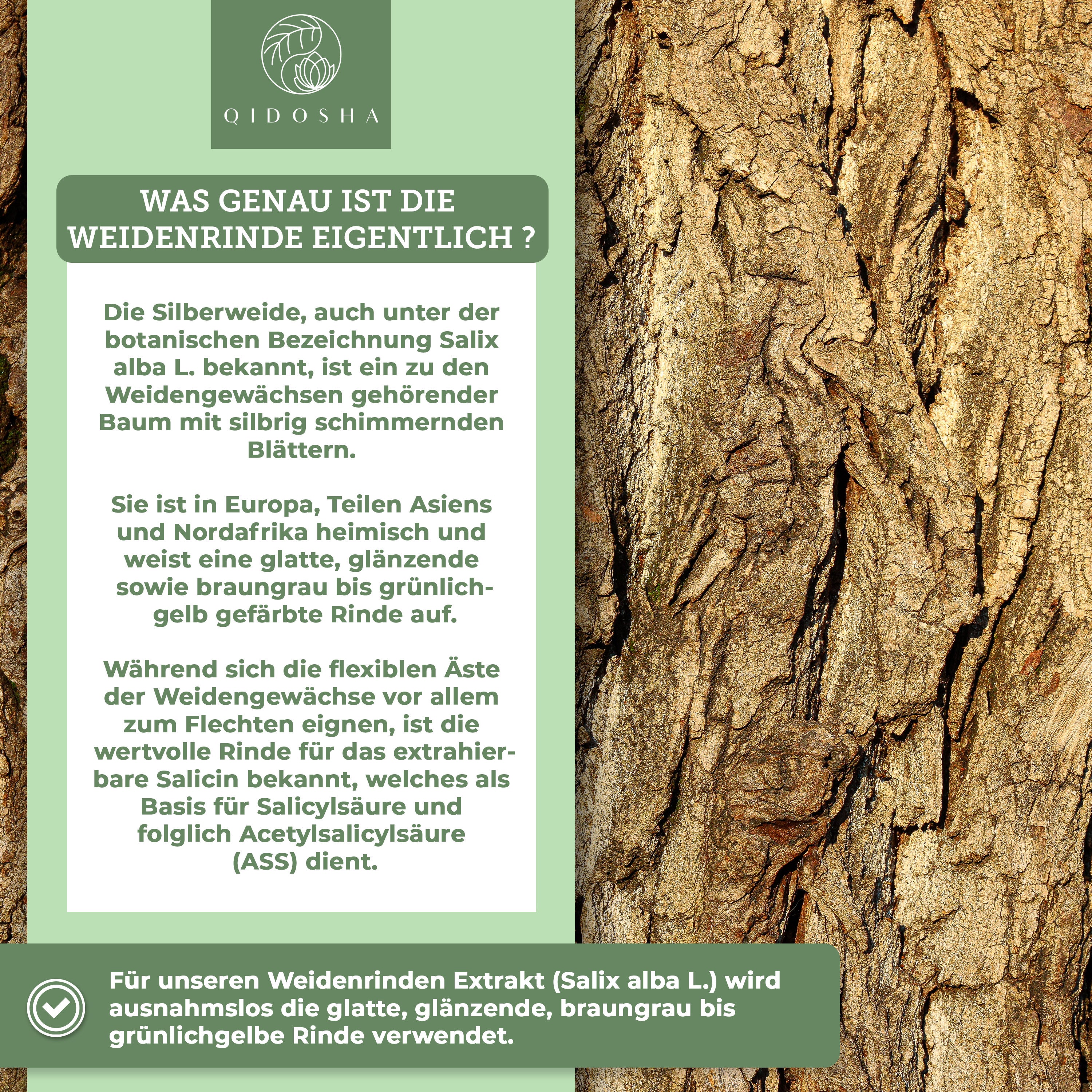 Weidenrinden-Extrakt mit 25% Salicin: Premium-Nahrungsergänzung von QIDOSHA, vegan, laborgeprüft, ohne Magnesiumstearat, in Deutschland hergestellt. Hochwertige Wasserextraktion, nachhaltige Glasverpackung.