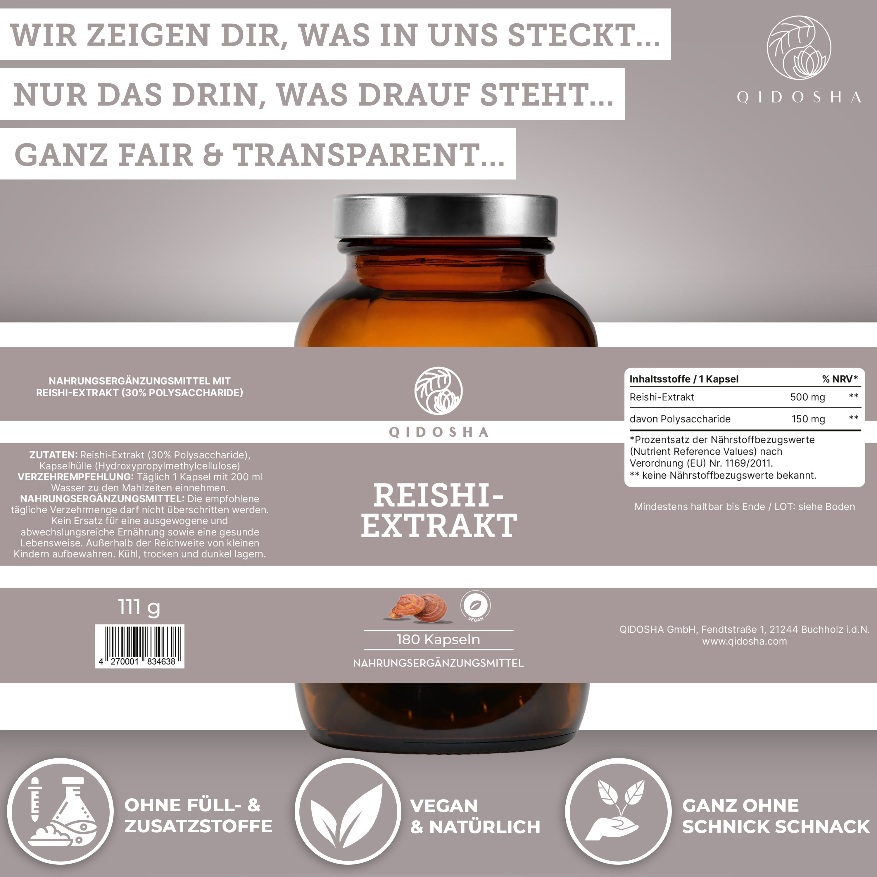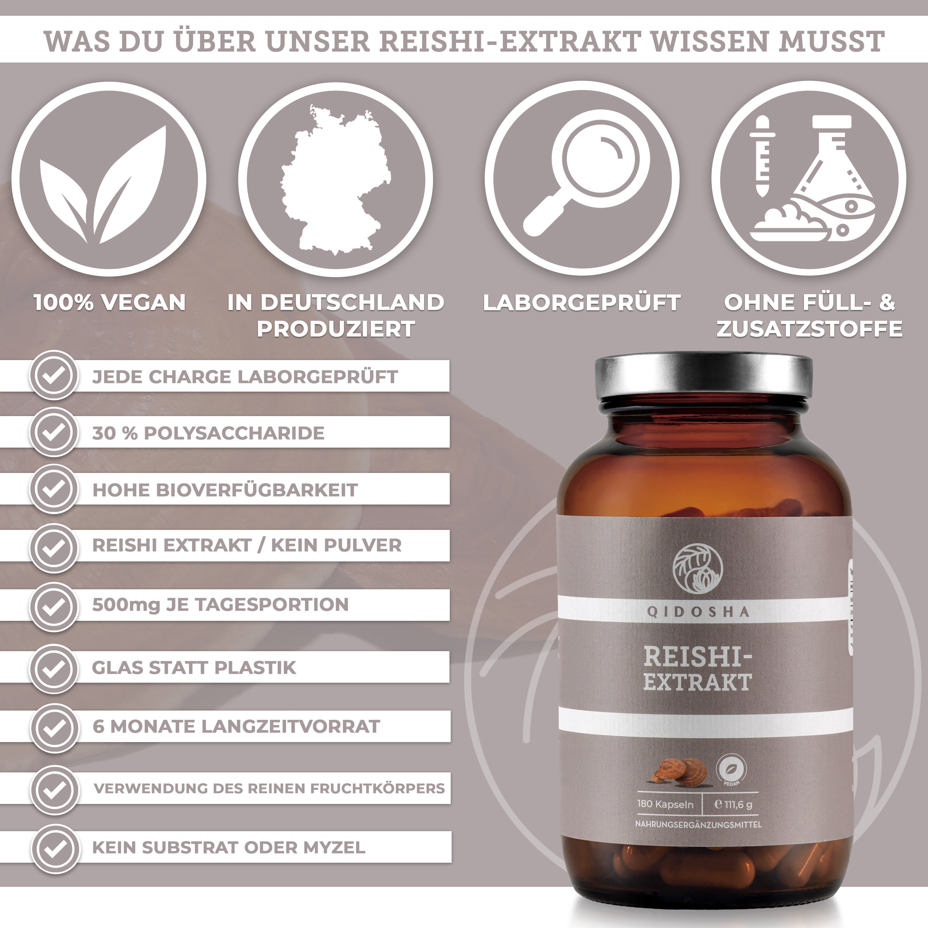 Reishi-Extrakt im Glas: QIDOSHA Premium-Nahrungsergänzungsmittel, 180 Kapseln. Inklusive laborgeprüftem Zertifikat für hohe Qualität, ohne Zusatzstoffe, mit hohem Polysaccharidgehalt.