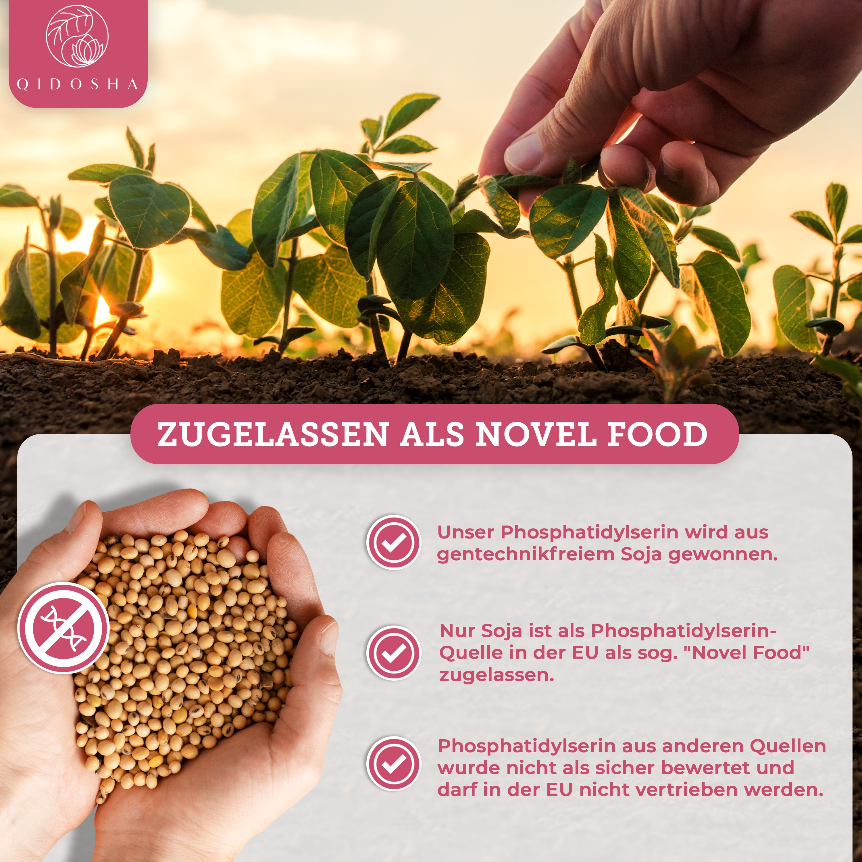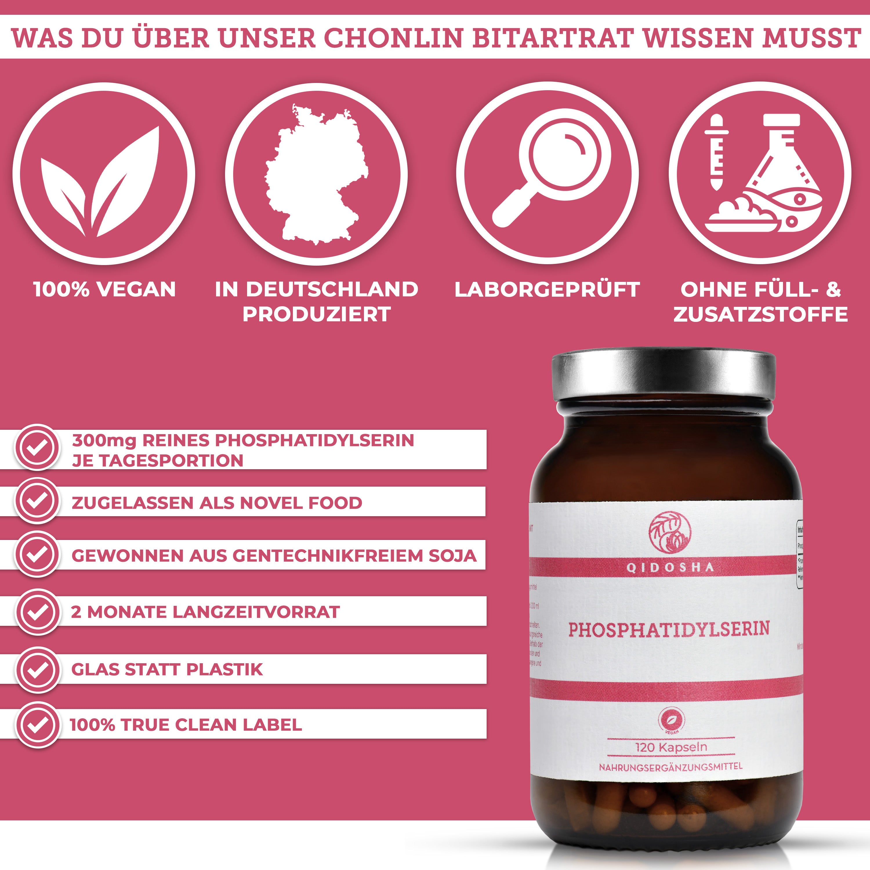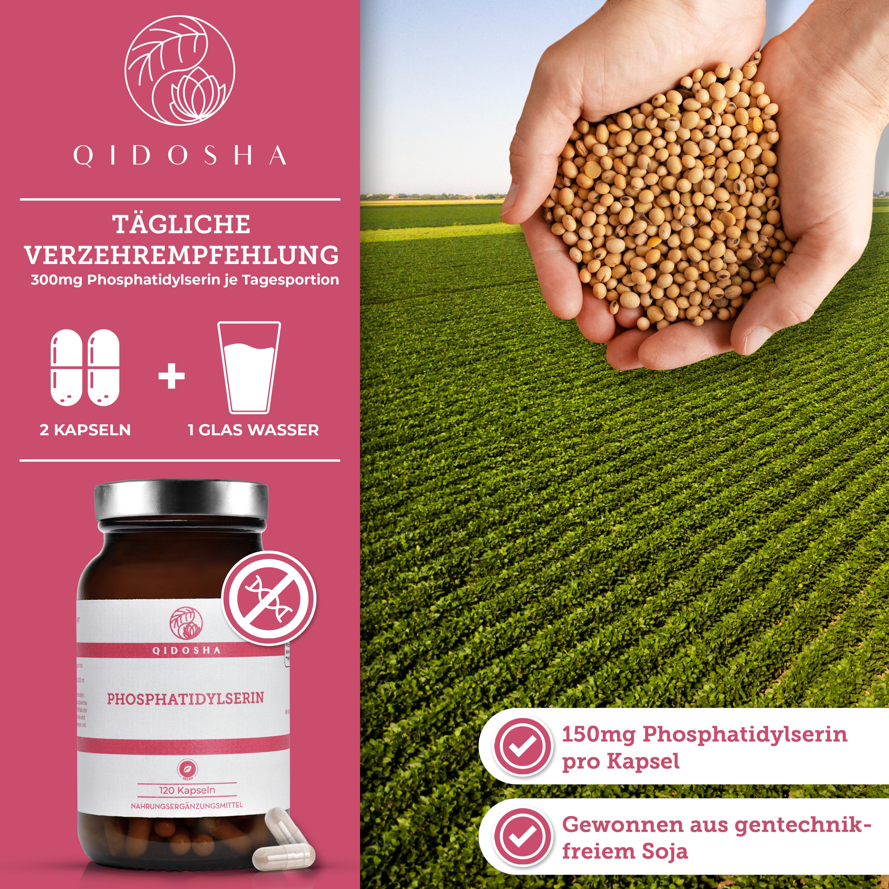 Phosphatidylserin im Glas von QIDOSHA: Premium, veganes Nahrungsergänzungsmittel, nachhaltig in Deutschland hergestellt, laborgeprüfte Qualität ohne Zusatzstoffe, aus gentechnikfreiem Soja gewonnen.