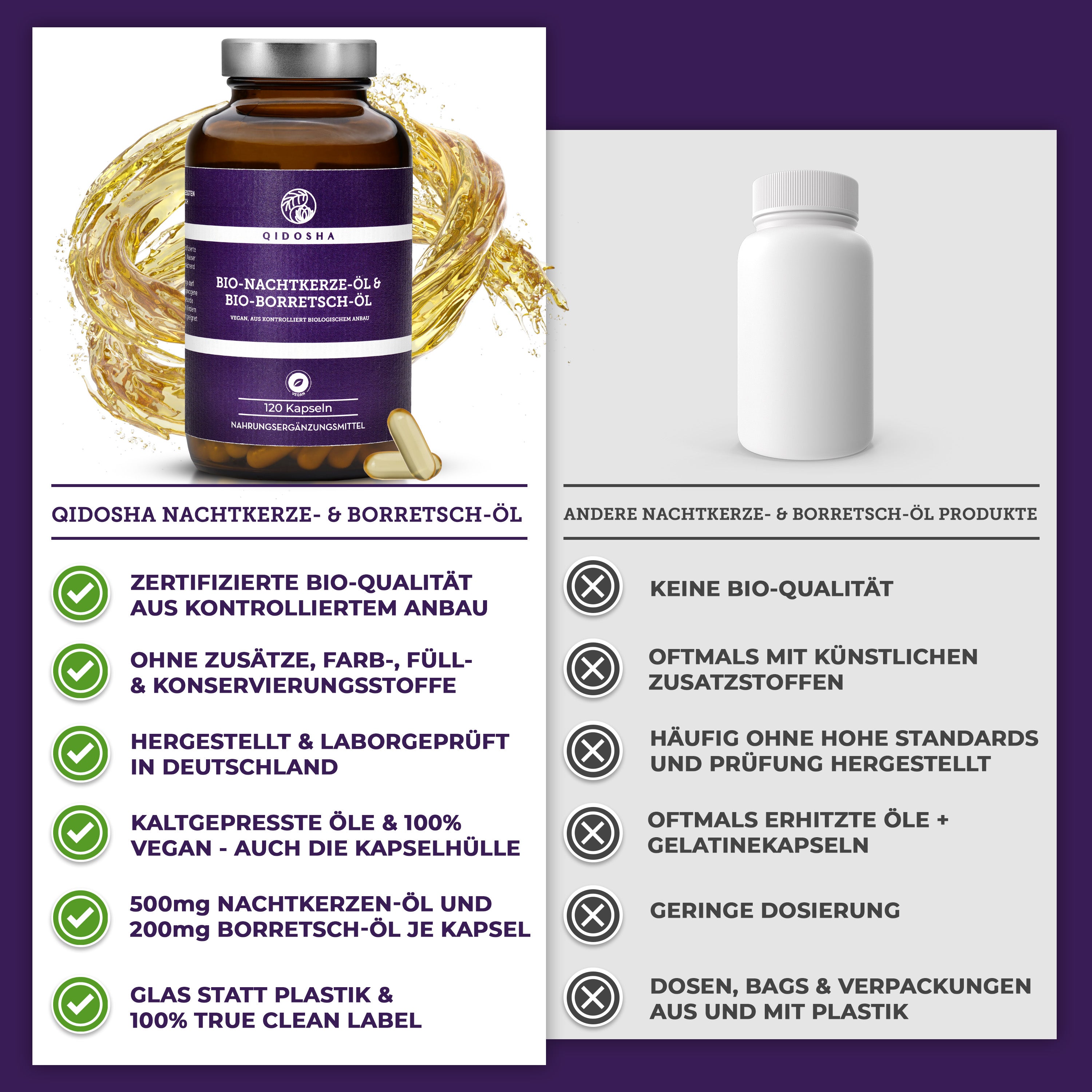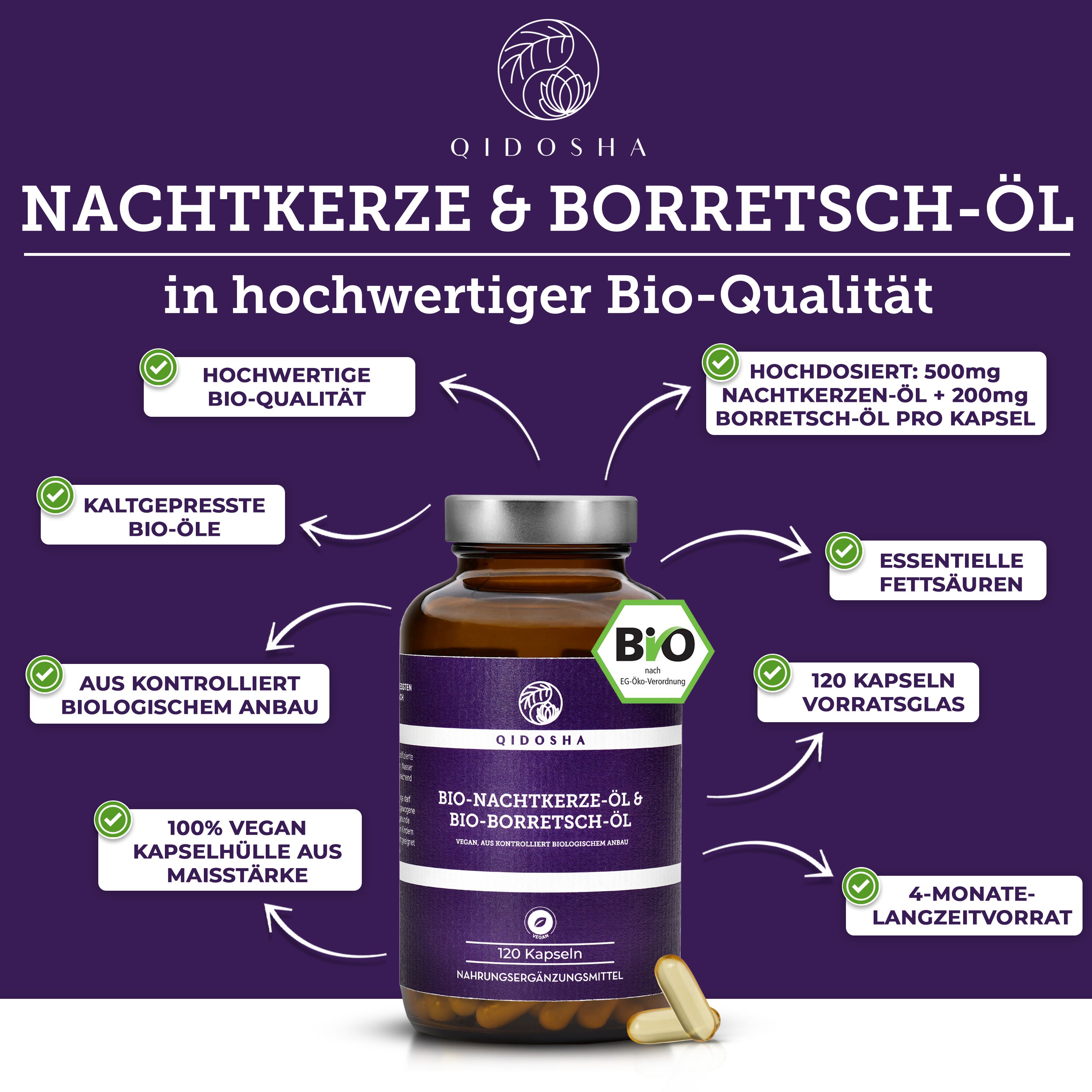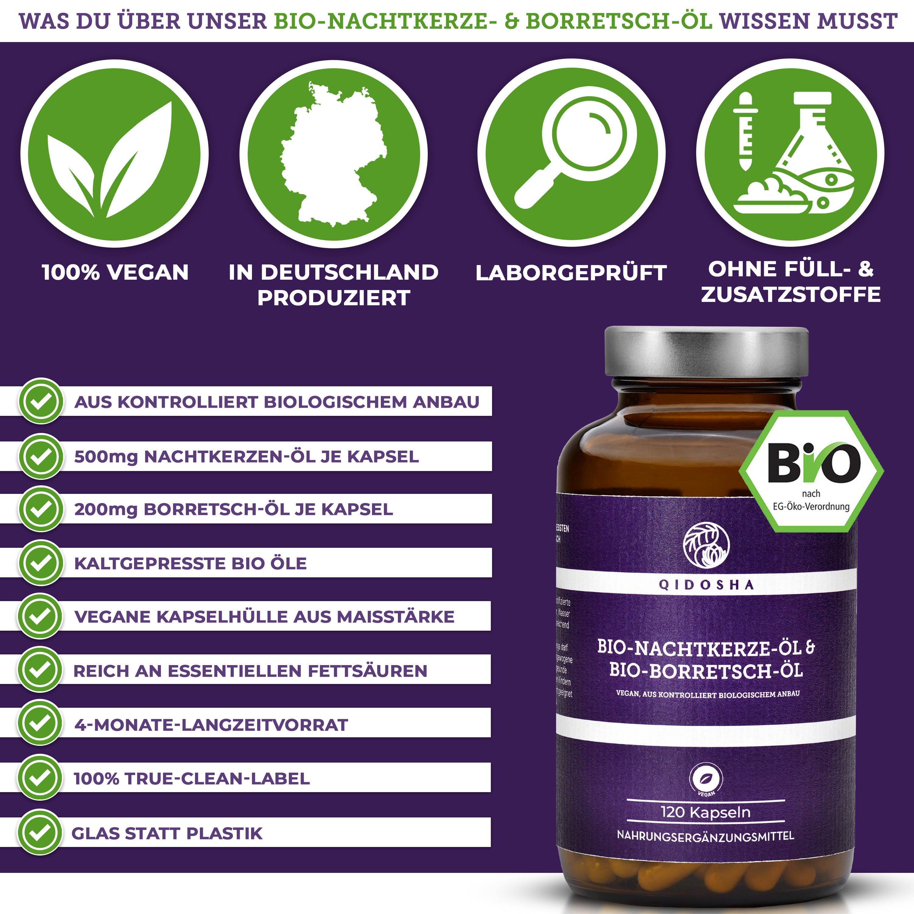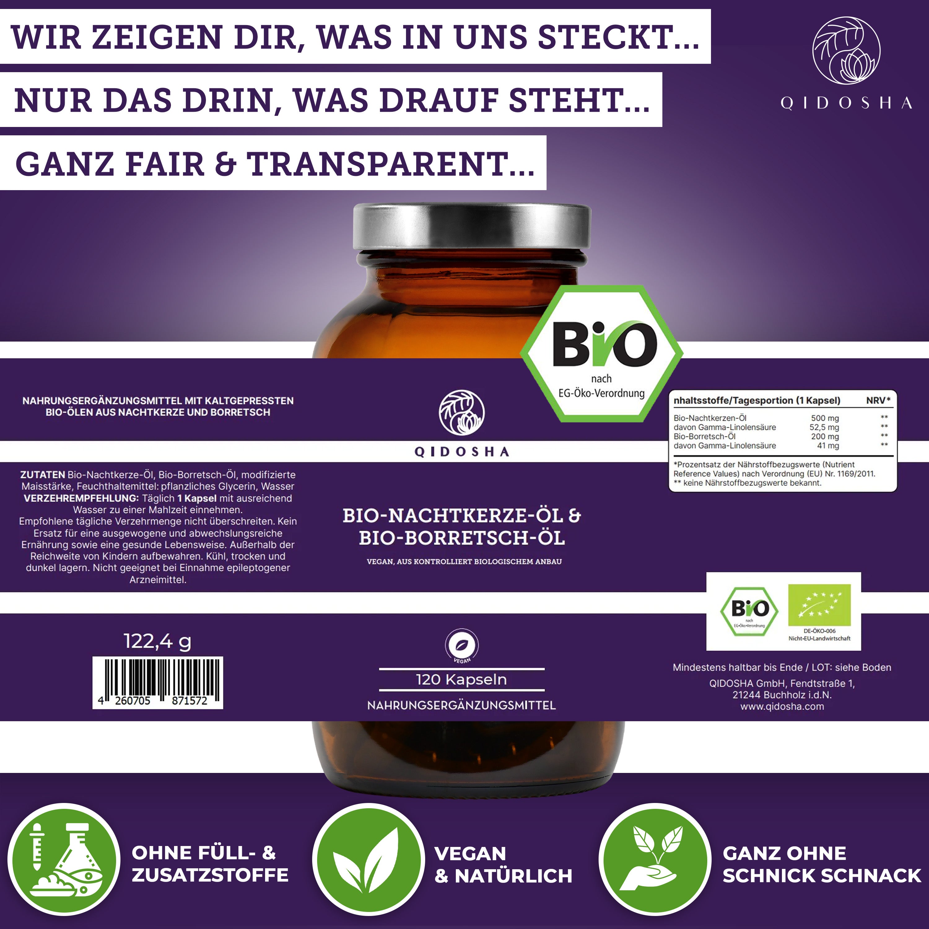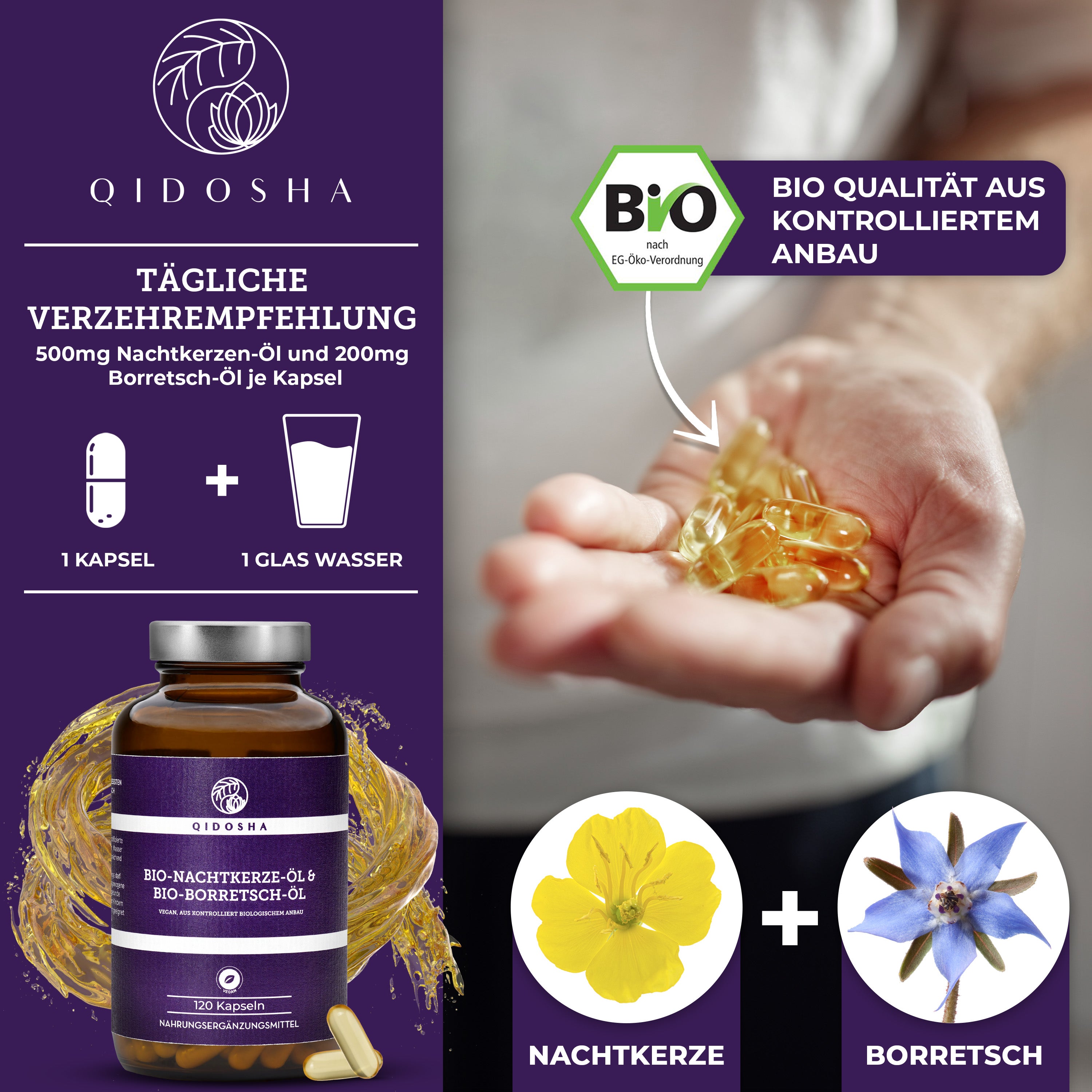 Bio Nachtkerze & Bio Borretsch Öl im Glas: Premium, kaltgepresste, vegane Kapseln mit hoher Qualität, ohne Zusatzstoffe, aus fairer, nachhaltiger Herstellung in Deutschland, von QIDOSHA.