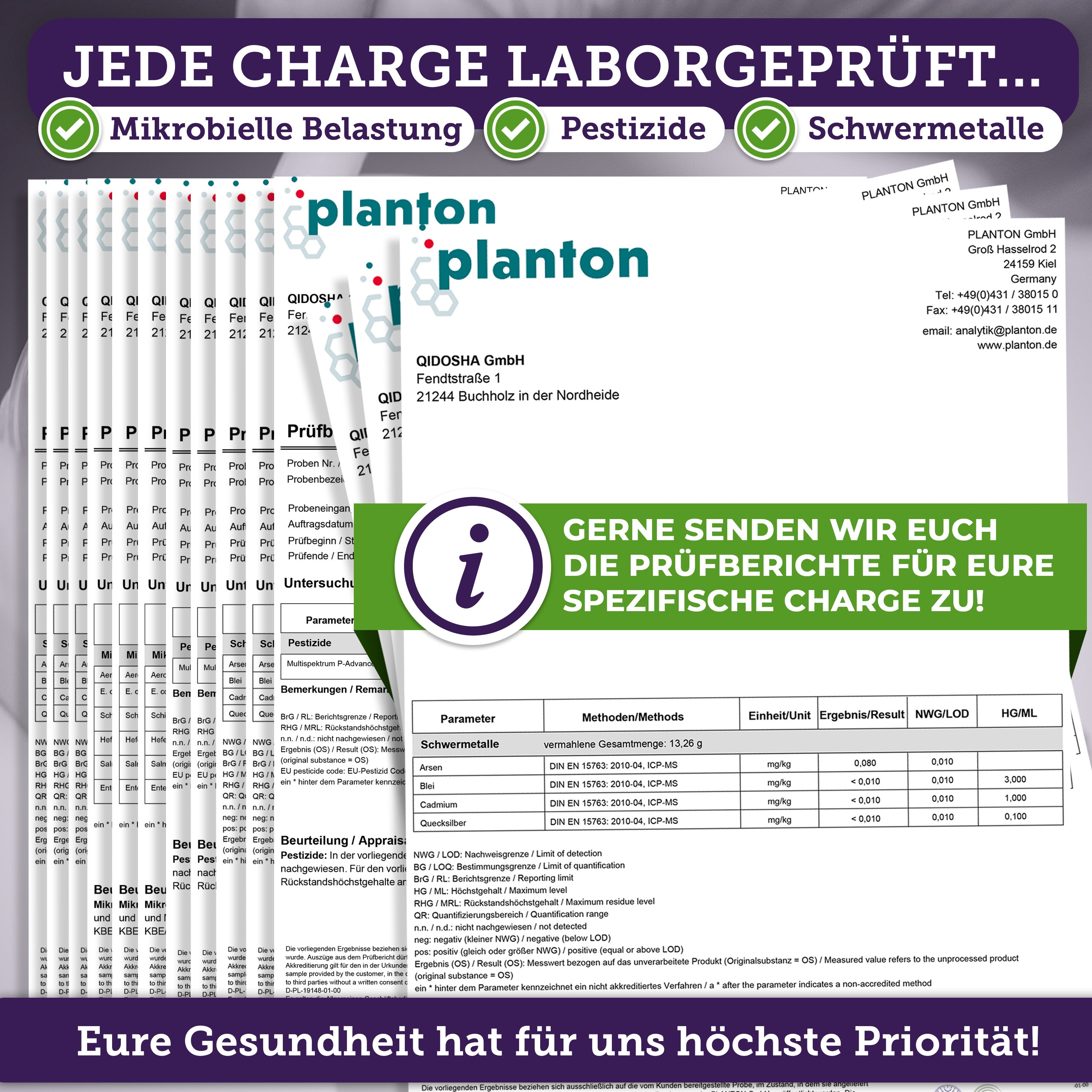 Unsere Produkte werden durch externe Labore u.a. auf mikrobielle Belastung, Schwermetalle, Pestizide und Wirkstoffgehalt geprüft.