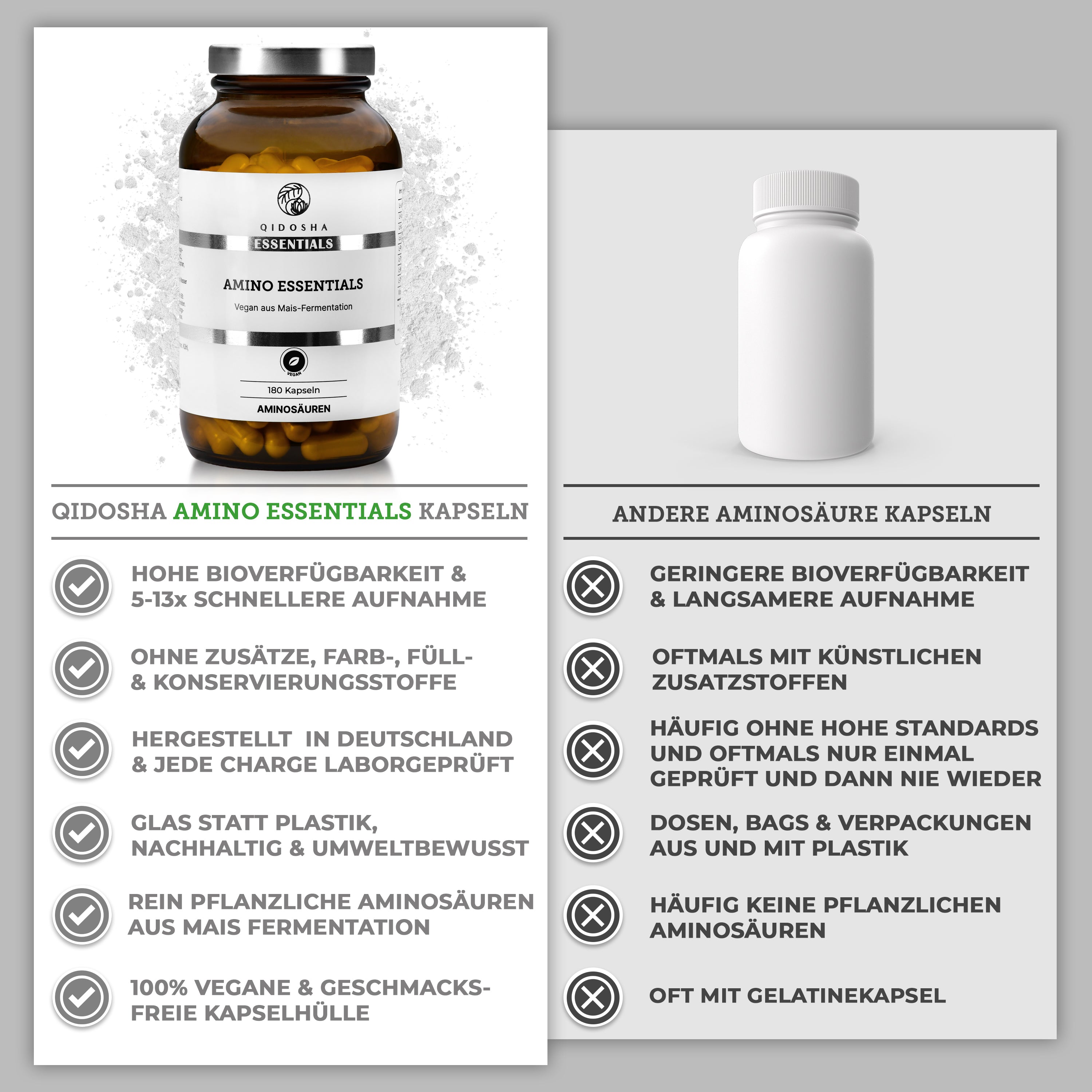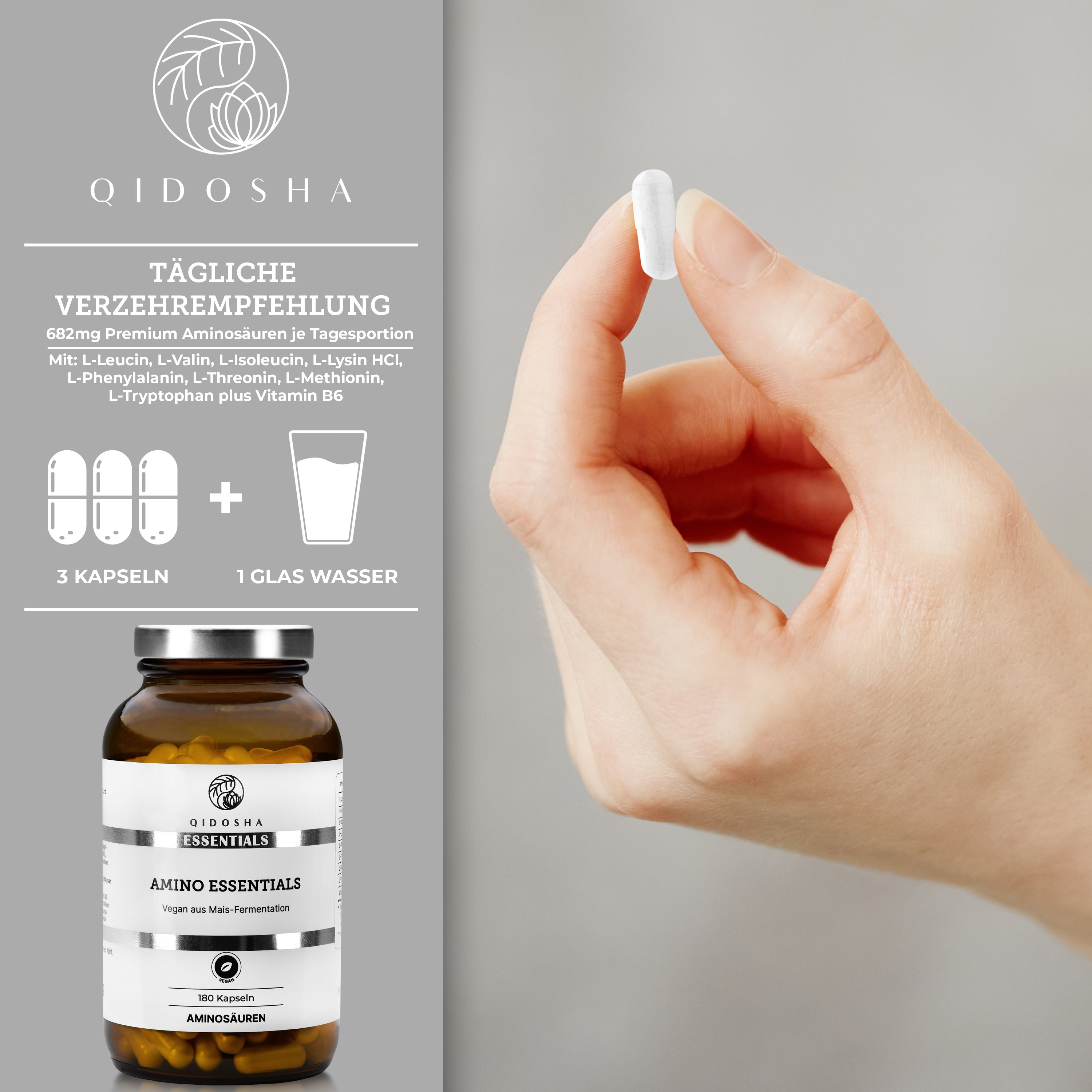 QIDOSHA ESSENTIALS – Amino Essentials: Premium-Glas mit veganen Kapseln, laborgeprüfter Master Aminosäuren Komplex plus Vitamin B6, frei von Füllstoffen, für optimale Proteinsynthese.