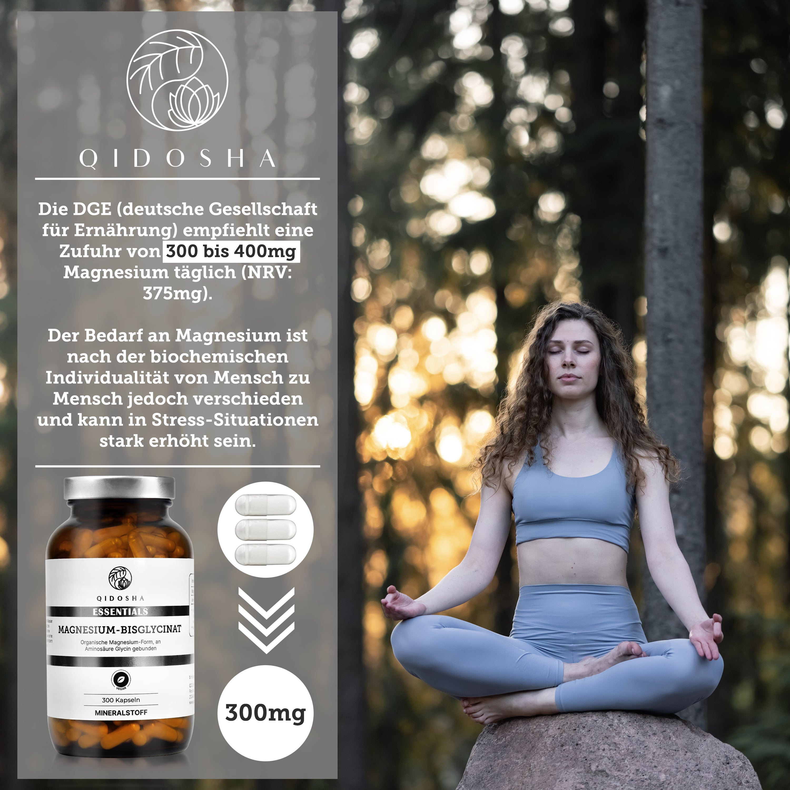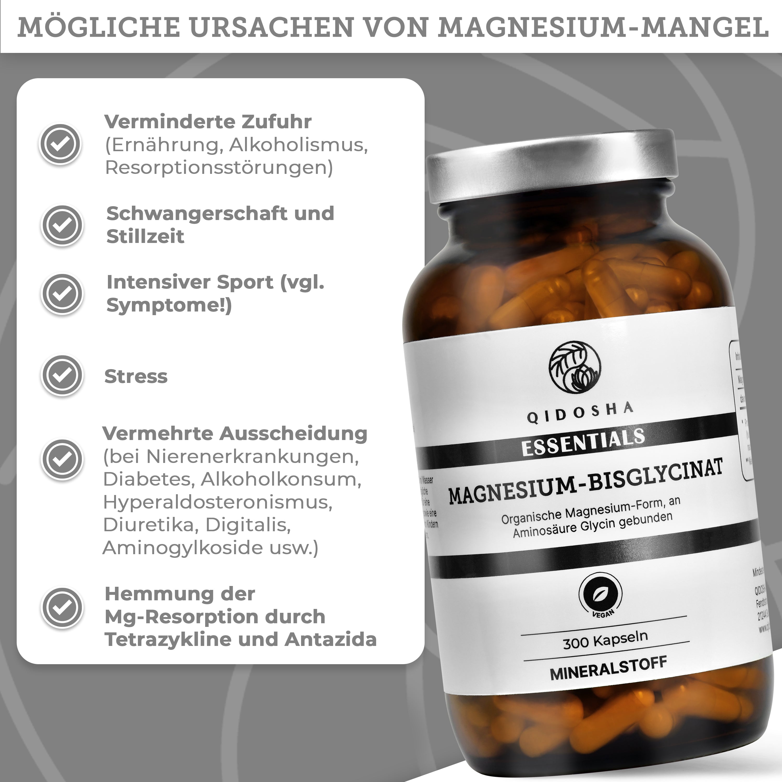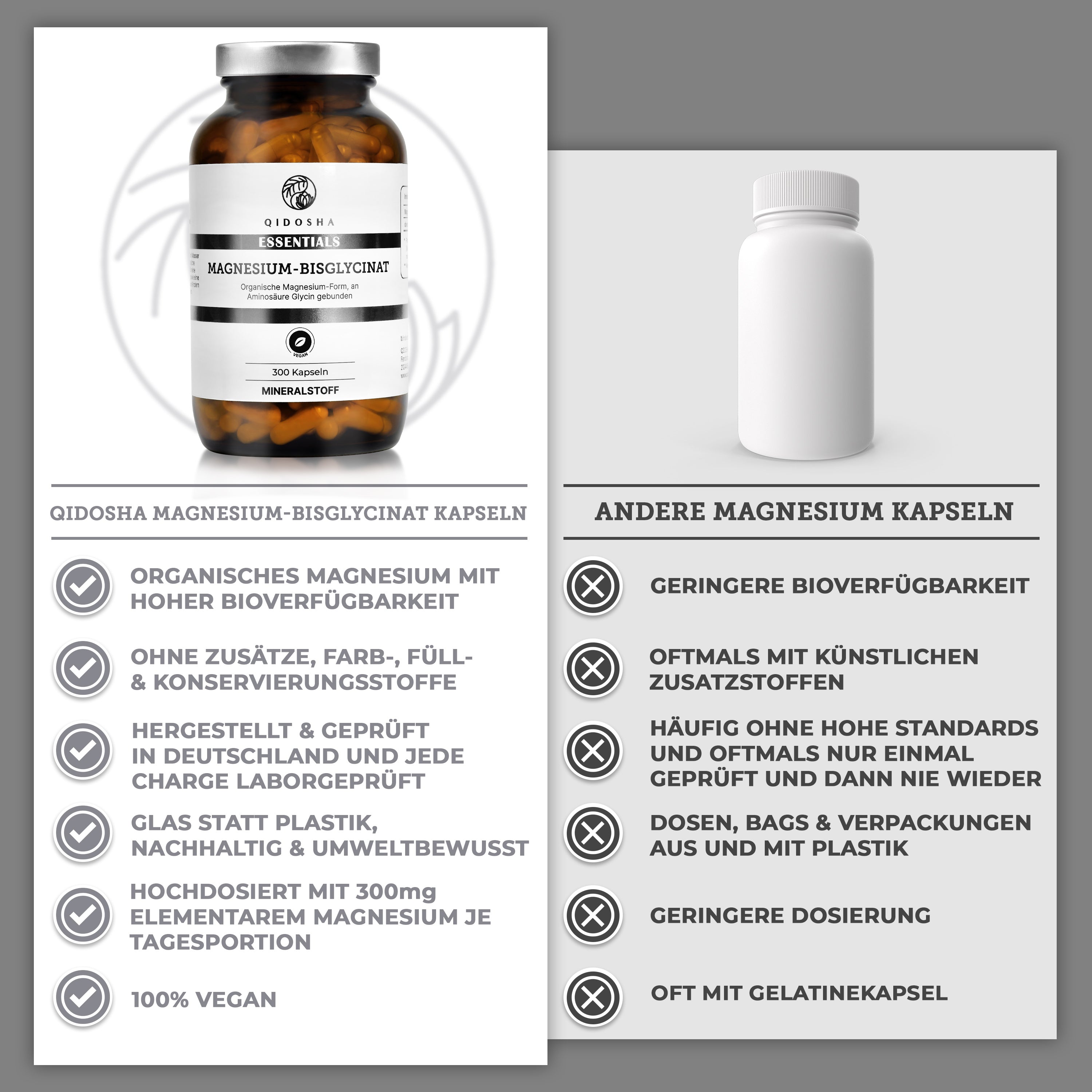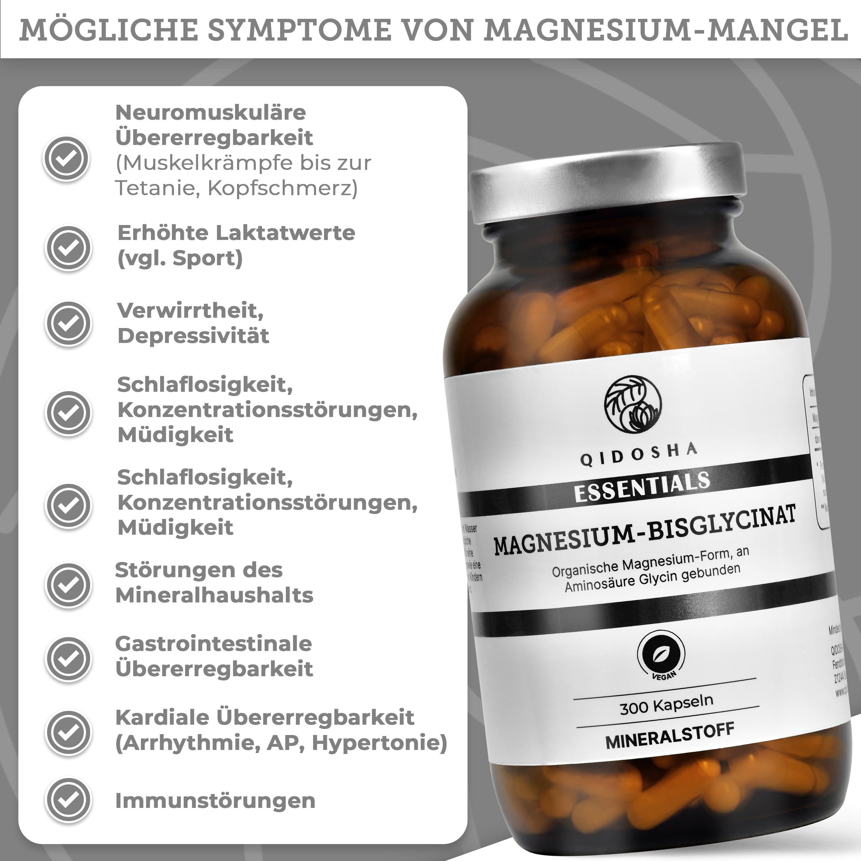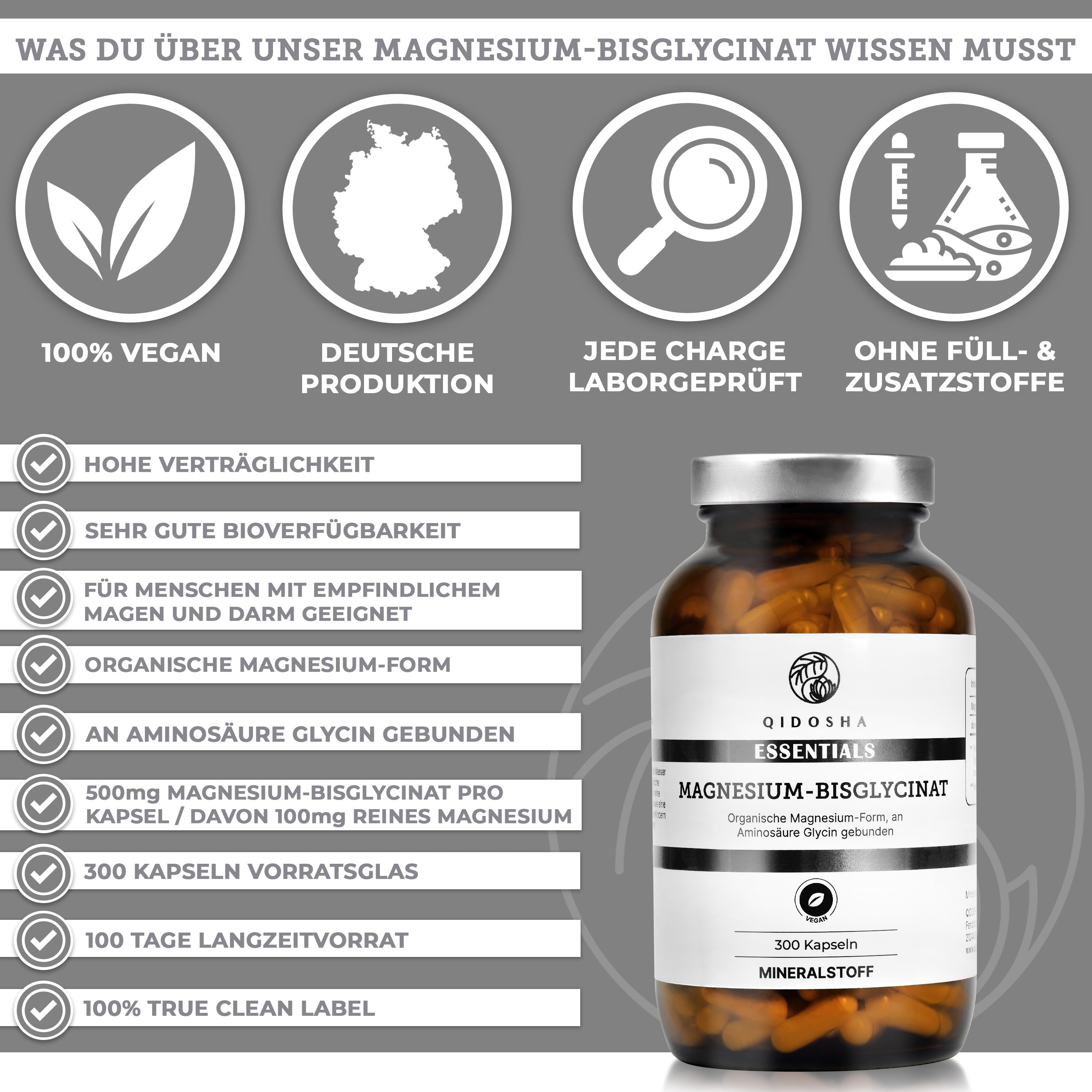 Magnesium-Bisglycinat im Glas: Premium, laborgeprüftes Nahrungsergänzungsmittel von Qidosha. 300 vegane Kapseln, organisch, ohne Zusatzstoffe, hohe Verträglichkeit und Bioverfügbarkeit.