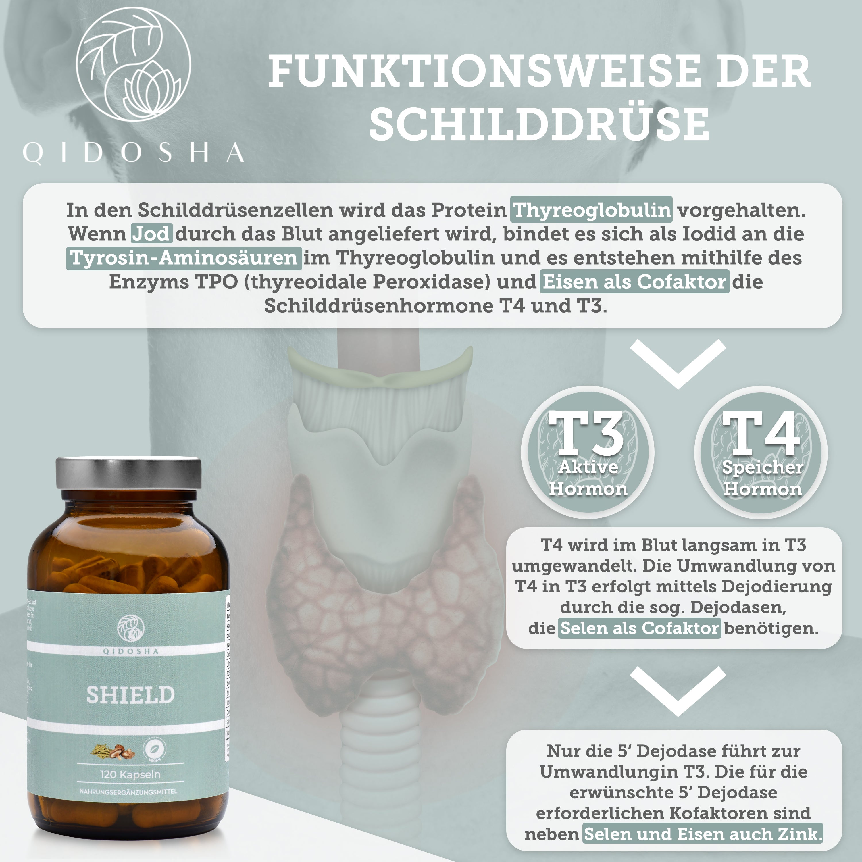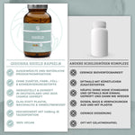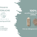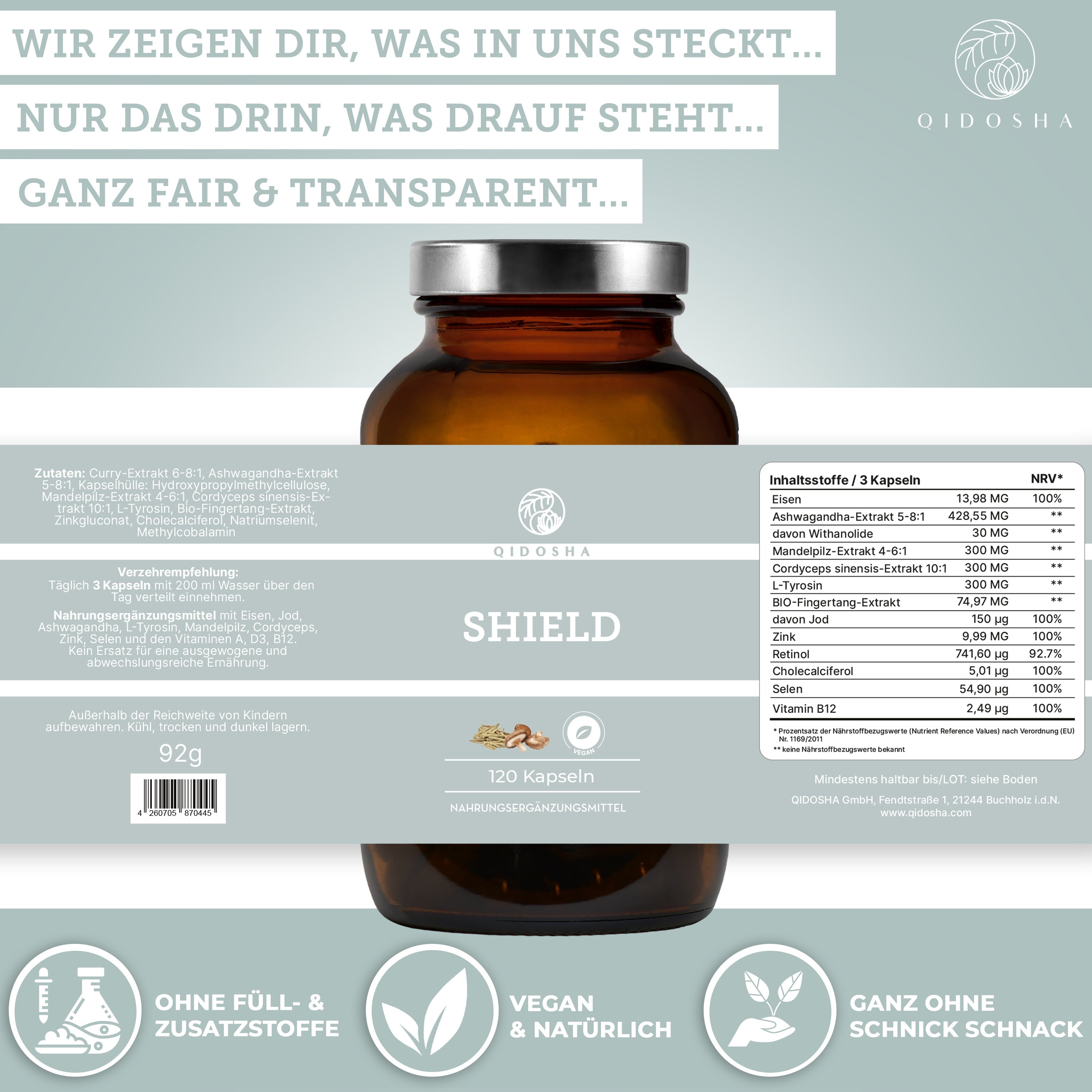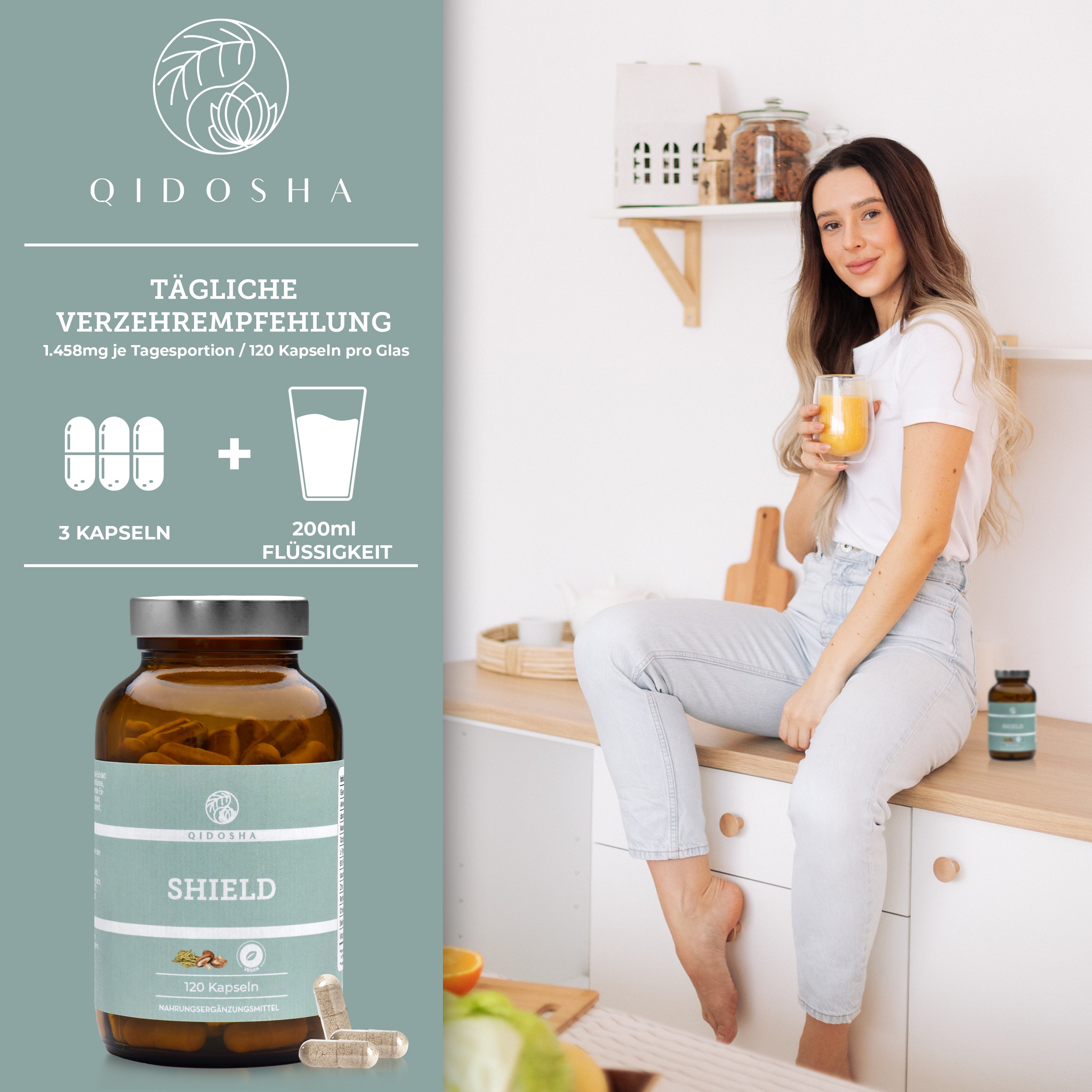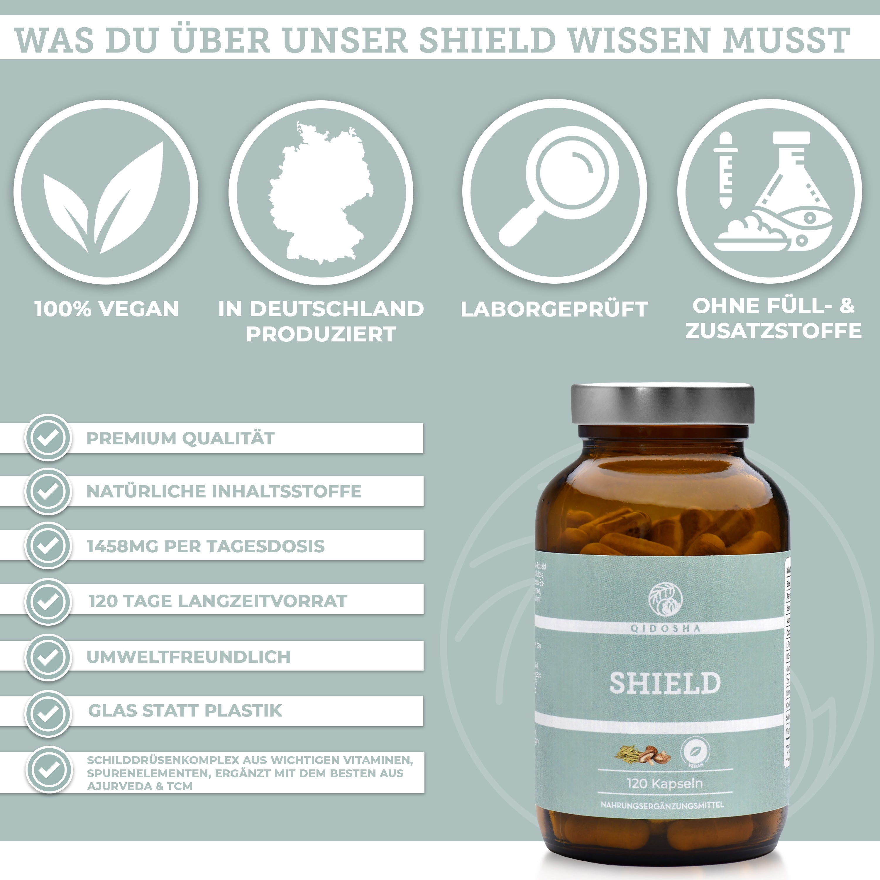Braunes Glas mit 120 veganen QIDOSHA SHIELD-Kapseln. Premium Nahrungsergänzungsmittel, laborgeprüft, ohne Zusatzstoffe, mit ayurvedischen und TCM-Extrakten, produziert in Deutschland.