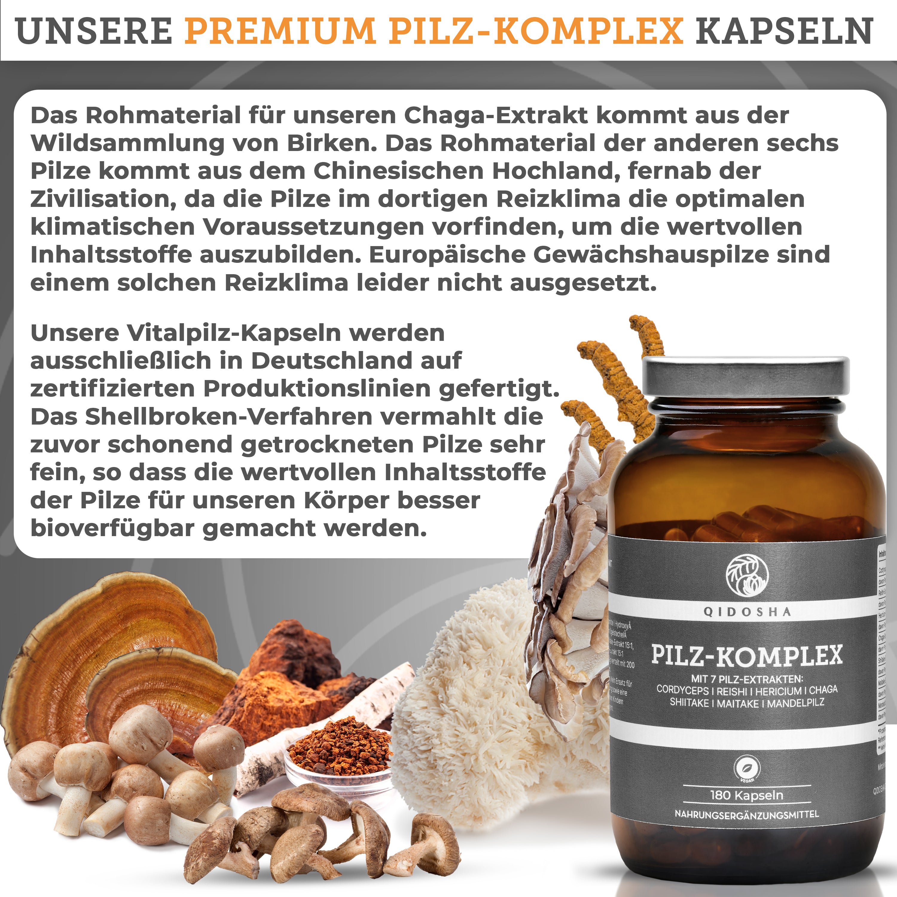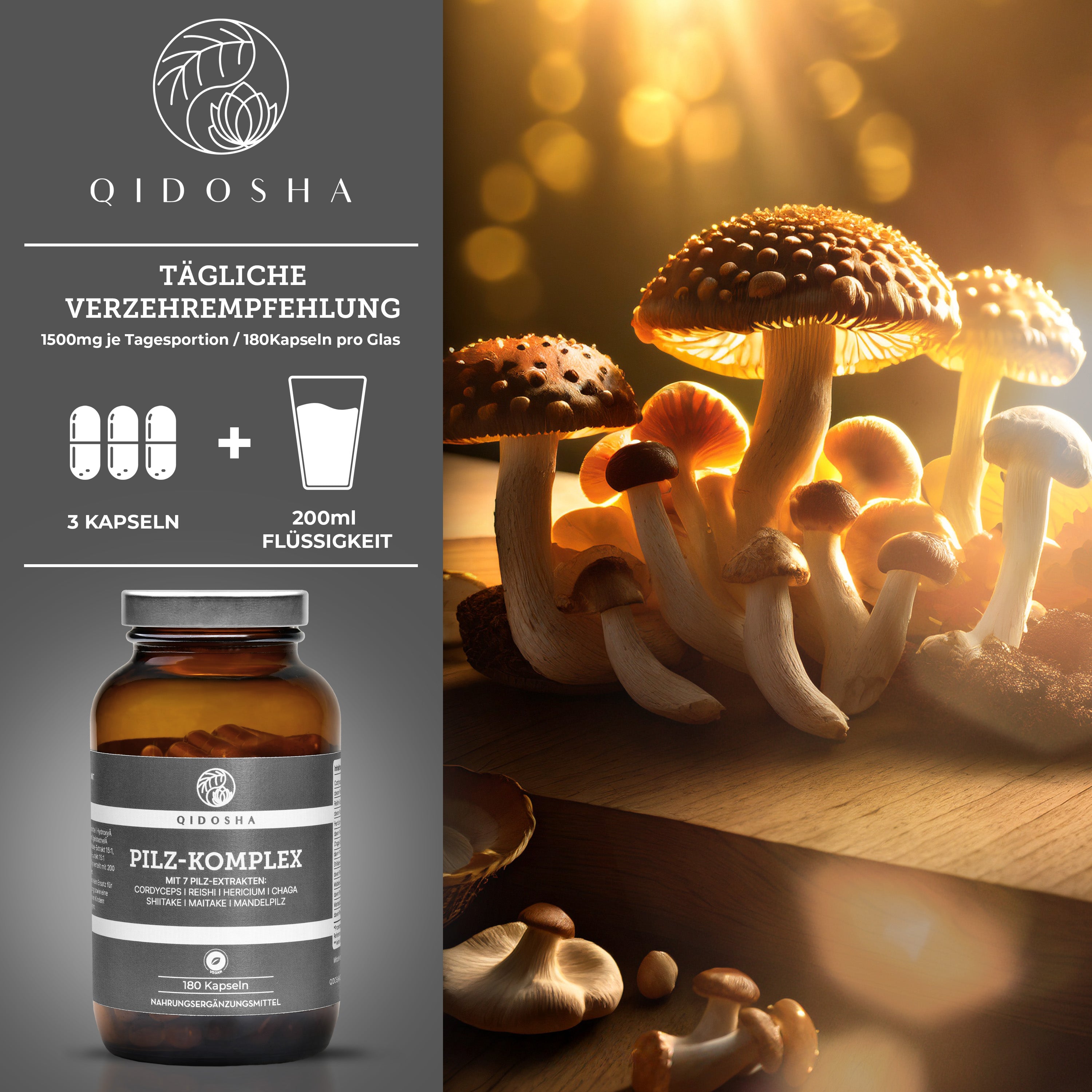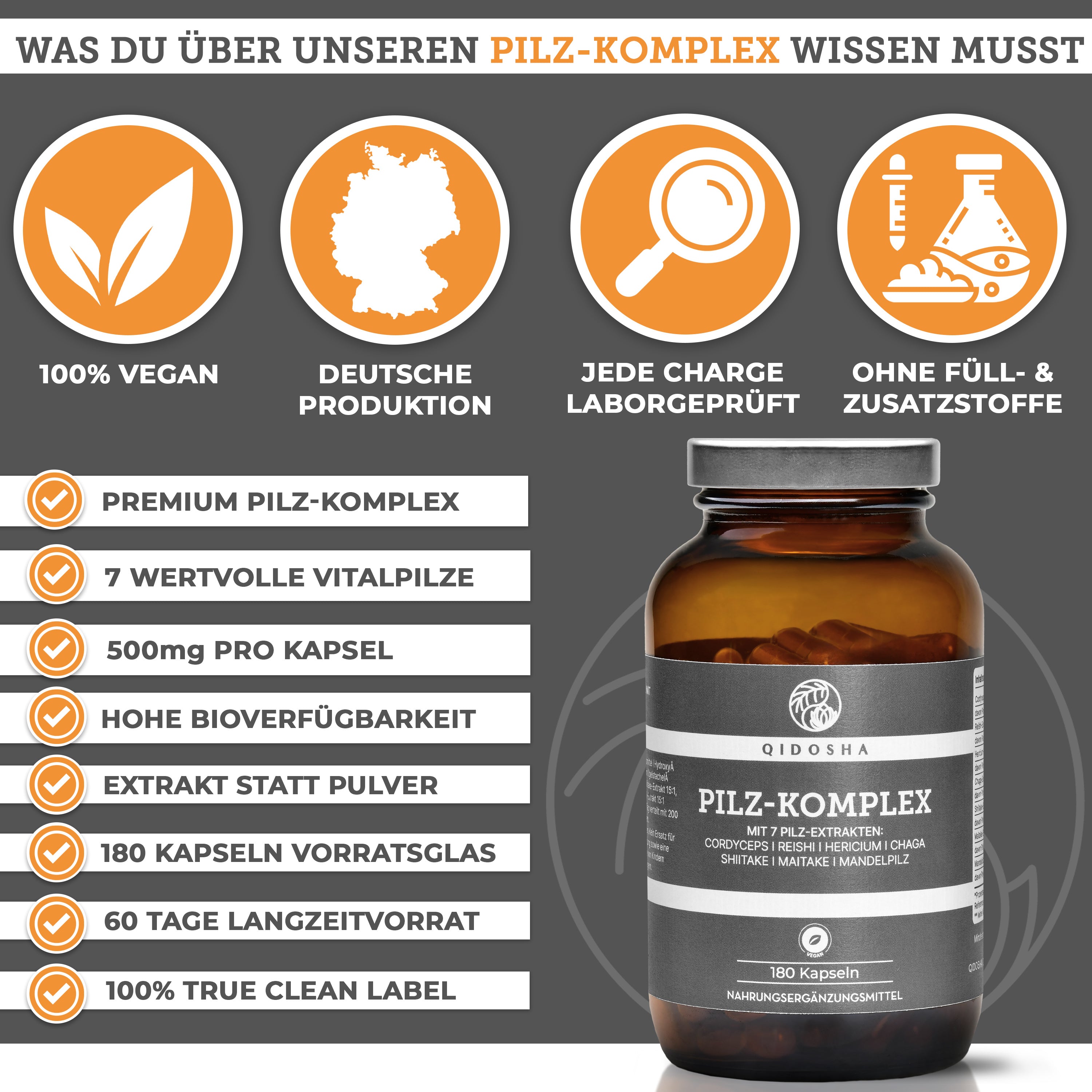 Pilz Komplex im Glas: Premium Nahrungsergänzungsmittel mit sieben Vitalpilz-Extrakten, 180 vegane Kapseln, hergestellt in Deutschland, laborgeprüfte Qualität, ohne Füll- oder Zusatzstoffe.