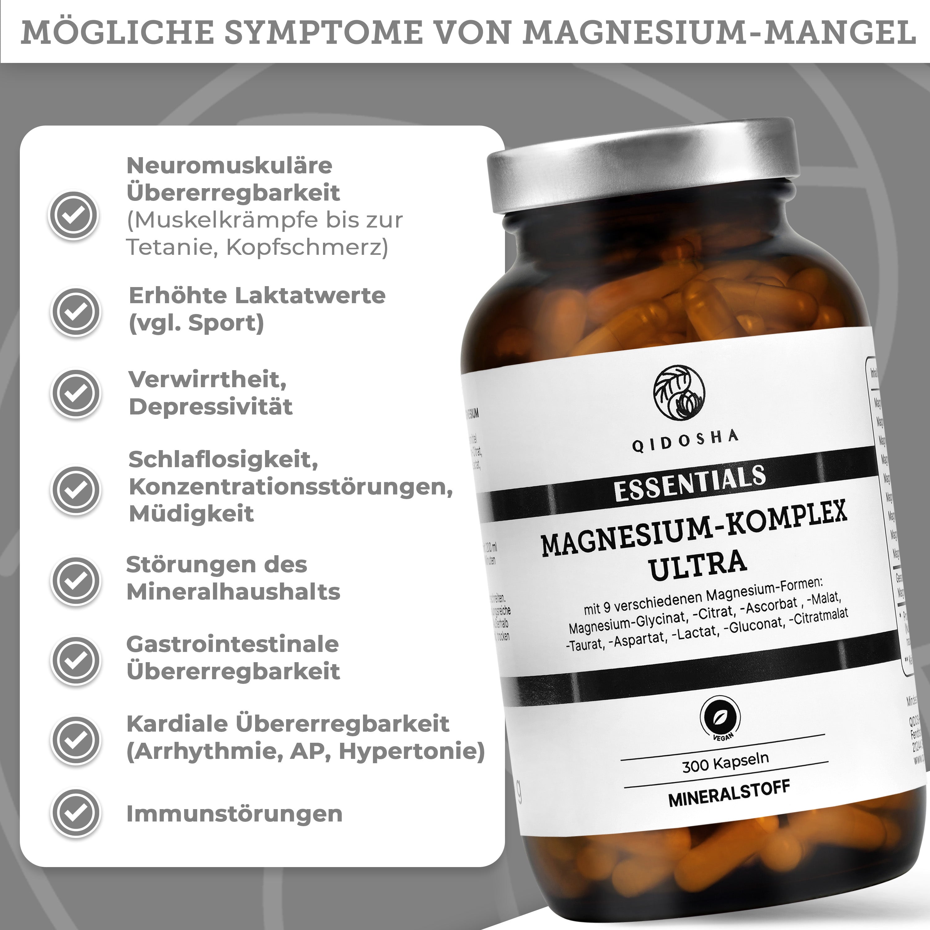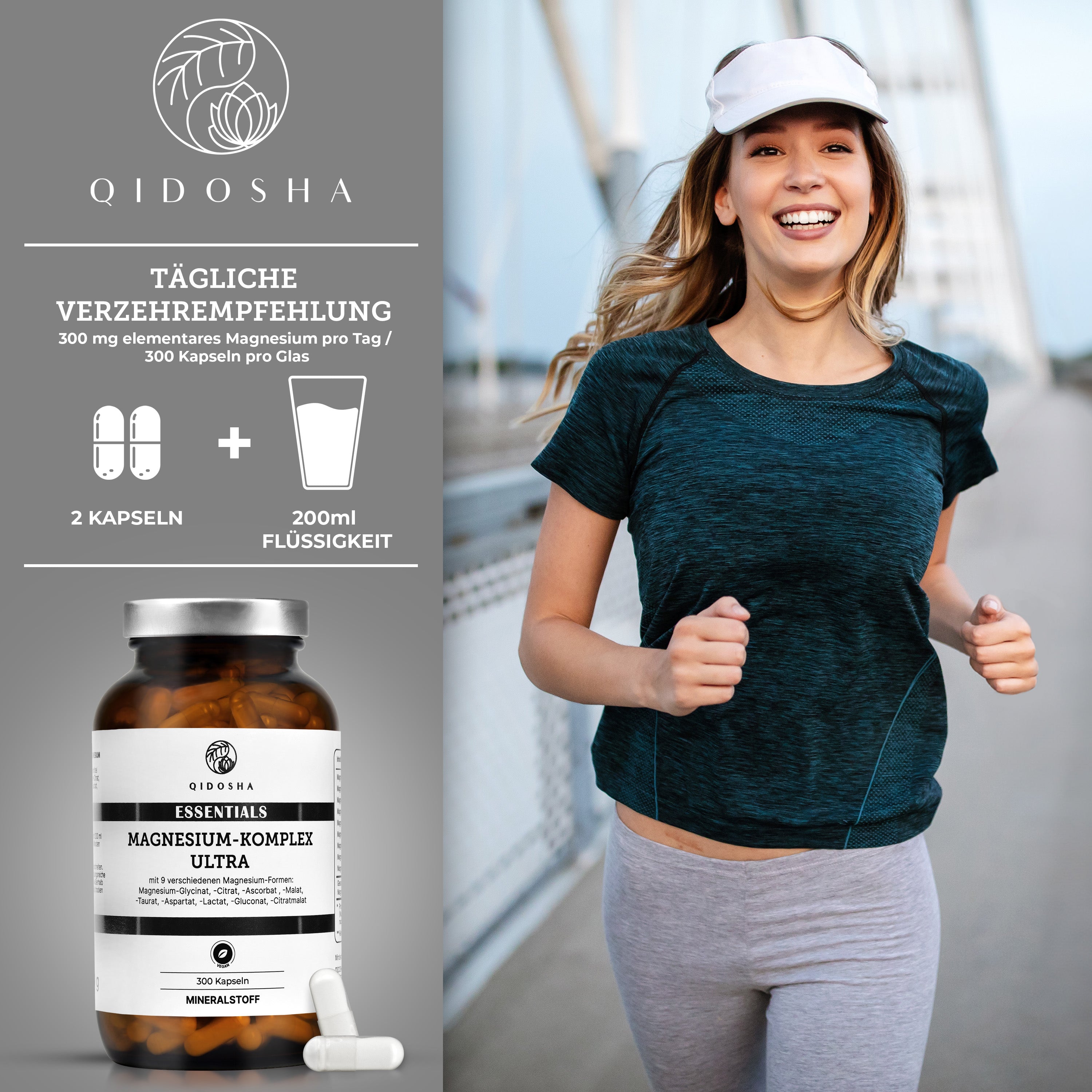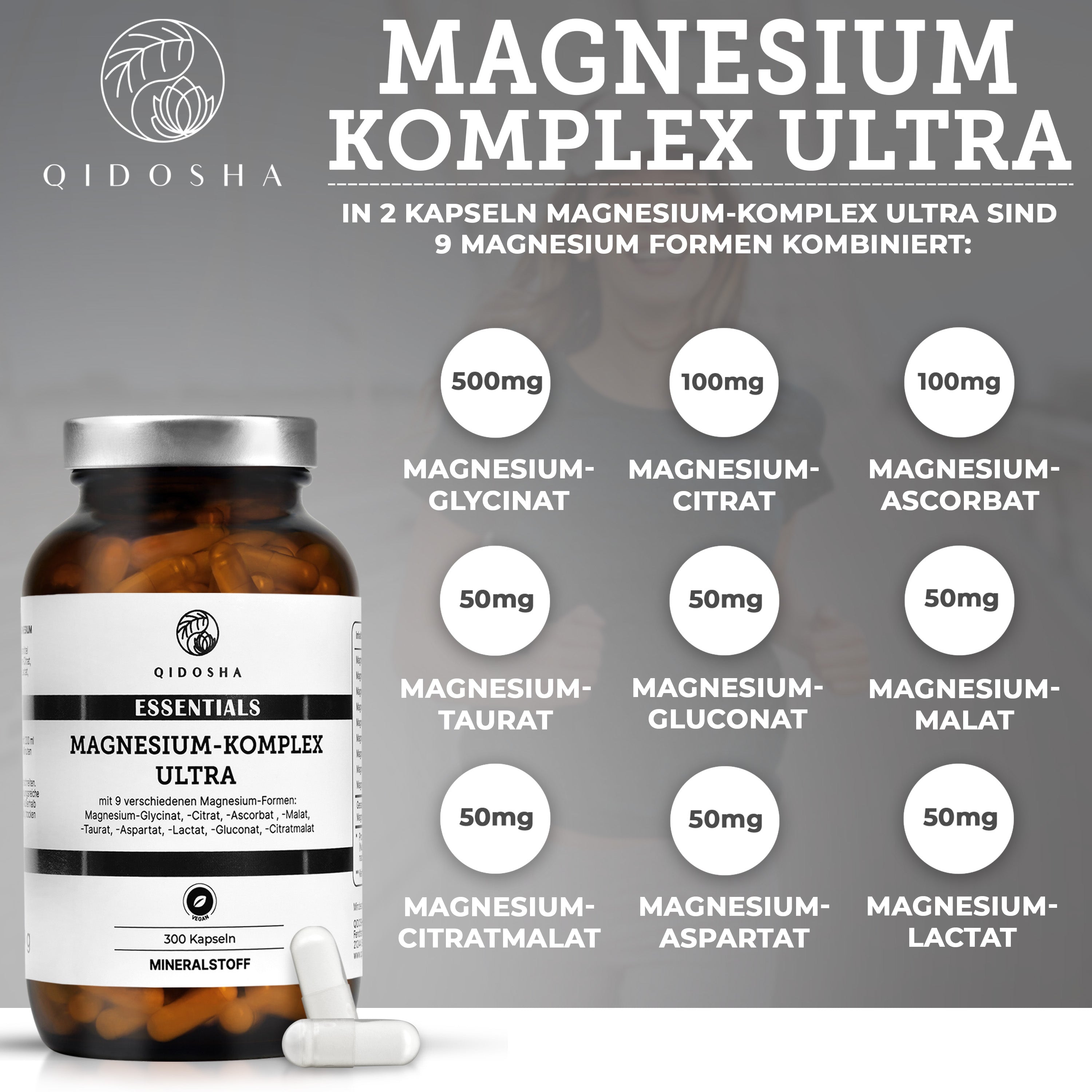 QIDOSHA Essentials Magnesium-Komplex Ultra im Glas, 300 vegane Kapseln, laborgeprüft, ohne Zusatzstoffe, enthält neun Magnesiumformen für hohe Bioverfügbarkeit und Premium-Qualität.
