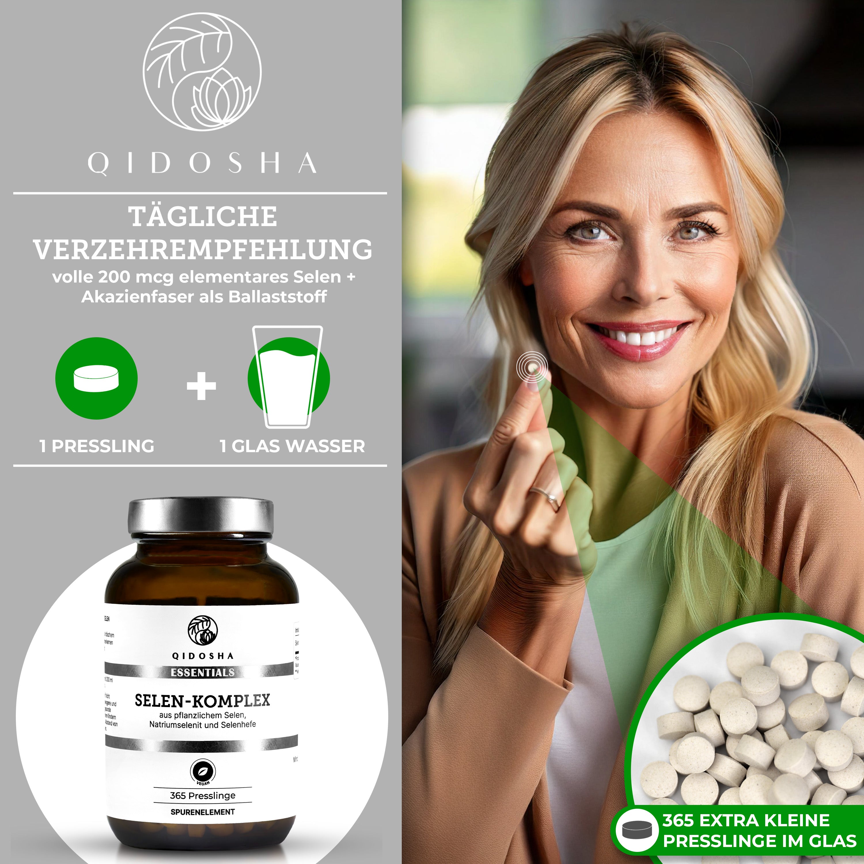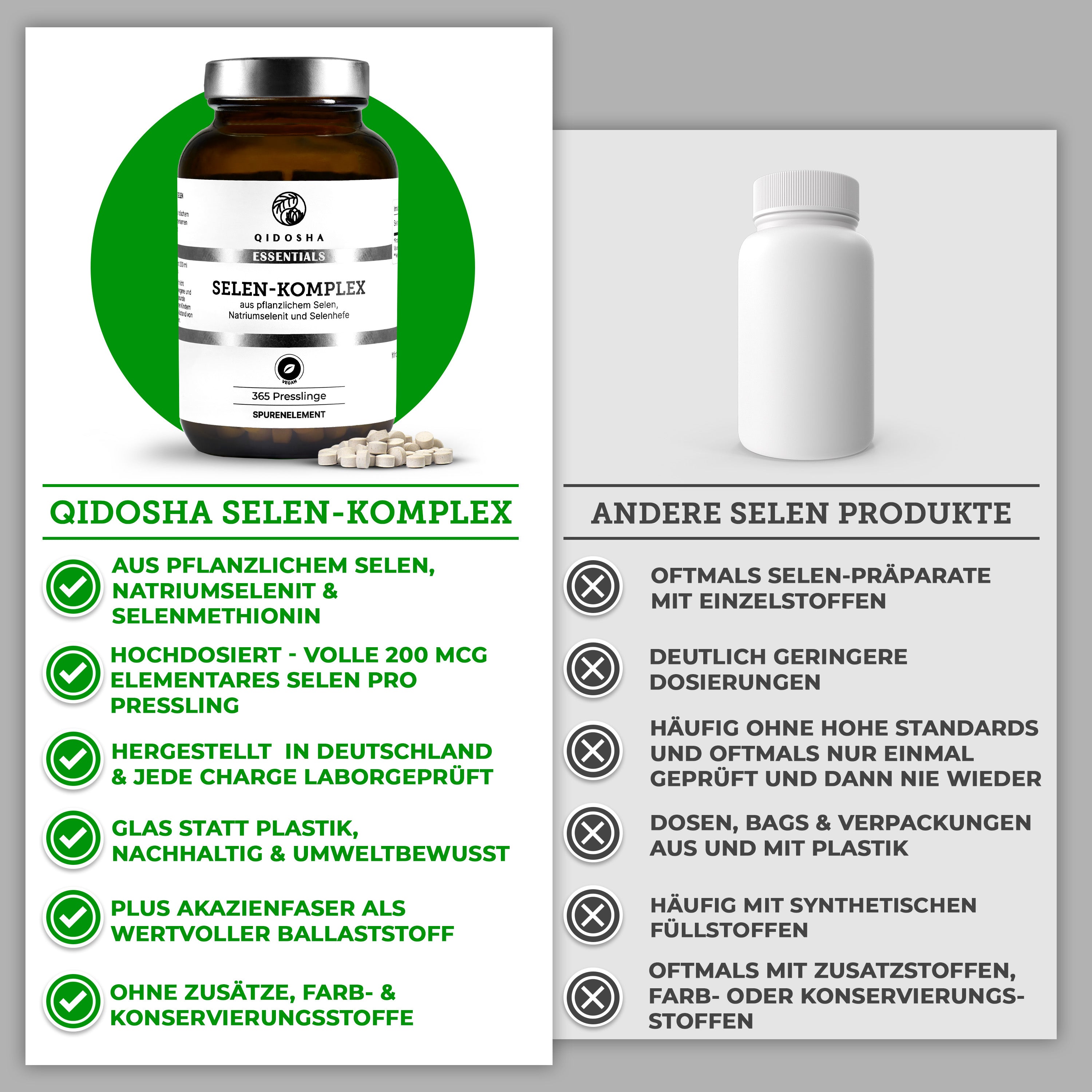 QIDOSHA Selen-Komplex: Premium, veganer Nahrungsergänzungskomplex mit pflanzlichem Selen, ohne Magnesiumstearat, laborgeprüft, in Deutschland hergestellt, umweltfreundlich in Glasflasche. 365 Tabletten für ein Jahr.