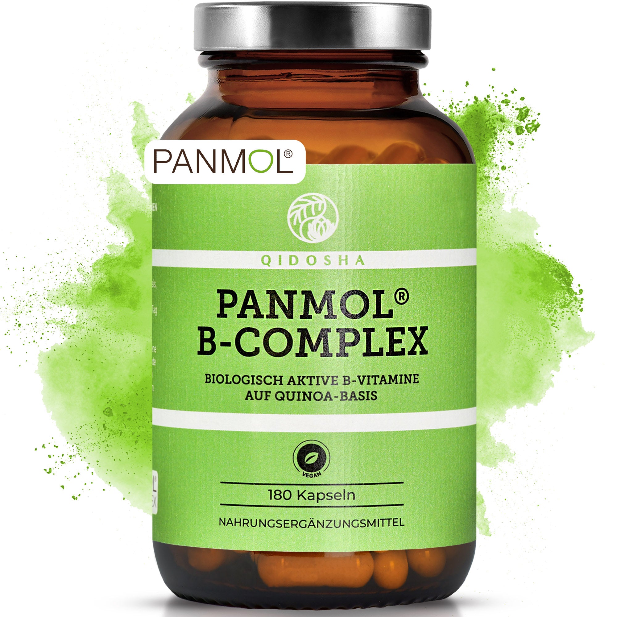 Vitamin B Komplex bioaktiv auf Quinoa-Basis, 180 vegane Kapseln, Premium-Qualität, ohne Zusatzstoffe, laborgeprüft, von QIDOSHA, im nachhaltigen Apothekerglas.