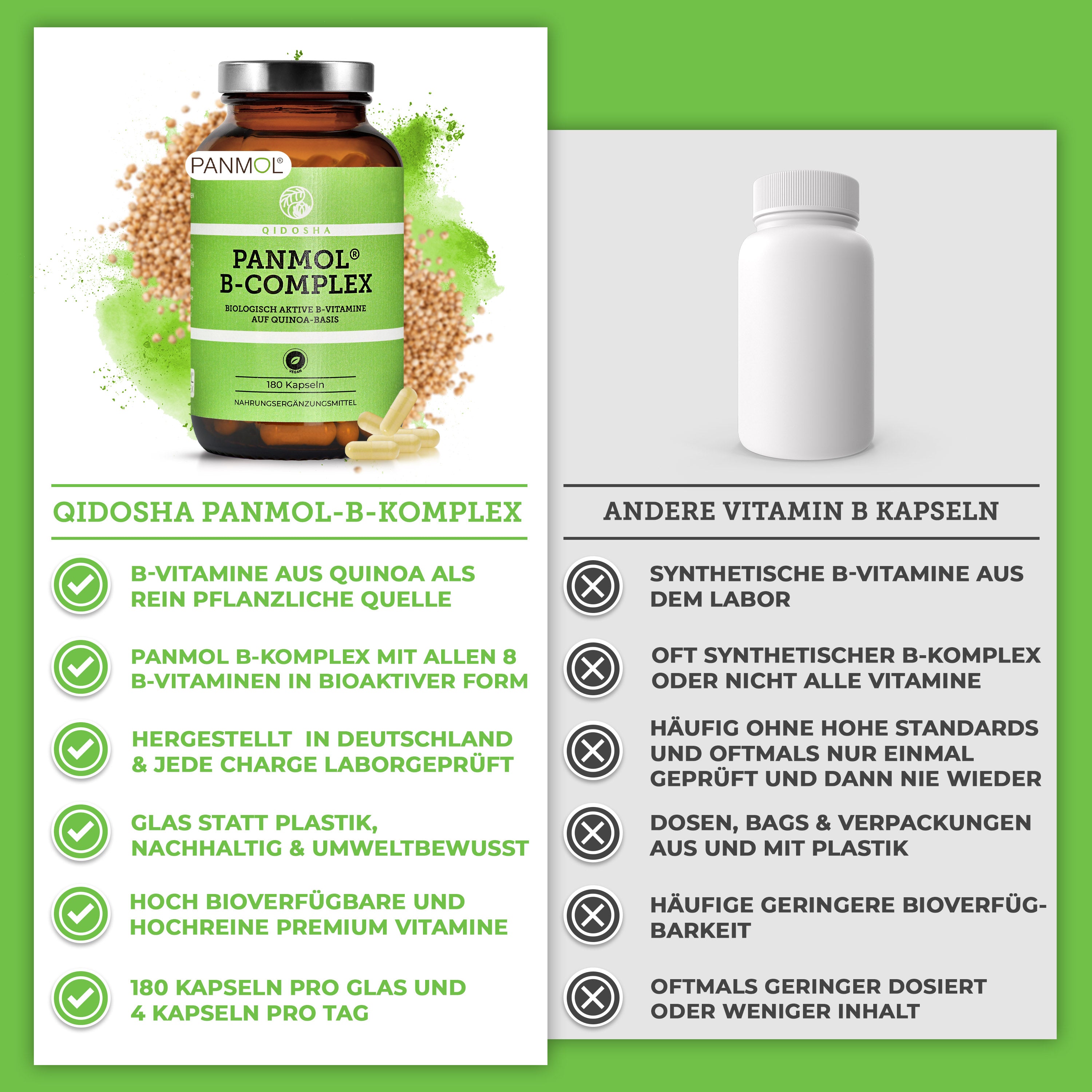 Qidosha Infografik zu Vitamin B Komplex bioaktiv auf Quinoa-Basis: Premium, pflanzlich, laborgeprüft, ohne Zusatzstoffe, unterstützt Psyche, Energiestoffwechsel, Herz- und Nervenfunktion.
