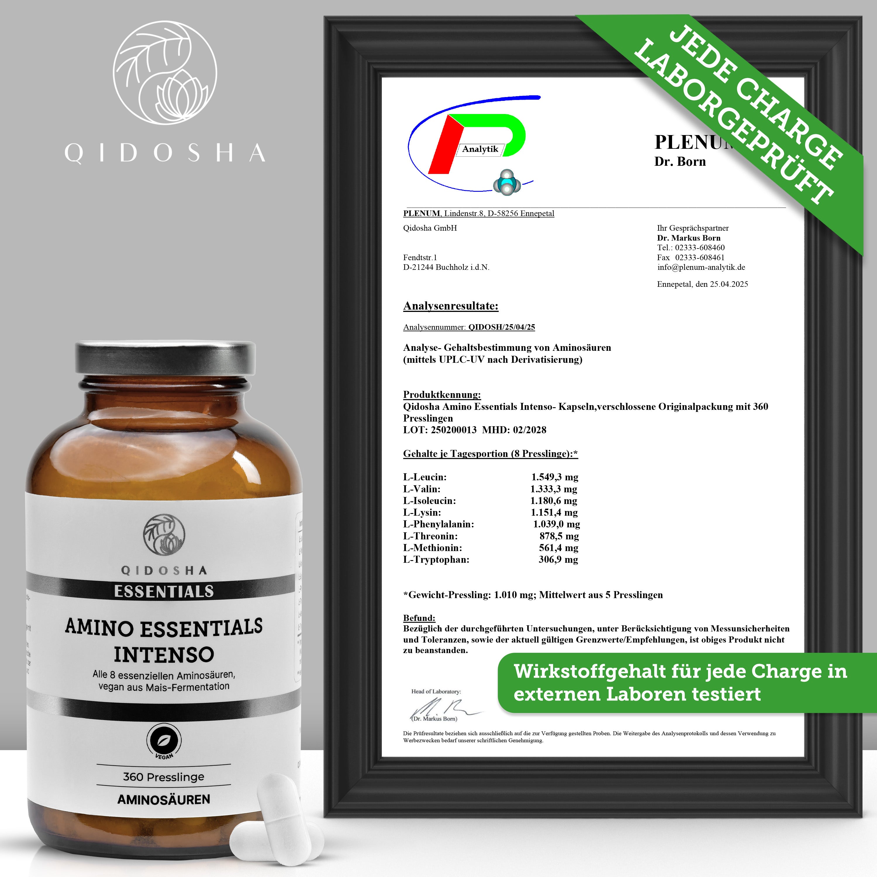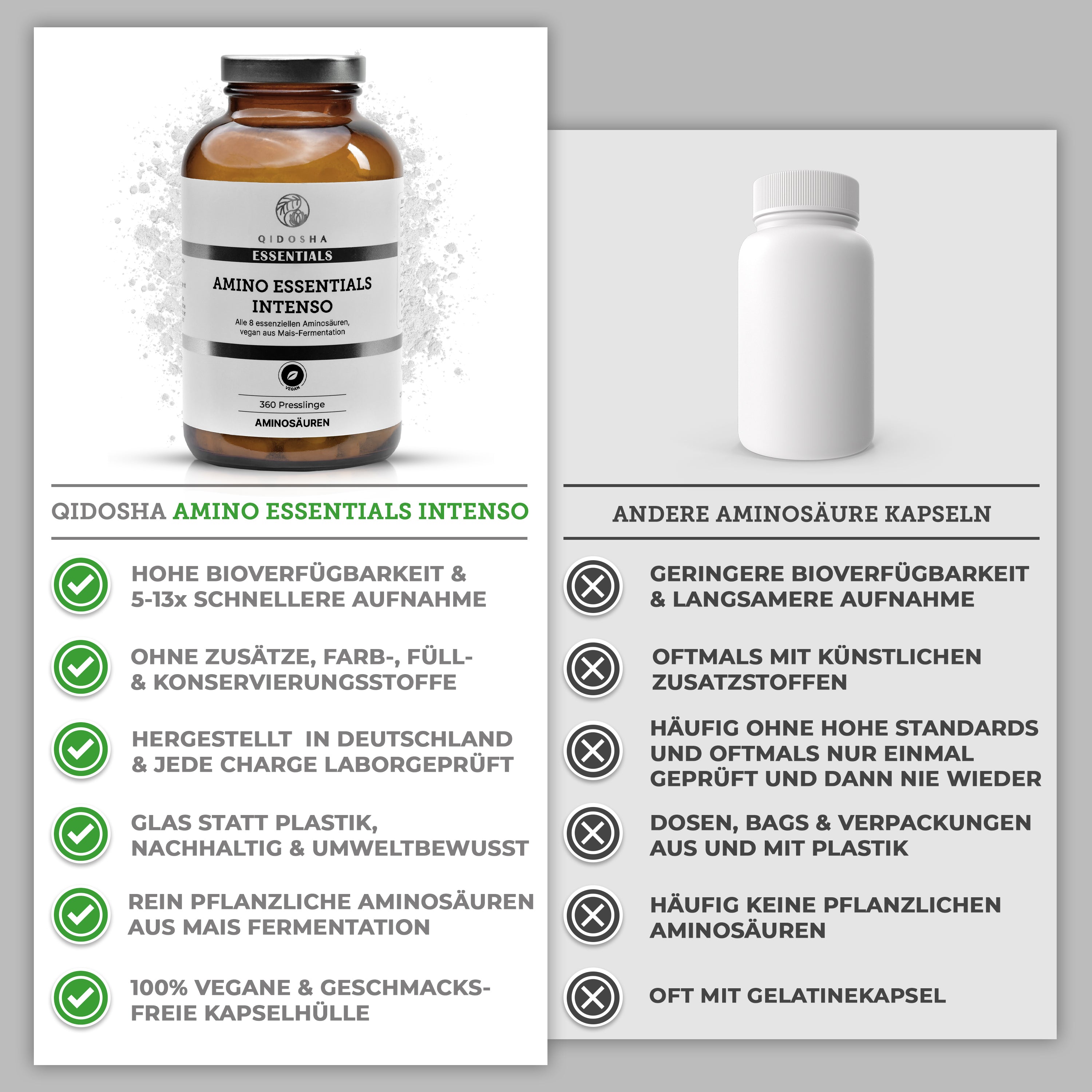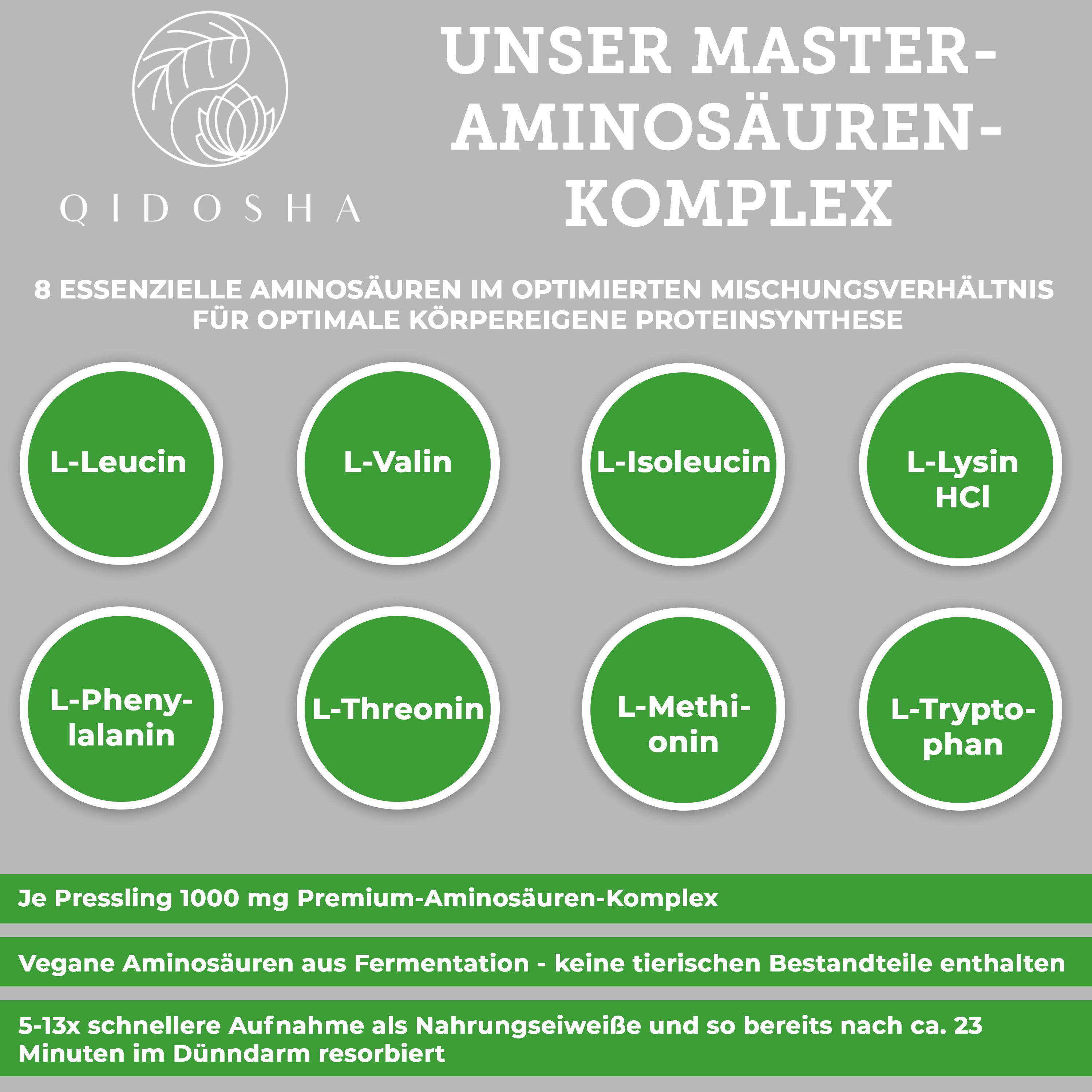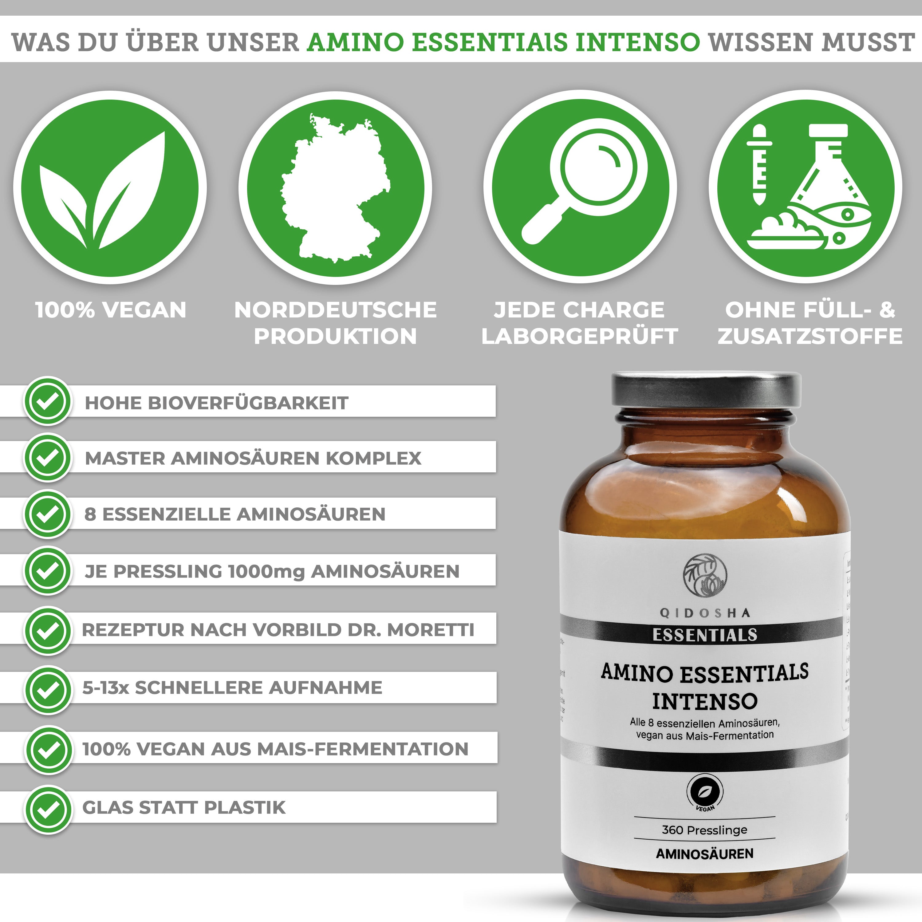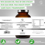Premium Aminosäuren Komplex INTENSO im Glas von QIDOSHA: 360 vegane Presslinge, alle 8 essenziellen Aminosäuren, hohe Qualität, laborgeprüft, ohne Füllstoffe.