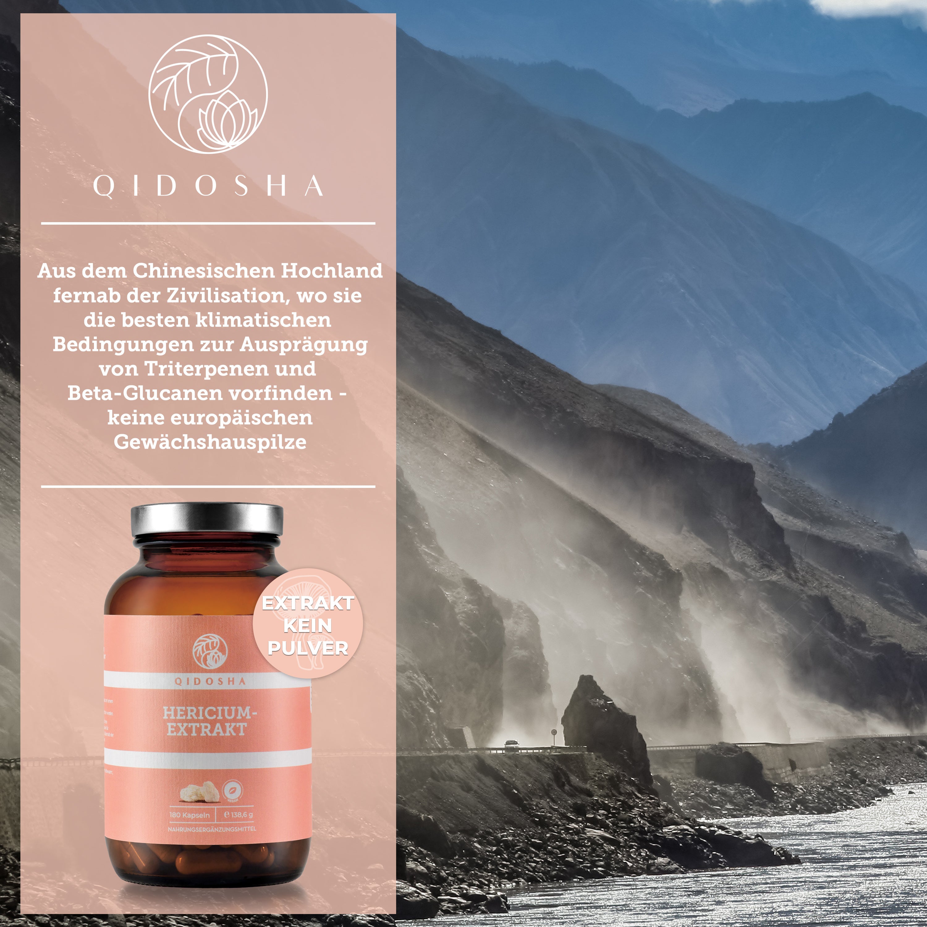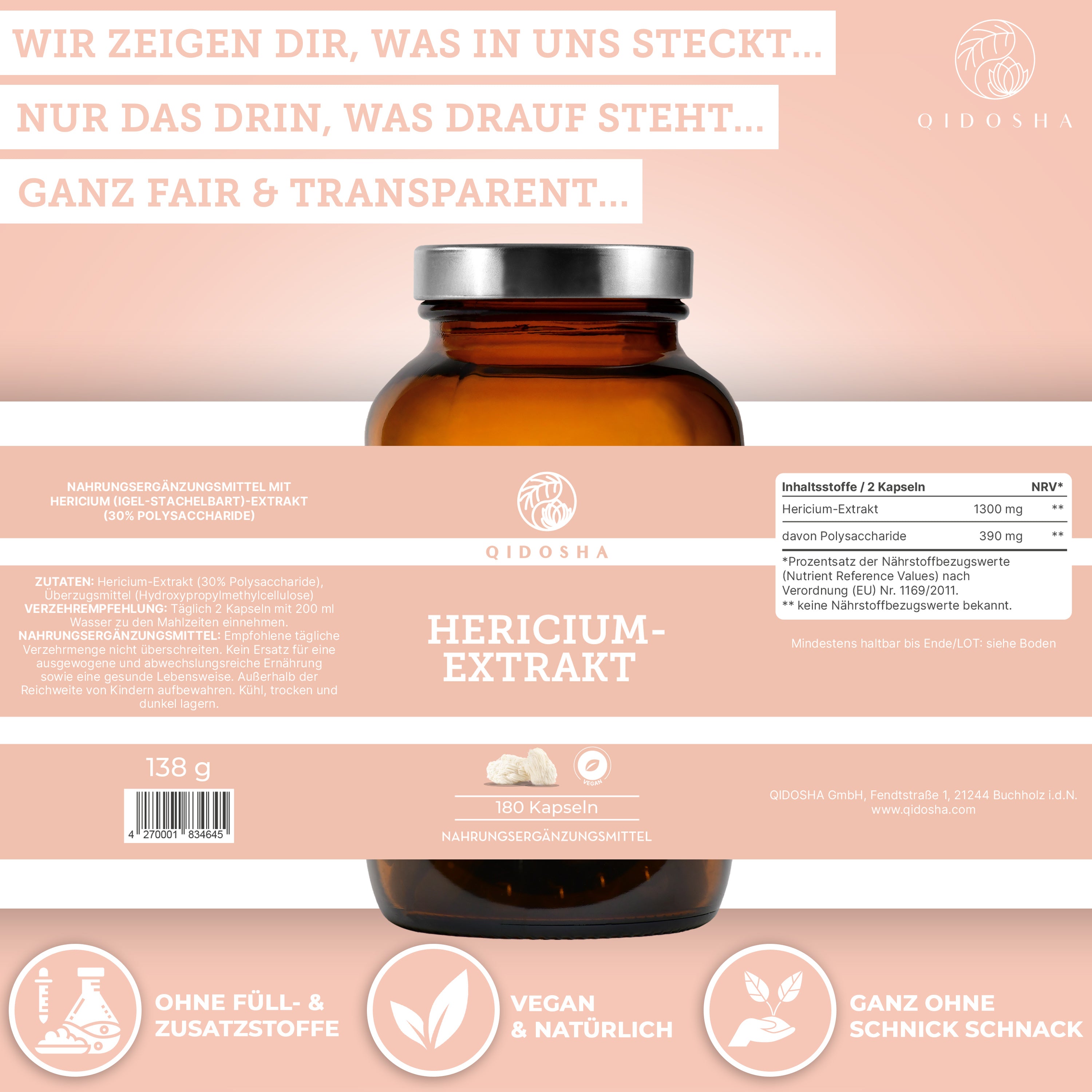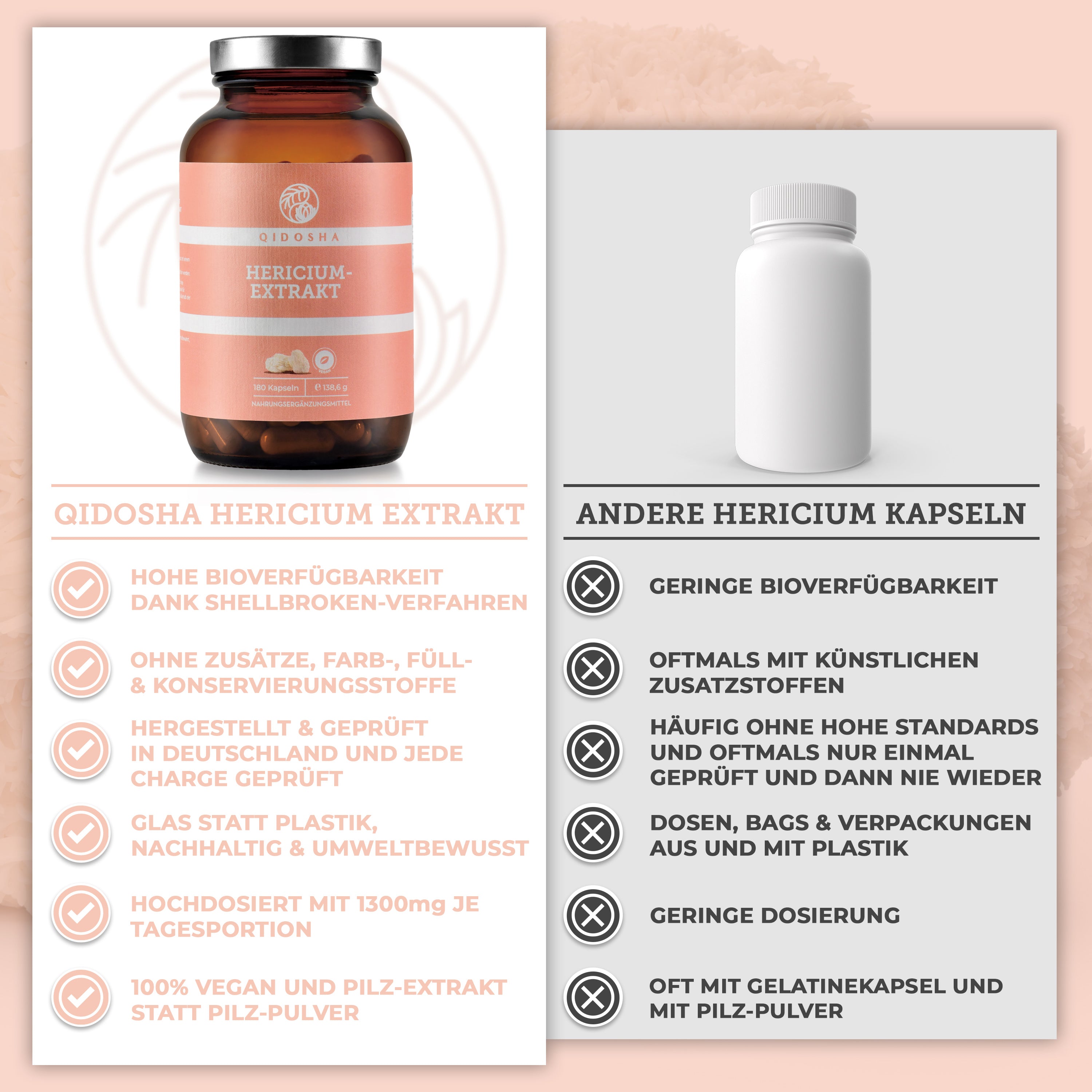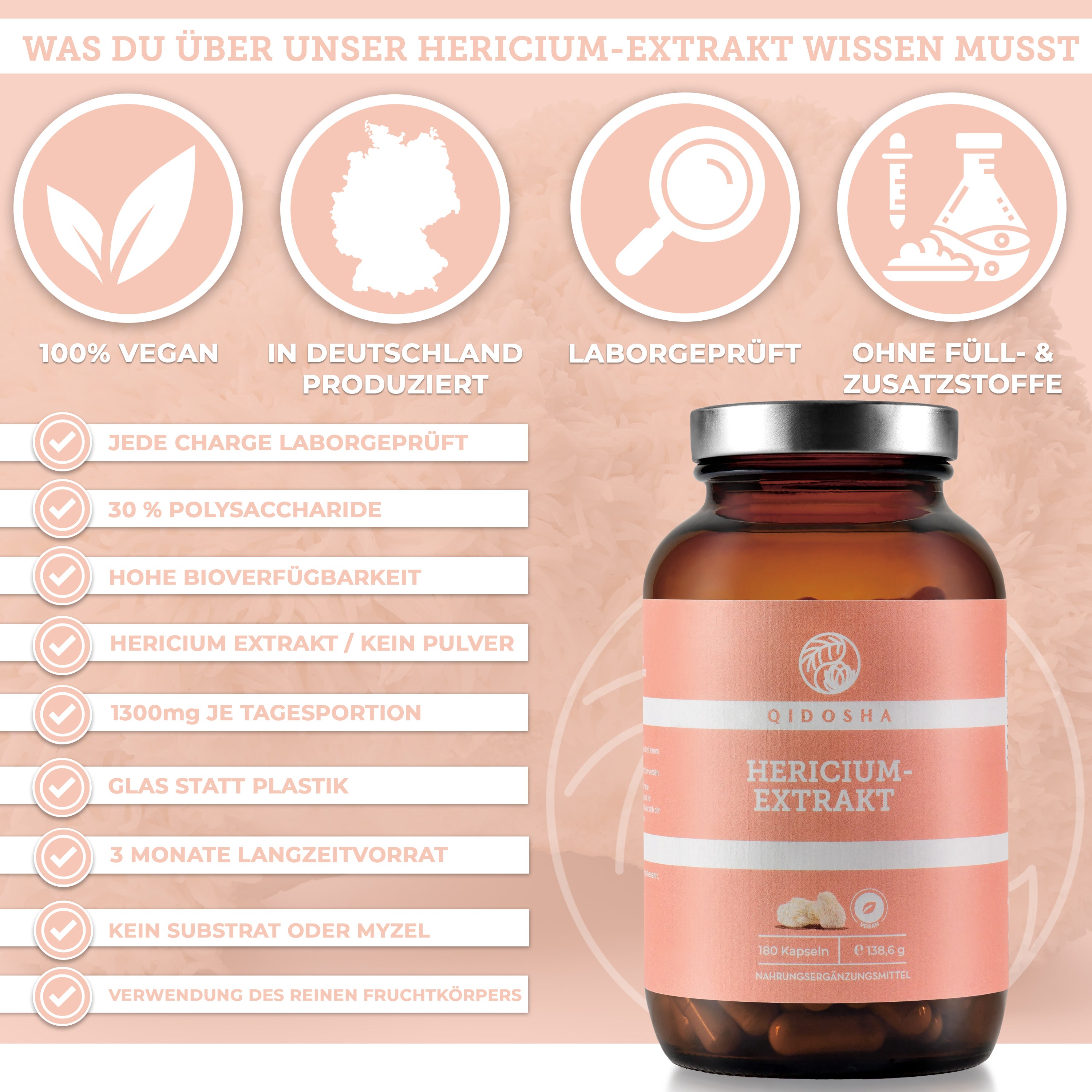 QIDOSHA Hericium-Extrakt Kapseln im Glas, 180 Stück. Premium, laborgeprüft, hohe Bioverfügbarkeit, ohne Füllstoffe. Zertifikat für Schadstoffanalysen sichtbar. Vegane, hochwertige Nahrungsergänzung.