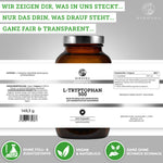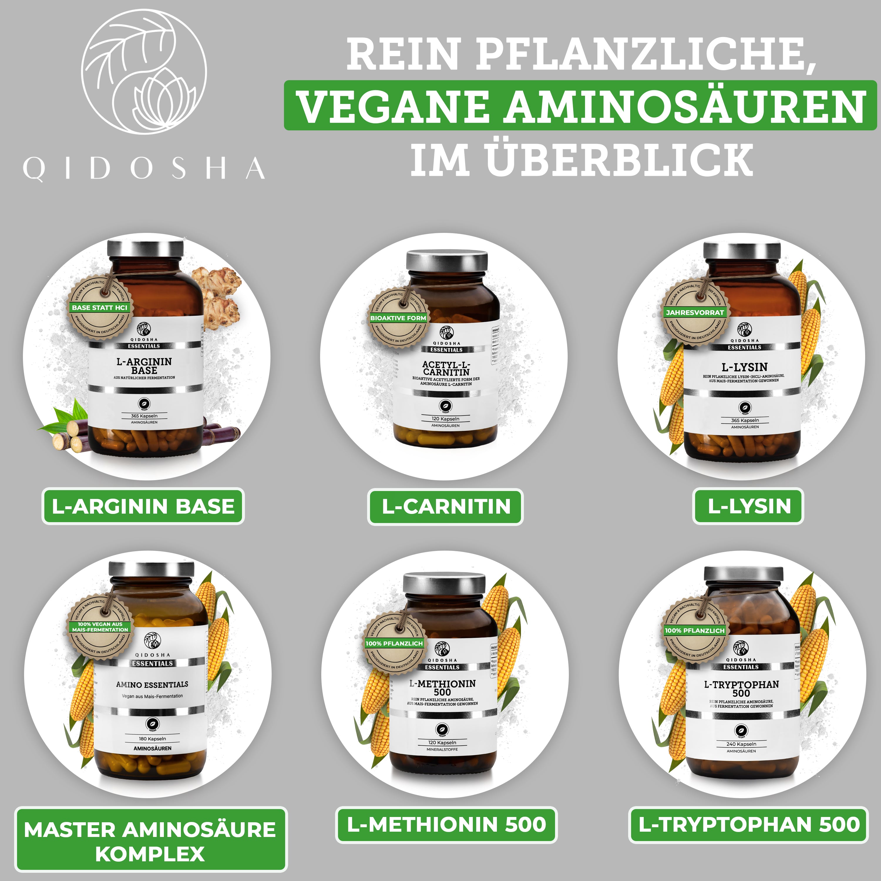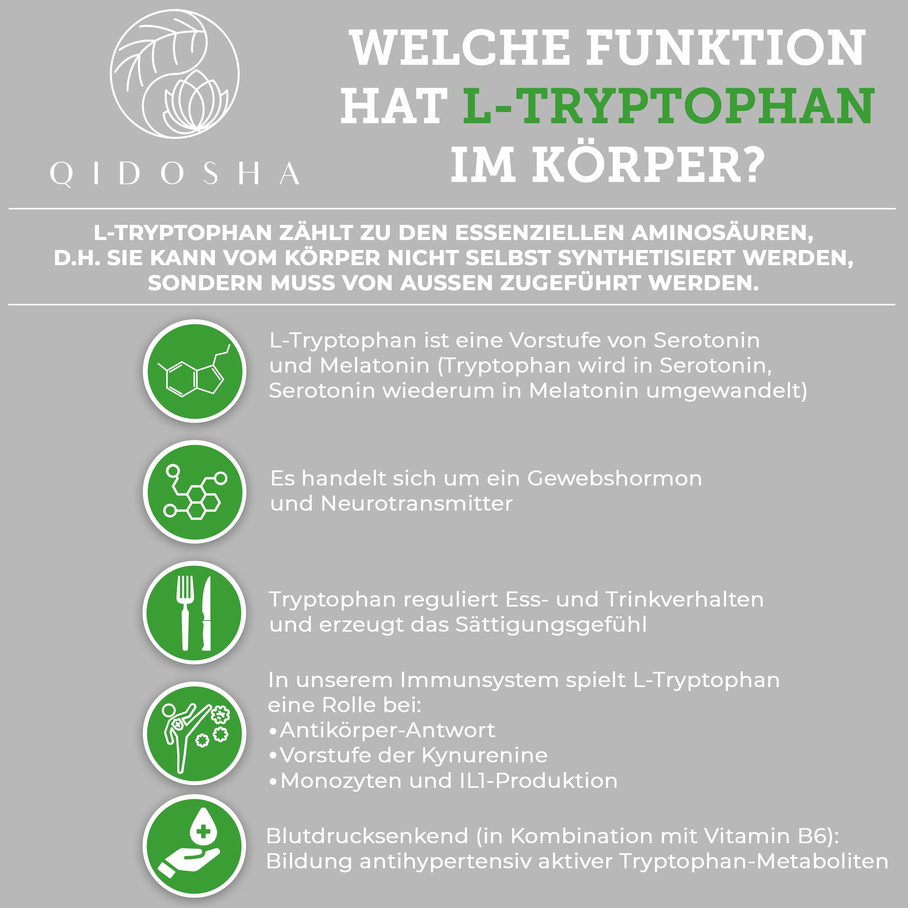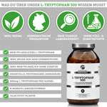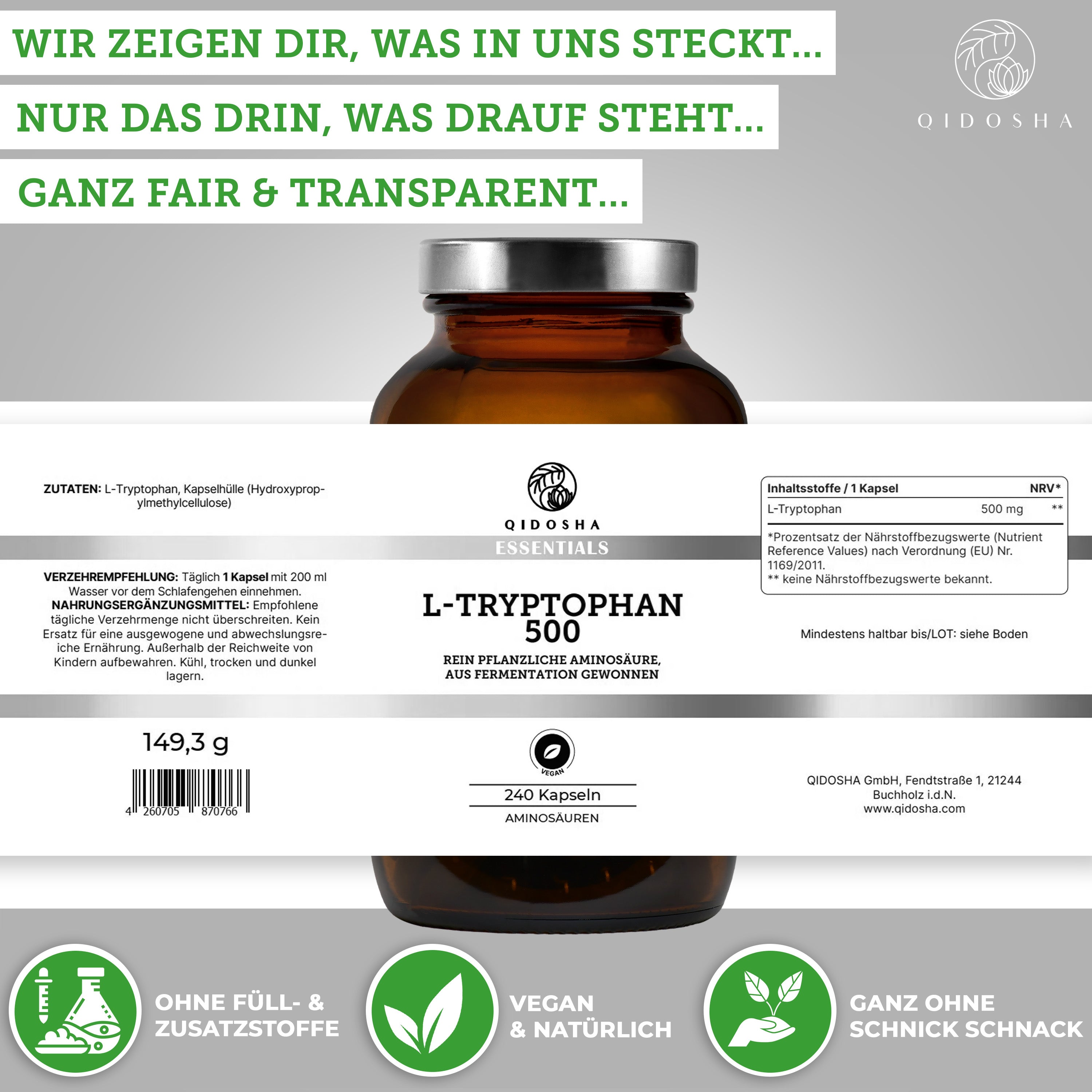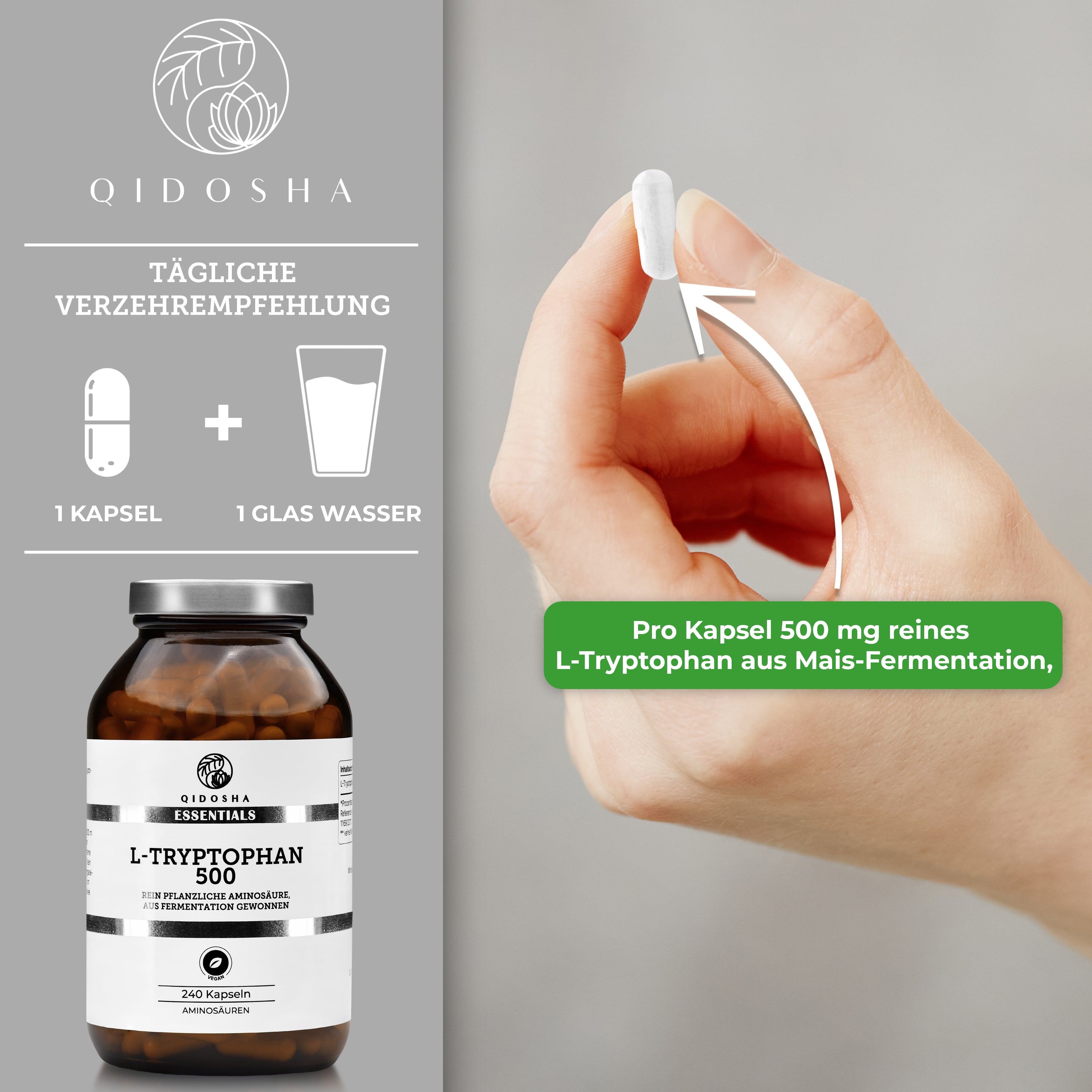 L-Tryptophan im Glas: Premium, laborgeprüftes, pflanzliches Supplement von QIDOSHA mit 240 veganen Kapseln, ohne Füllstoffe, hergestellt in Deutschland. True Clean Label.