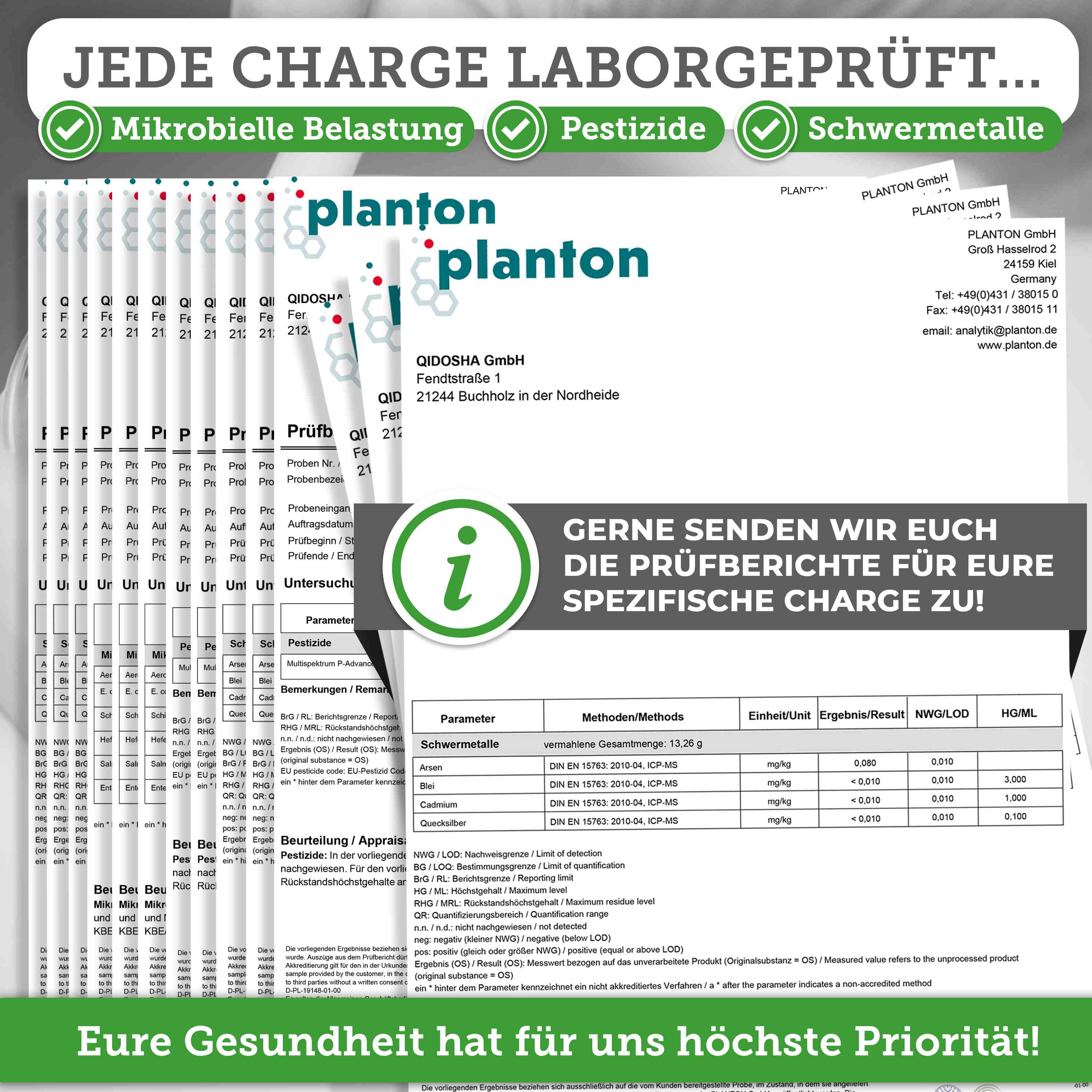 Unsere Produkte werden durch externe Labore u.a. auf mikrobielle Belastung, Schwermetalle, Pestizide und Wirkstoffgehalt geprüft.