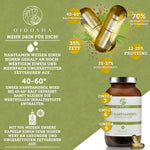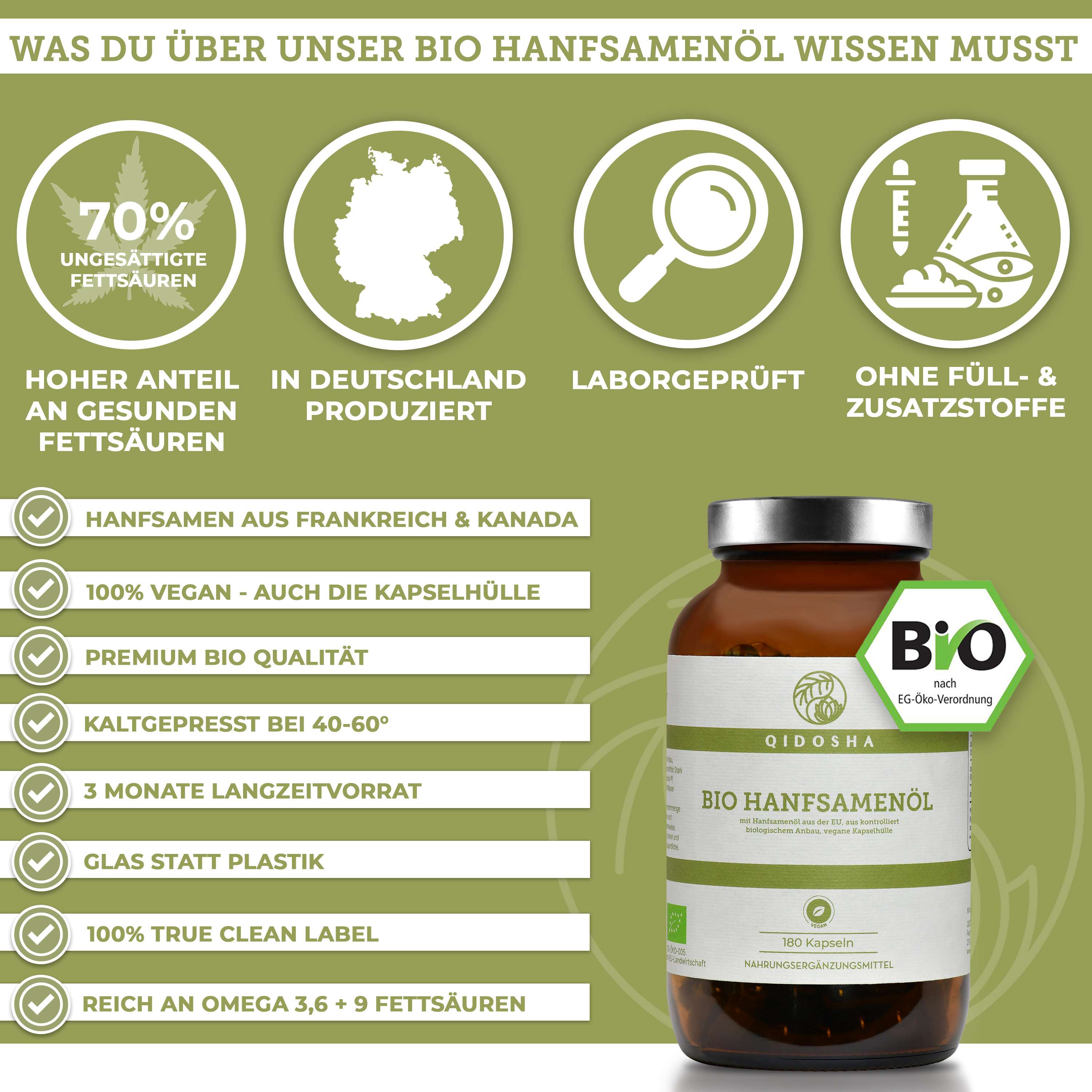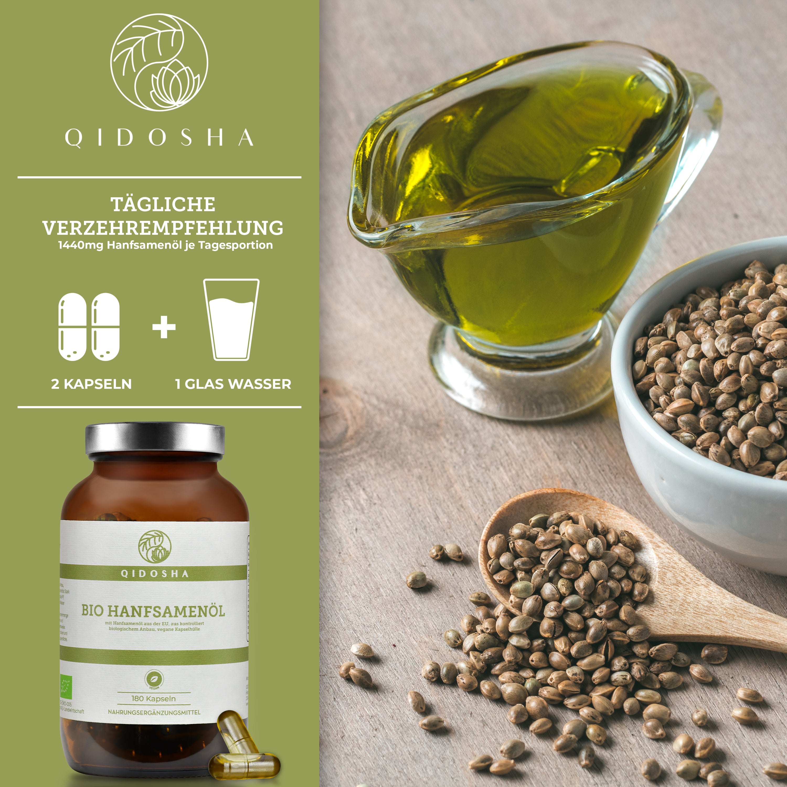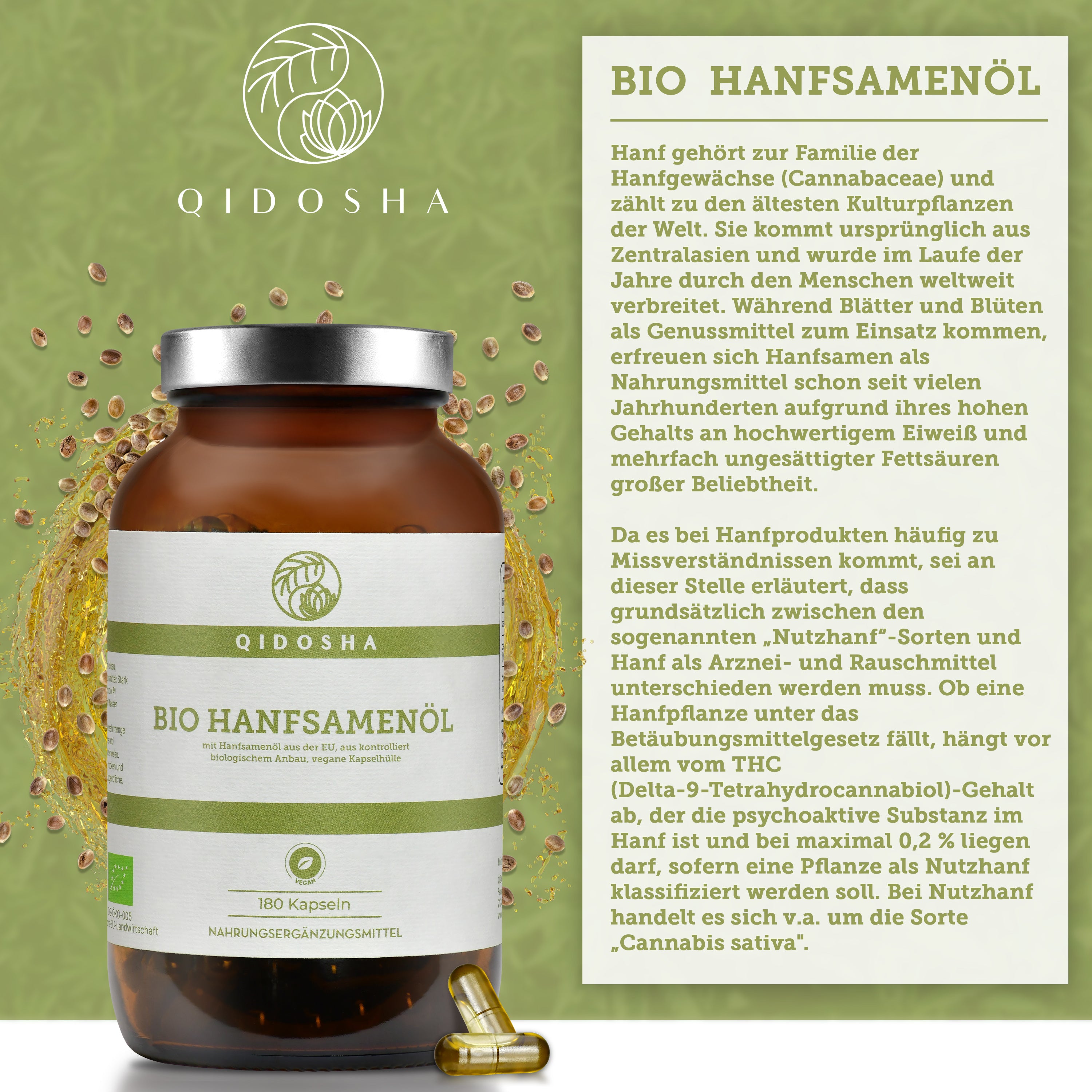 Bio Hanfsamenöl (vegan) im Glas von BIDOSHA: 180 kaltgepresste, laborgeprüfte Premium-Kapseln mit Omega-Fettsäuren, nachhaltig verpackt in Glas, ohne Zusatzstoffe.