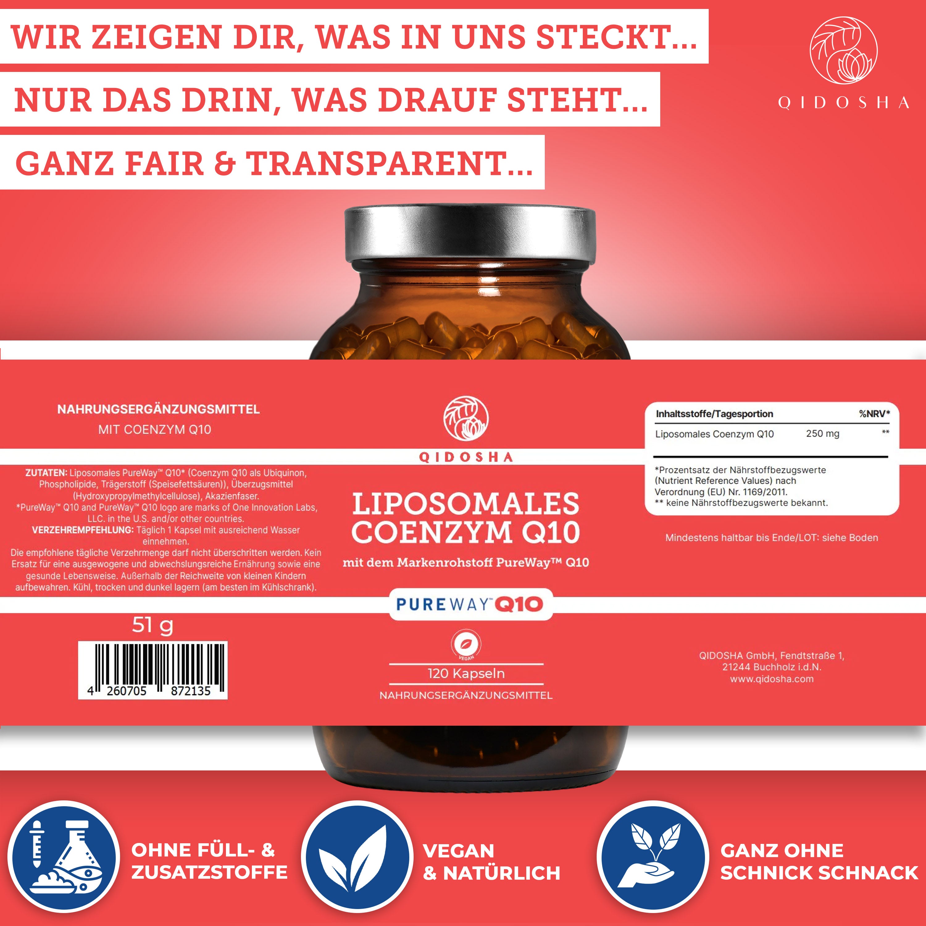 QIDOSHA's Premium-Produkt: Coenzym Q10 liposomal mit PureWay™ Q10, 120 vegane Kapseln, hohe Bioverfügbarkeit, laborgeprüfte Qualität, ohne Zusatzstoffe, in nachhaltigem Braunglas.