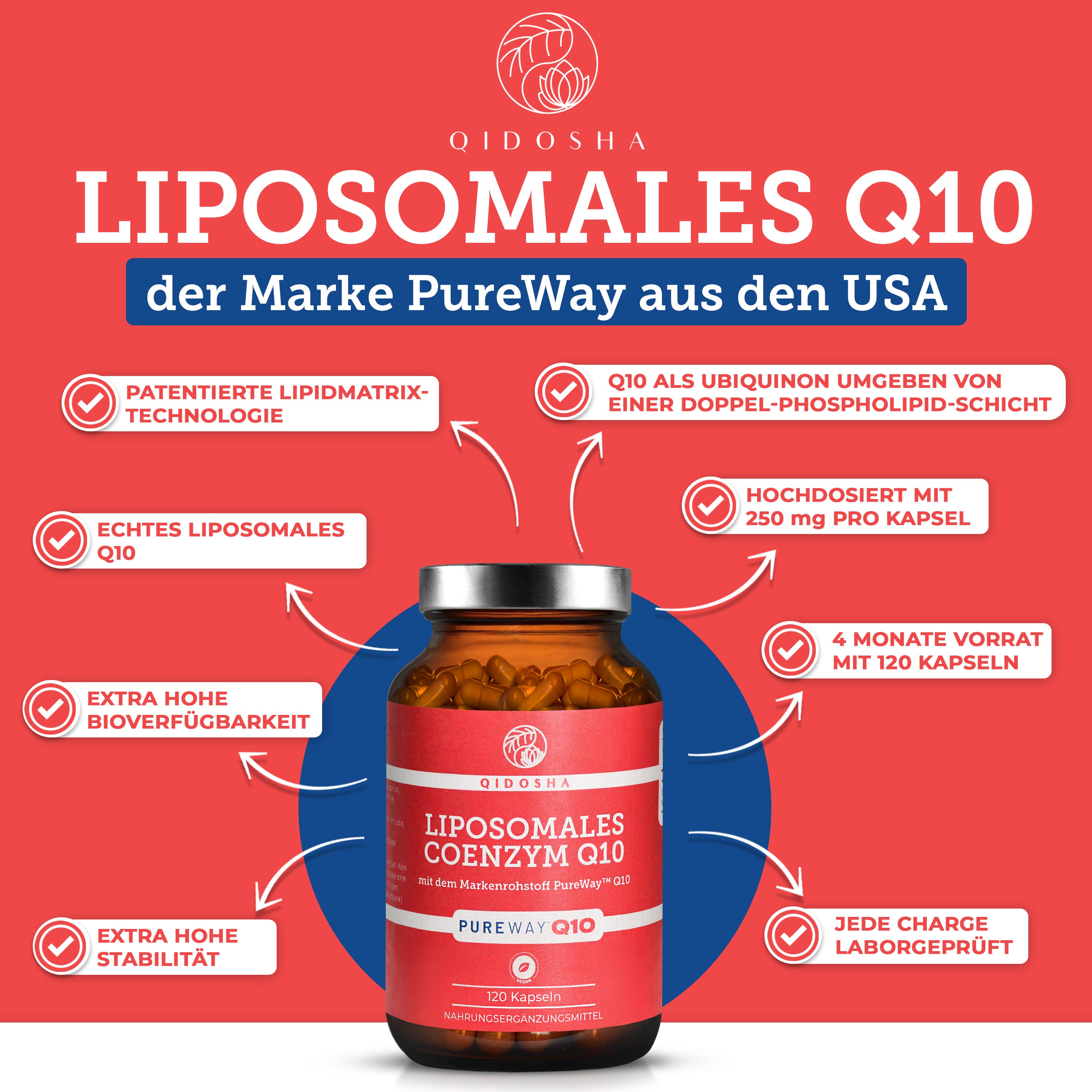 Liposomales Coenzym Q10 von QIDOSHA mit PureWay™ Q10 für verbesserte Bioverfügbarkeit, in braunem Glas mit 120 Kapseln, ohne Füll- oder Zusatzstoffe.