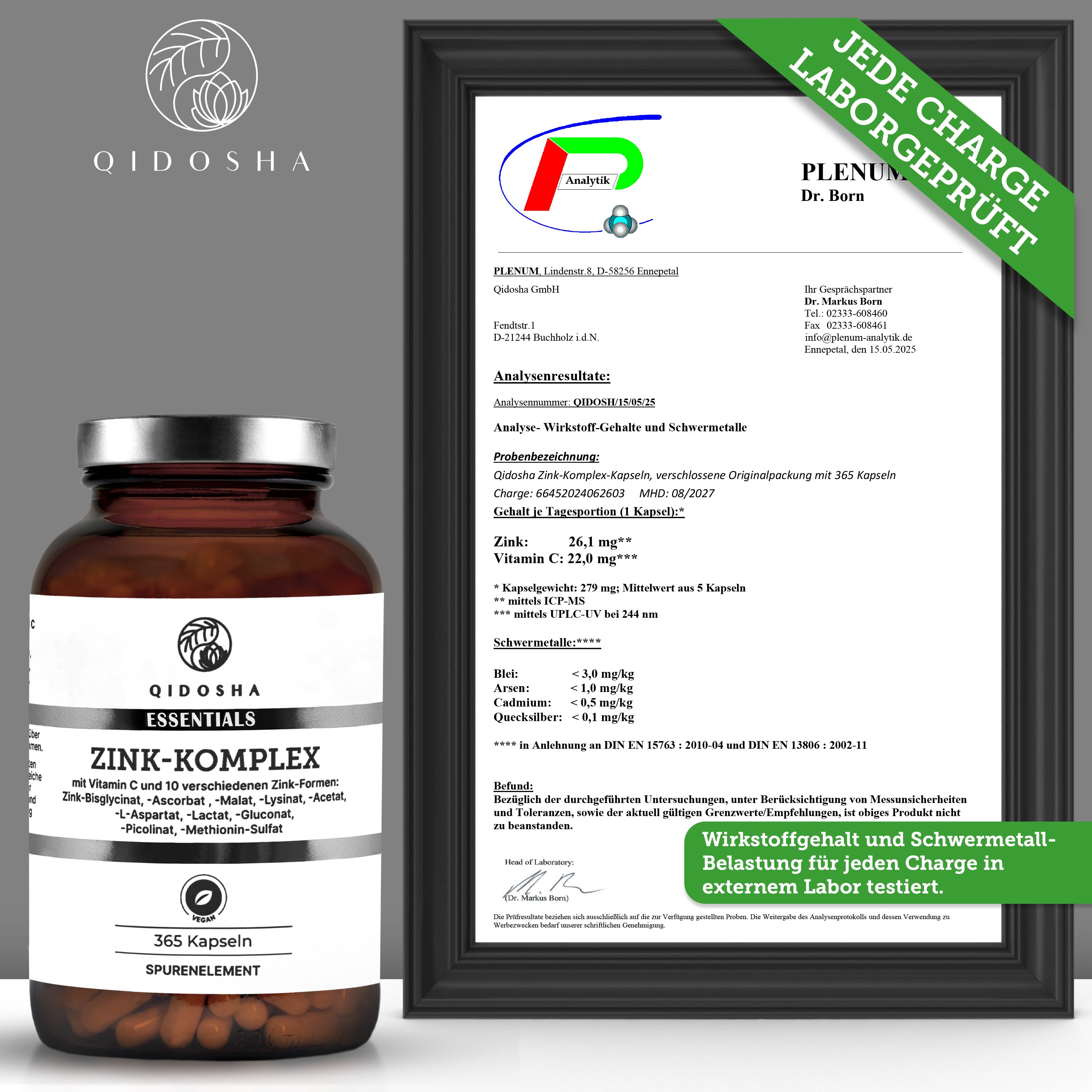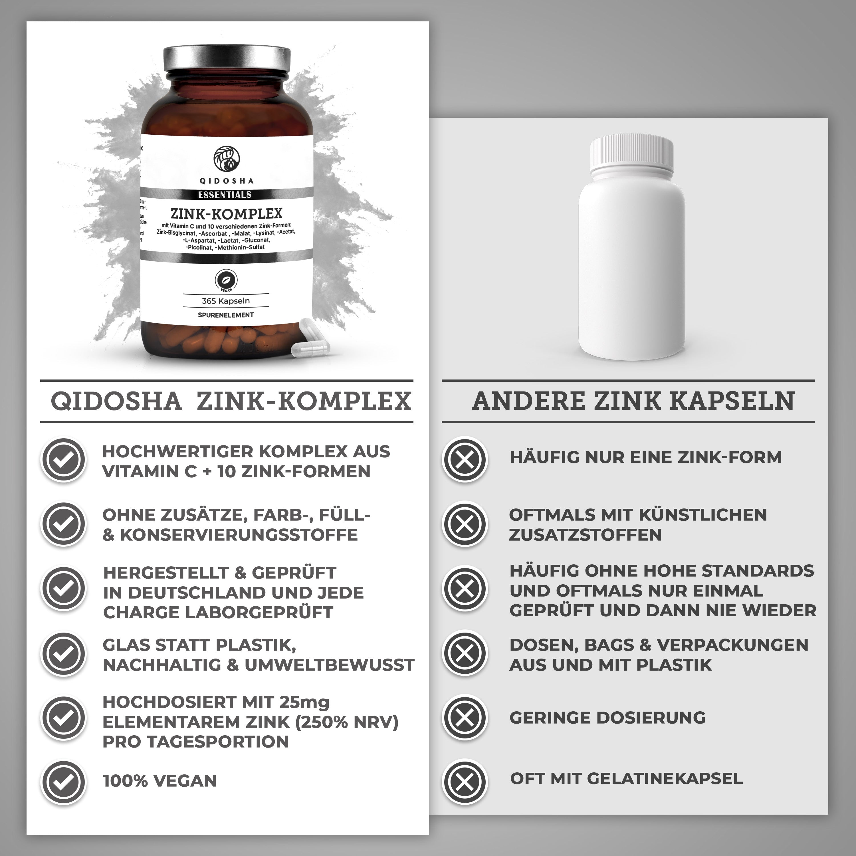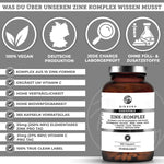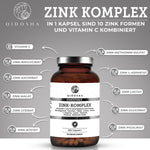 Braunes Glas mit QIDOSHA Zink-Komplex plus Vitamin C, 365 vegane Kapseln. Enthält 10 Zinkformen, Vitamin C, nachhaltig in Deutschland hergestellt, laborgeprüfte Premium-Qualität.