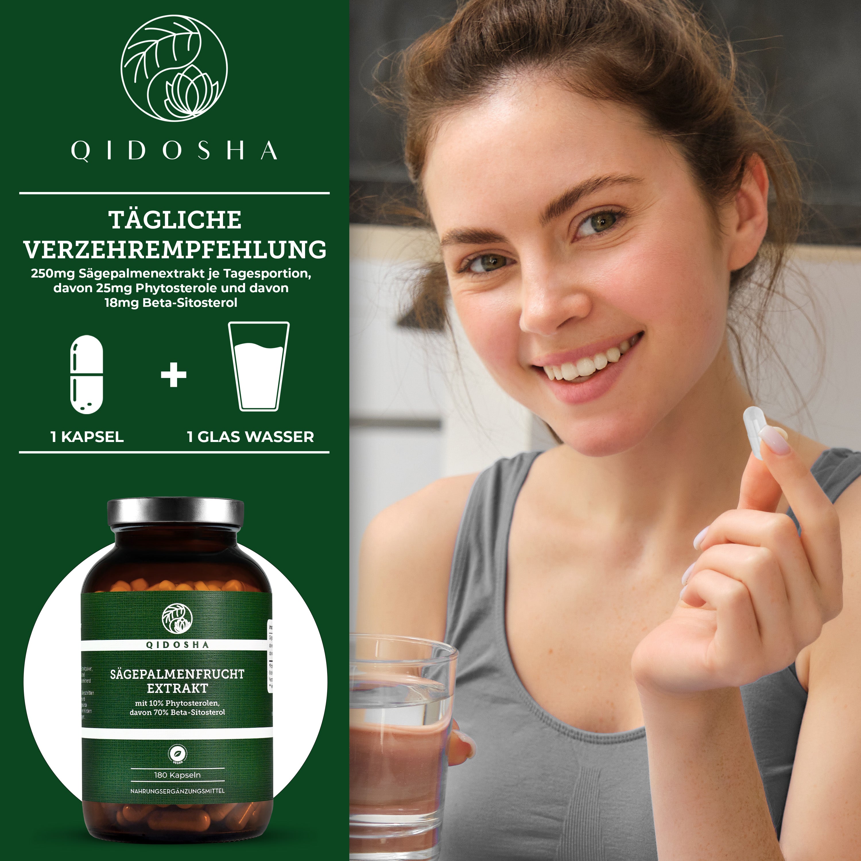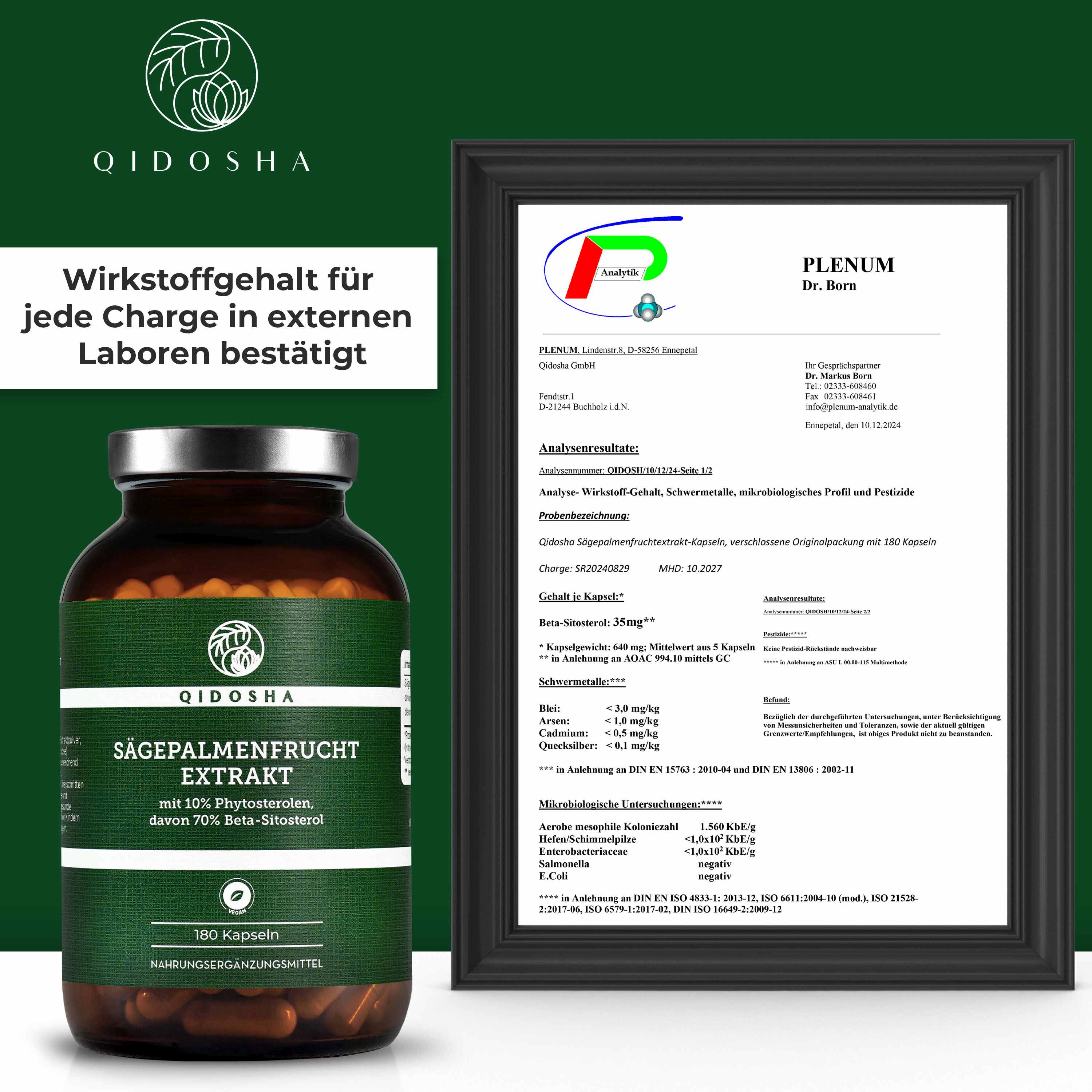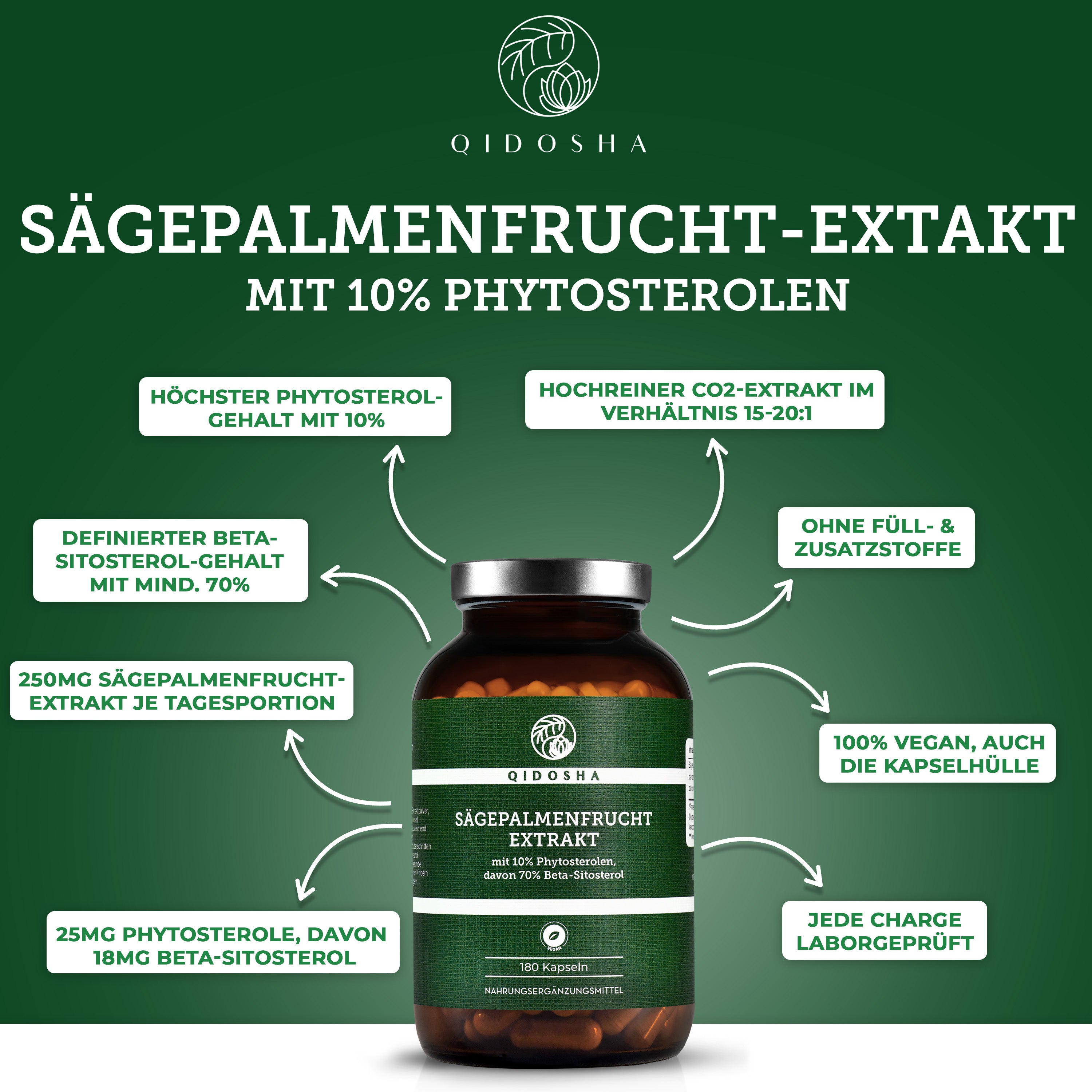 Sägepalmen Fruchtextrakt (neue Dosierung), QIDOSHA Premium-Nahrungsergänzungsmittel, 180 vegane Kapseln. Höchster Phytosterol-Gehalt, laborgeprüft, ohne Füllstoffe, in Deutschland hergestellt.