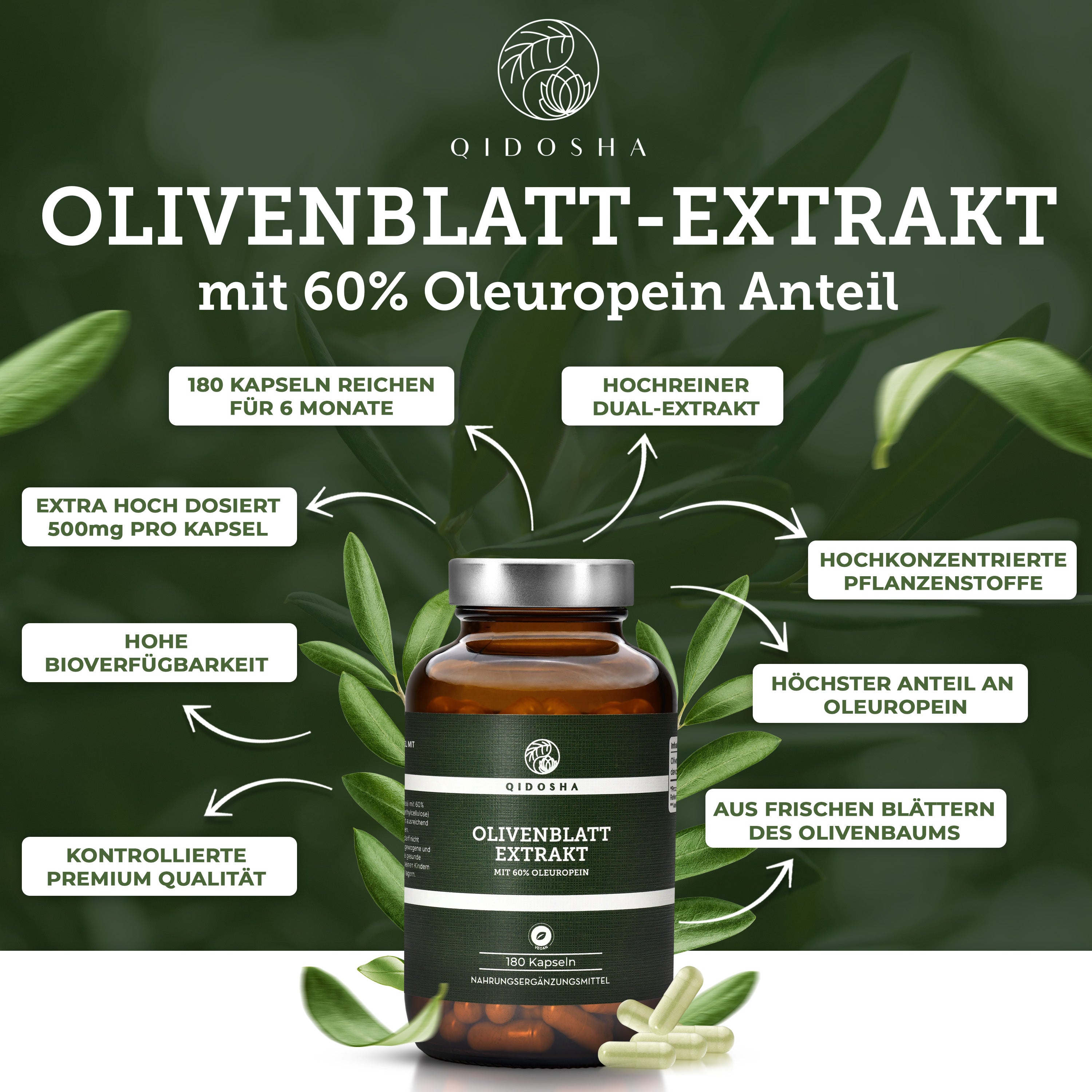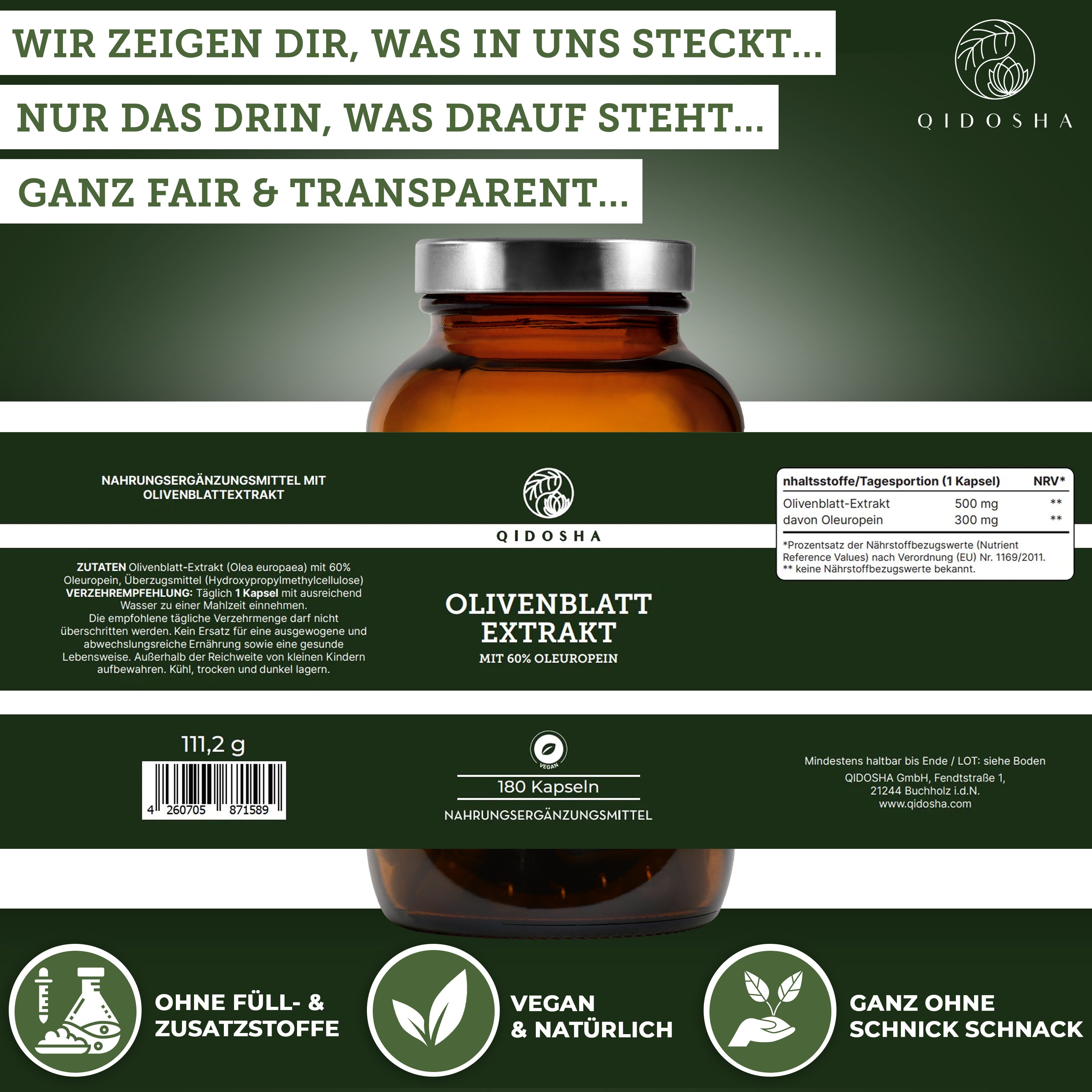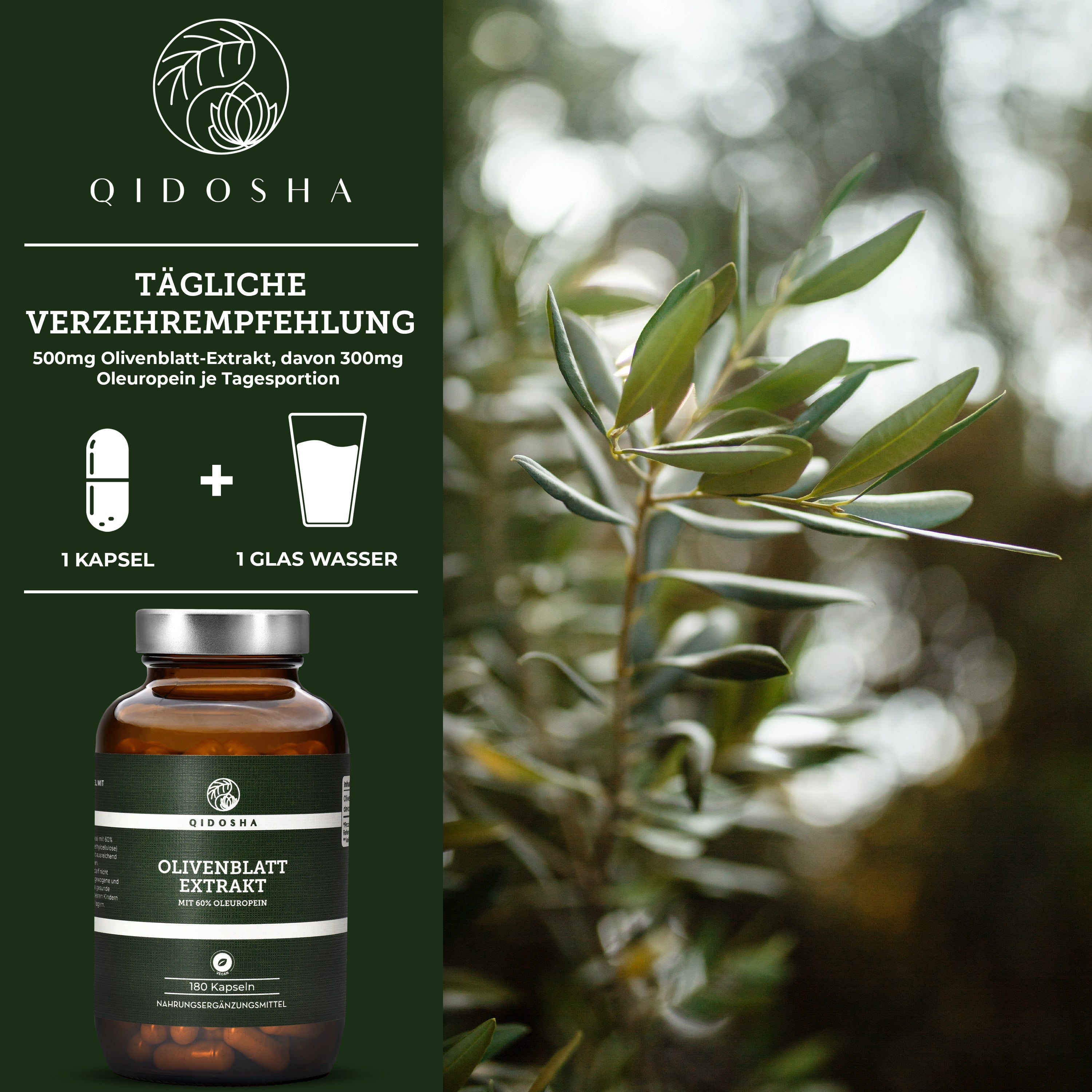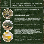 Olivenblatt-Extrakt mit 60% Oleuropein, 180 vegane Kapseln in nachhaltigem Glas, laborgeprüft, ohne Füllstoffe. Hochdosiert, Premium-Qualität, hergestellt in Deutschland.