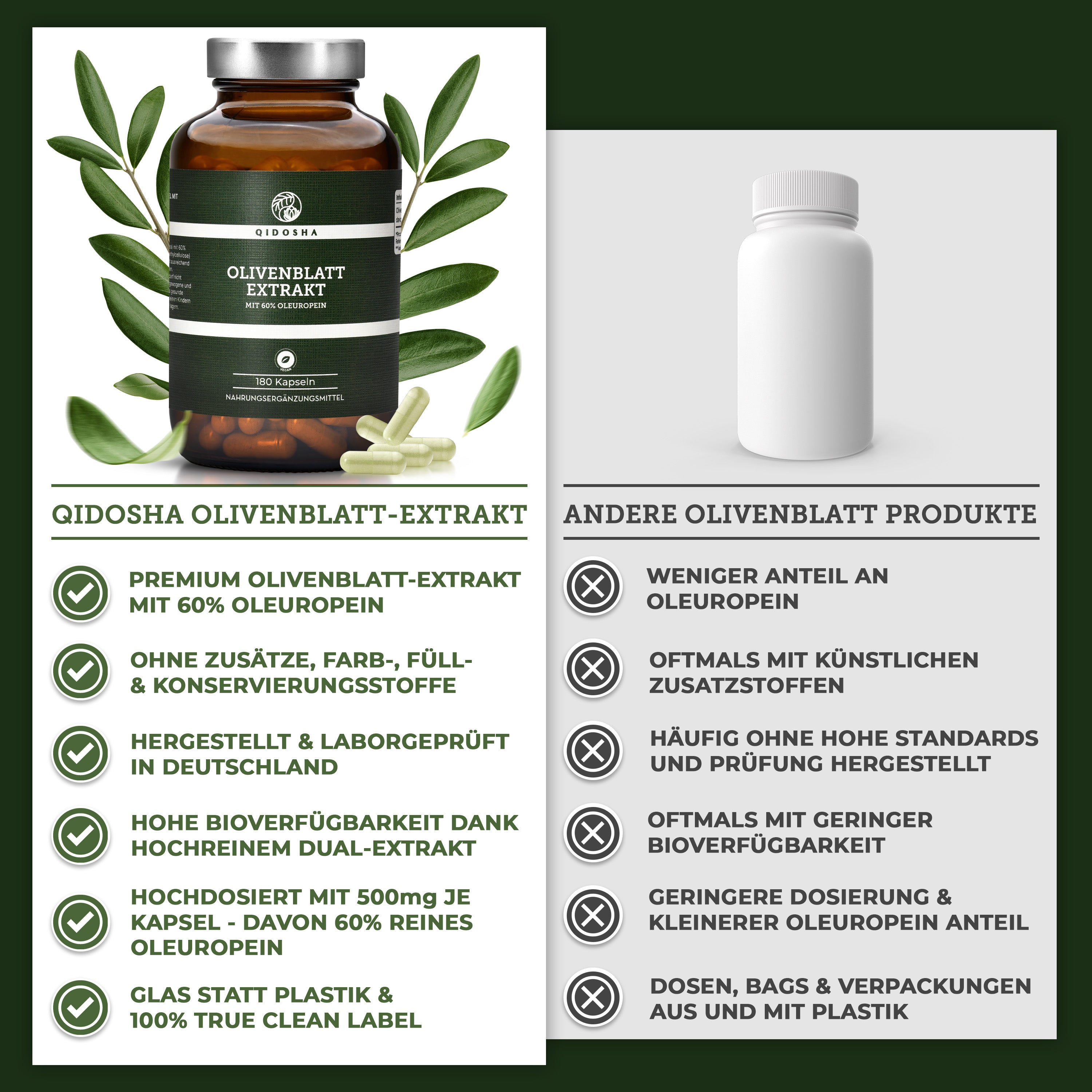 Olivenblatt-Extrakt mit 60% Oleuropein, 180 vegane Kapseln, Premium-Nahrungsergänzungsmittel, laborgeprüft, ohne Zusatzstoffe, nachhaltig in Deutschland produziert, in Gläsern verpackt.