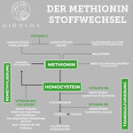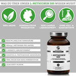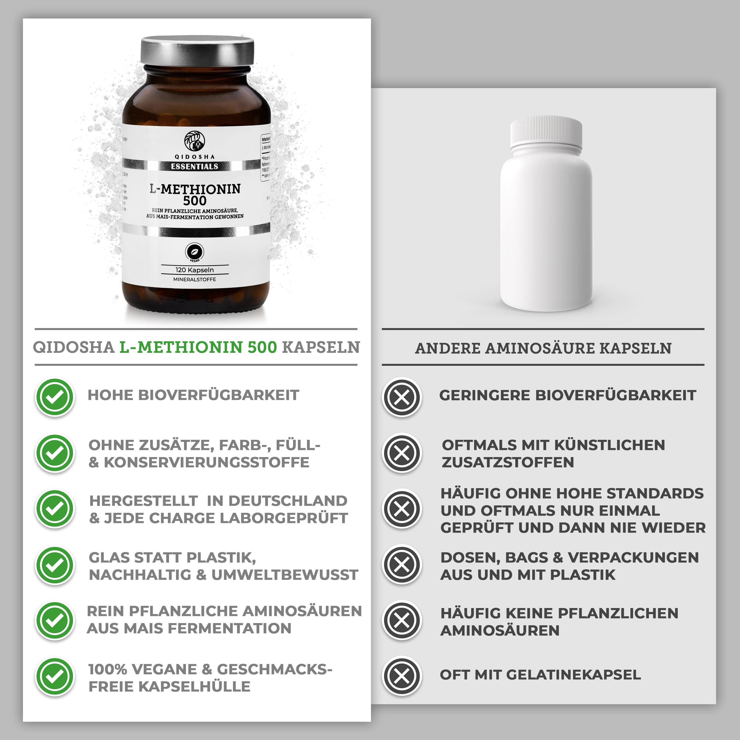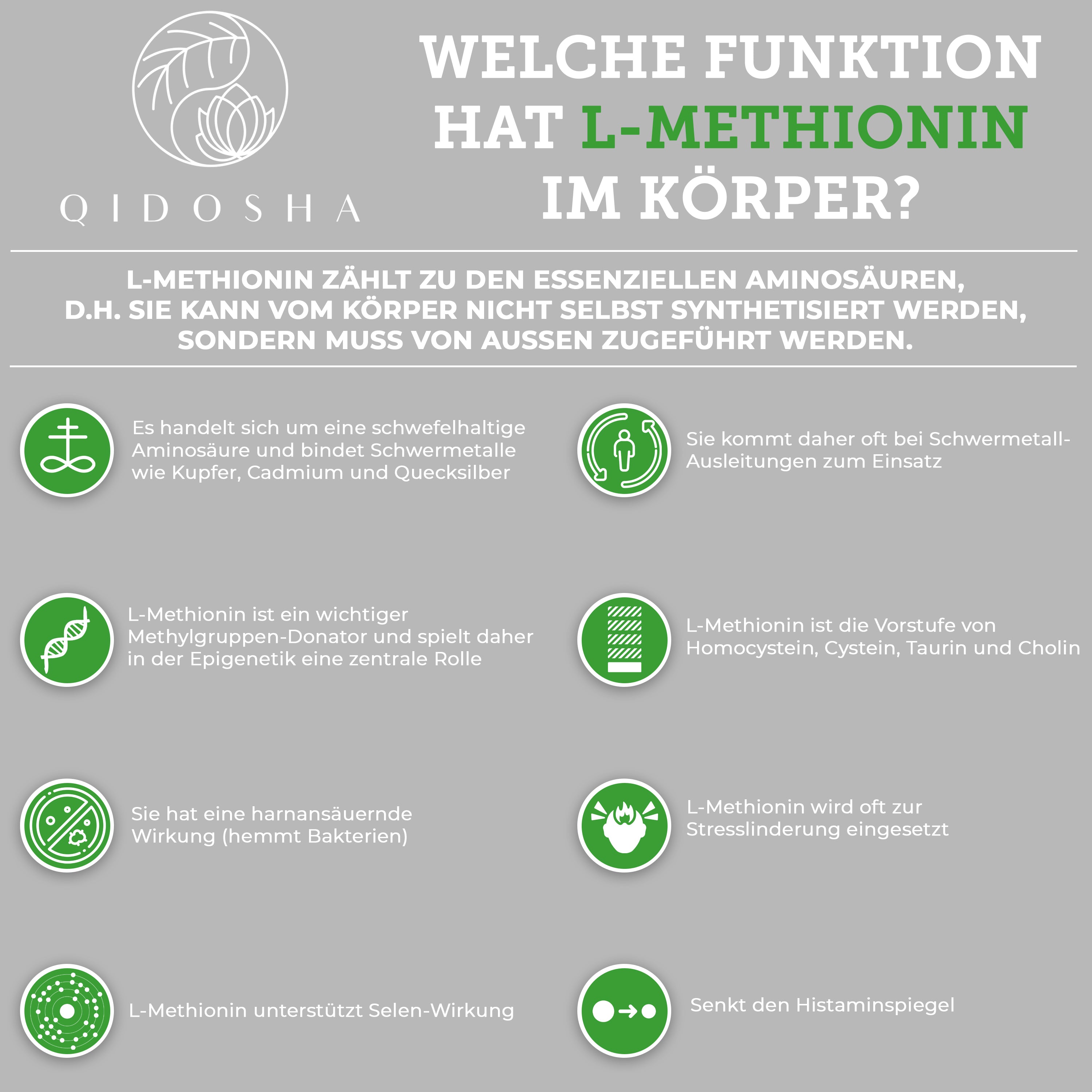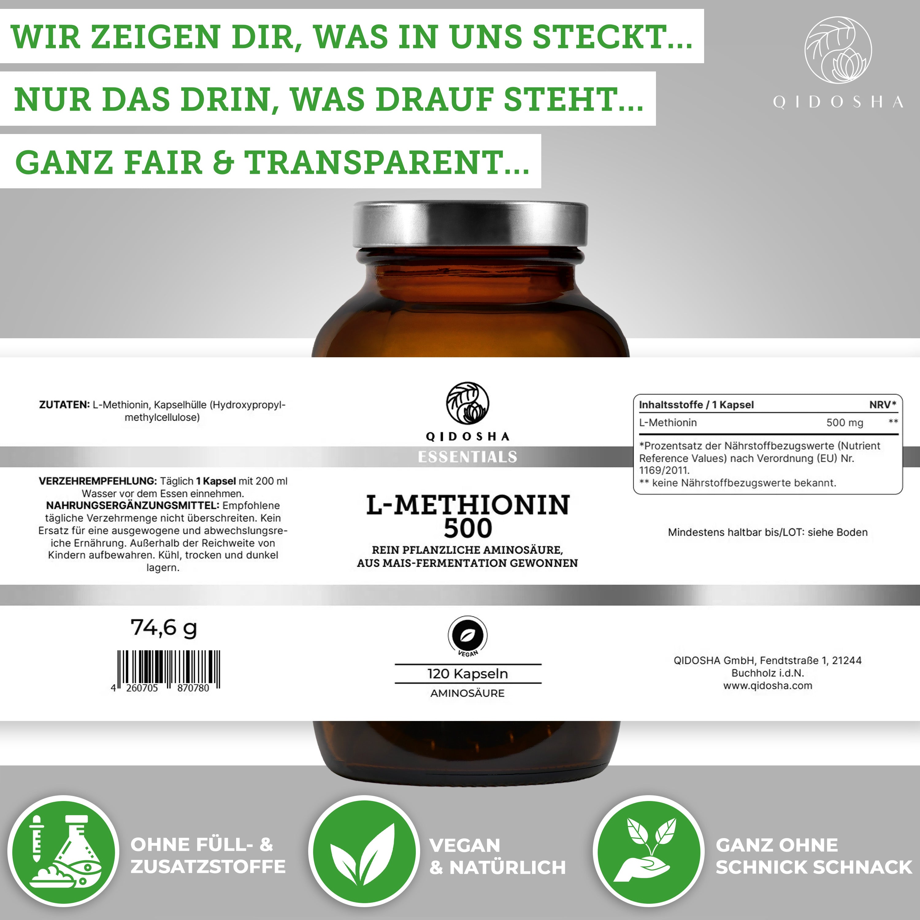 Dunkelbraunes Glas mit silbernem Deckel von QIDOSHA ESSENTIALS, L-Methionin 500, vegan, laborgeprüft, 120 Kapseln, rein pflanzlich, ohne Füllstoffe, hergestellt in Deutschland.