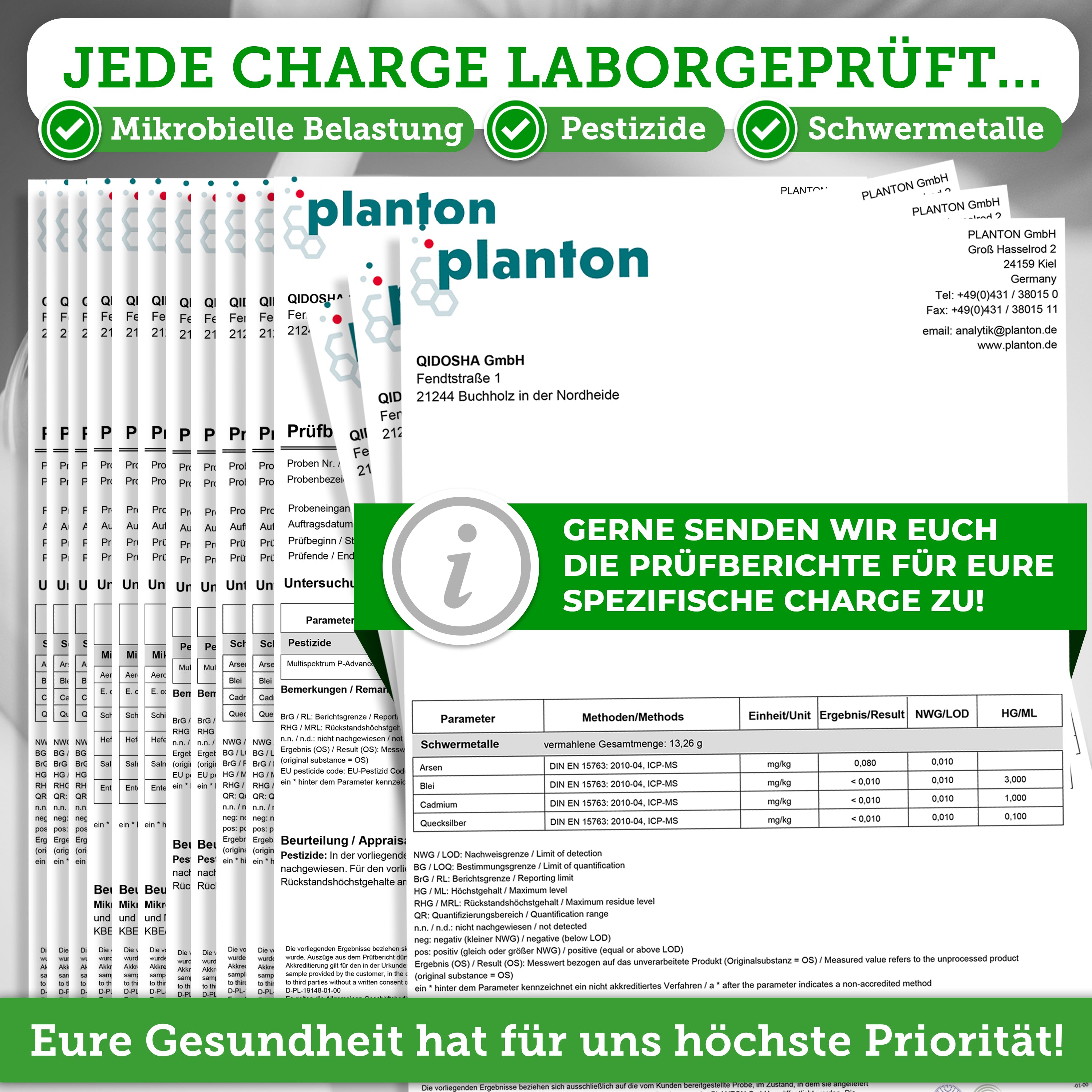 Unsere Produkte werden durch externe Labore u.a. auf mikrobielle Belastung, Schwermetalle, Pestizide und Wirkstoffgehalt geprüft.